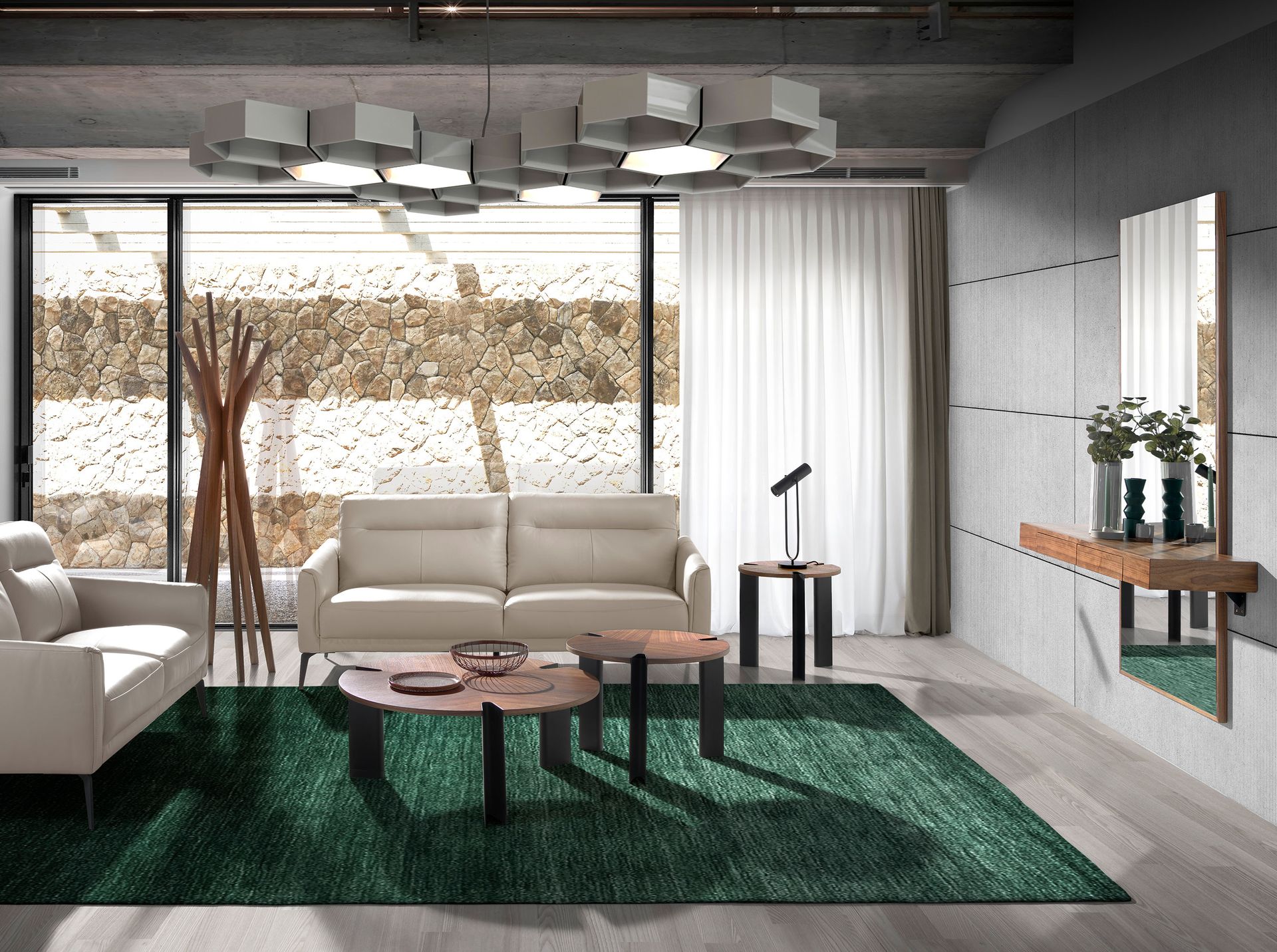 Тумба для прихожей с настенным зеркалом и консолью из шпона орехового дерева с двумя выдвижными ящиками.