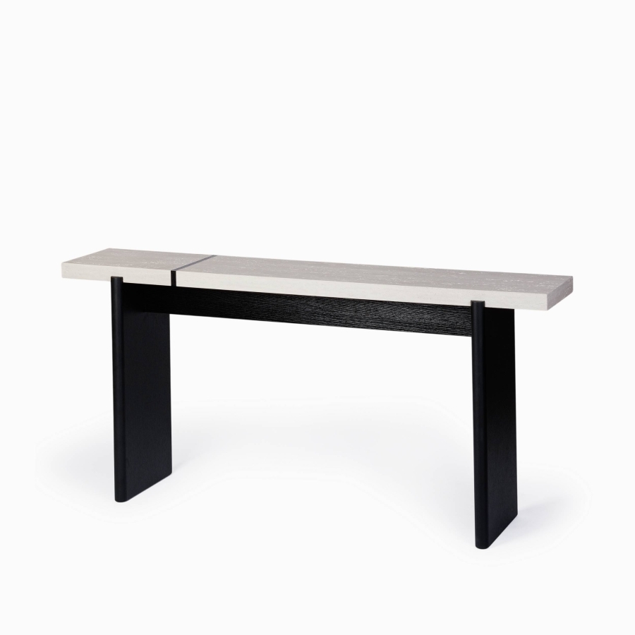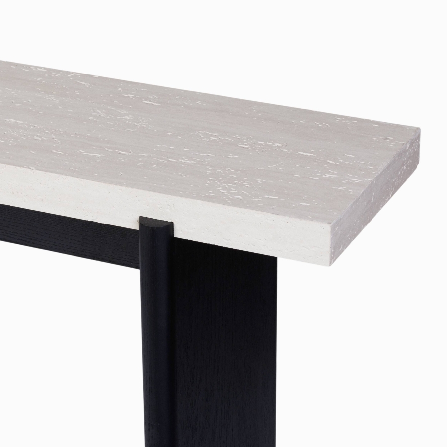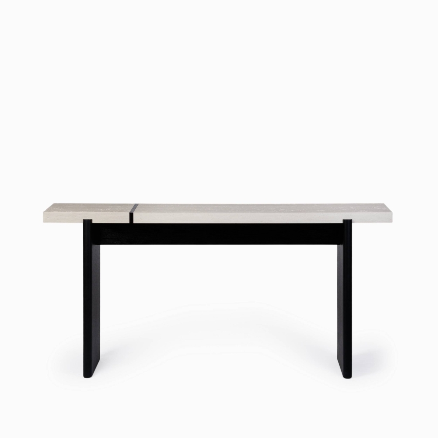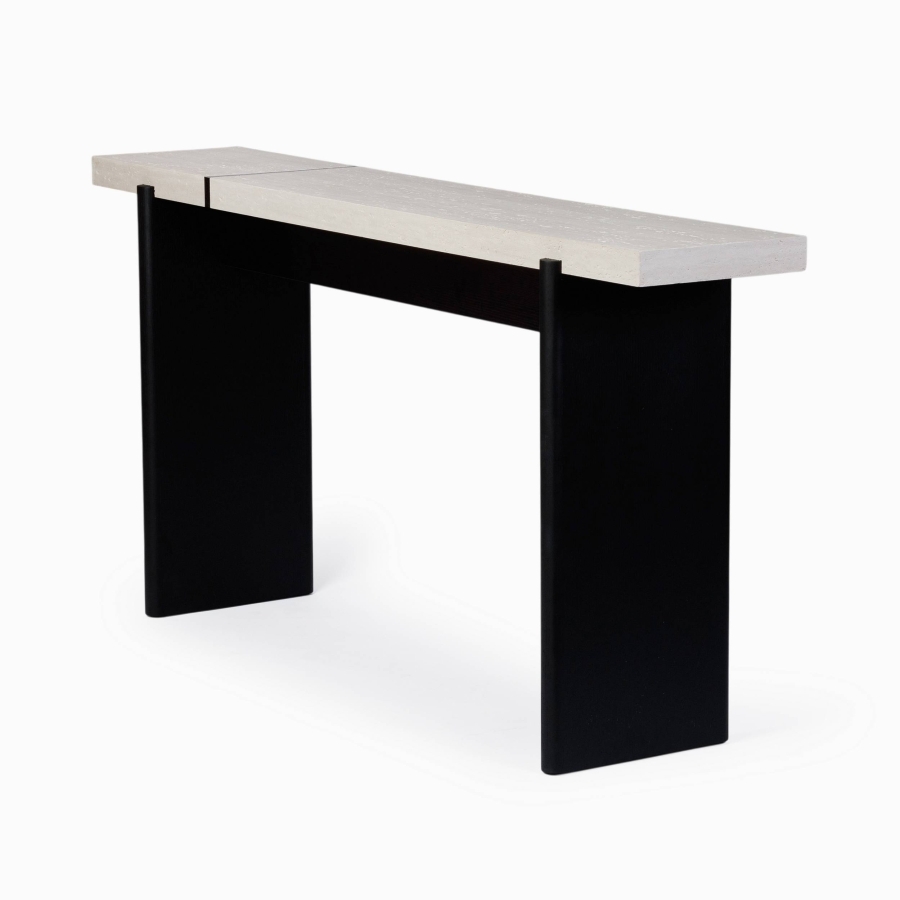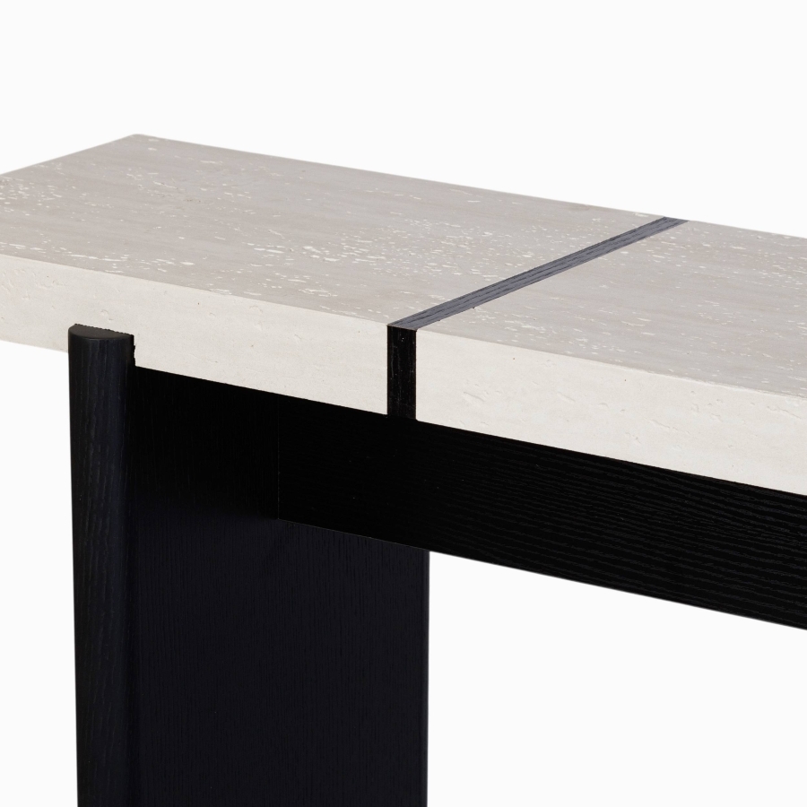 Консоль выполнена в современном стиле, сочетая черный каркас и шпон черного дуба с белой столешницей, что придаёт ей изысканный вид. Столешница с имитацией известняка не только выглядит стильно, но и устойчива к повреждениям, что делает её идеальной для повседневного использования.