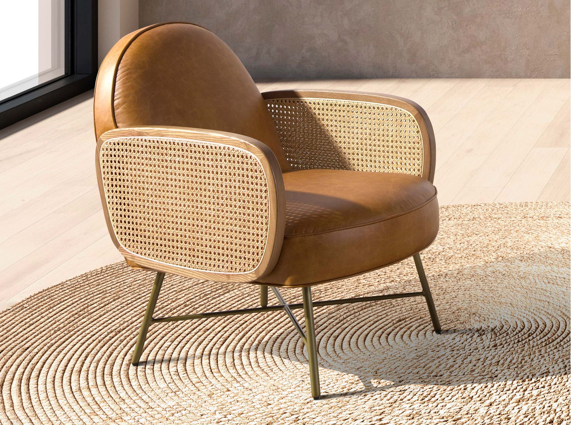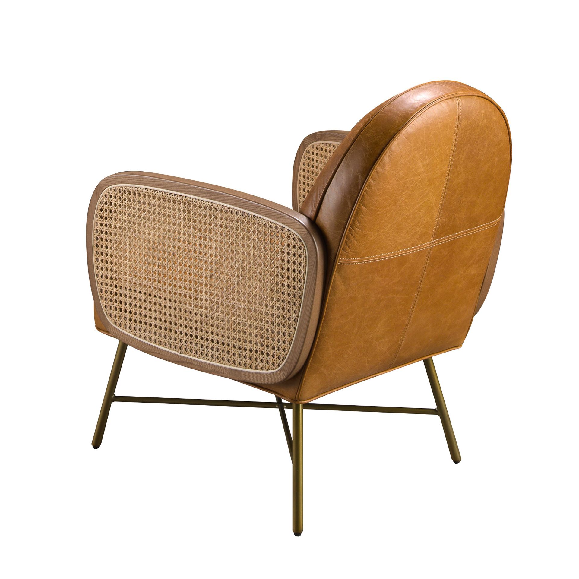 Кресло с подлокотниками в современном дизайне с сиденьем и спинкой, обитыми коричневой воловьей кожей. Это кресло представляет собой идеальное сочетание дизайна и комфорта, как благодаря ротанговым деталям, так и полированным ножкам из нержавеющей стали золотистого цвета.