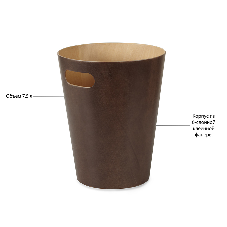 Материал: бук, тополь. Объем: 7,5 л. Размеры: диаметр верха – 22,9 см; диаметр низа – 16,3 см; высота – 27,9 см. Цвет: эспрессо. Дизайн: Henry Huang.