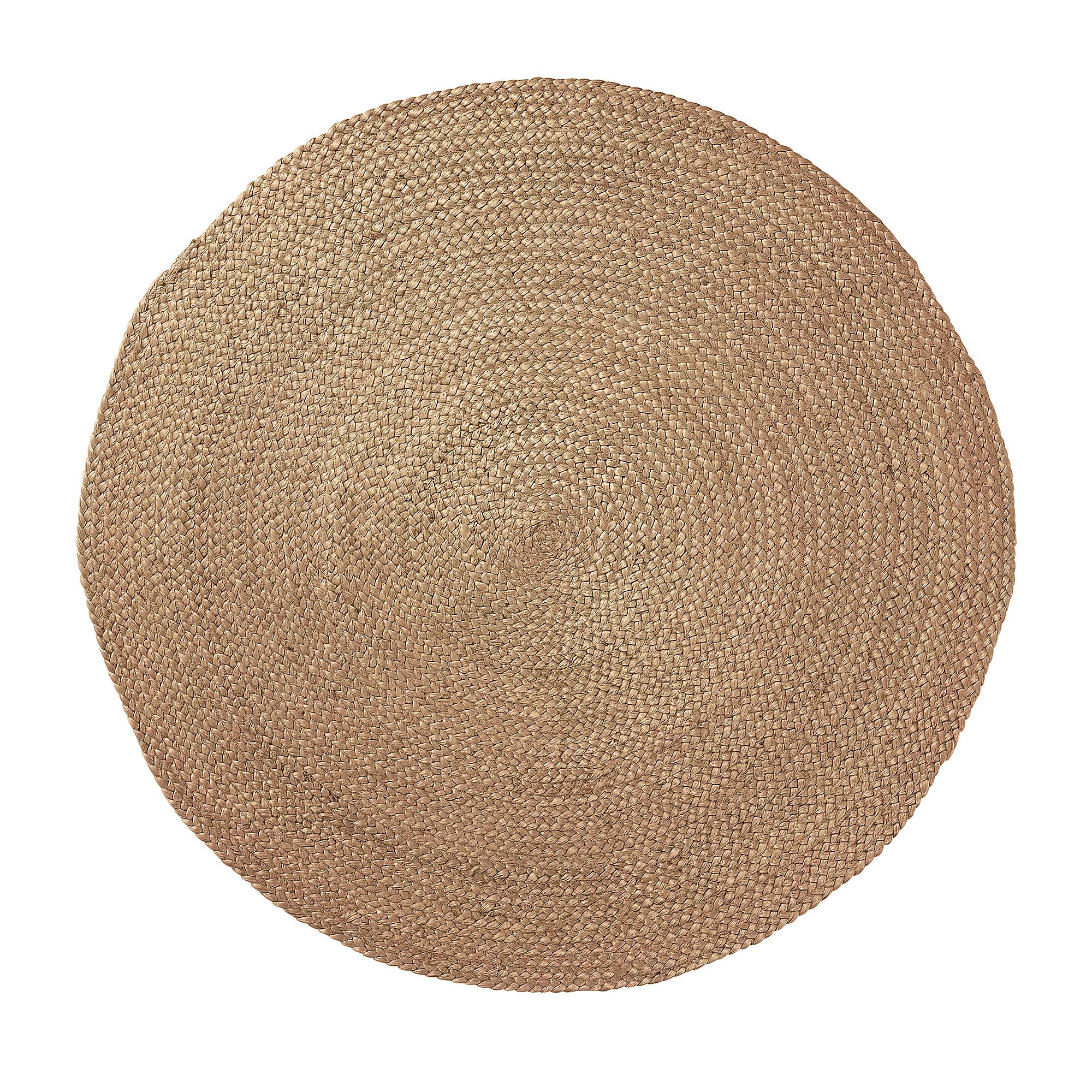 Ковер круглый. Он полностью сплетен из джута с круговым рисунком.
