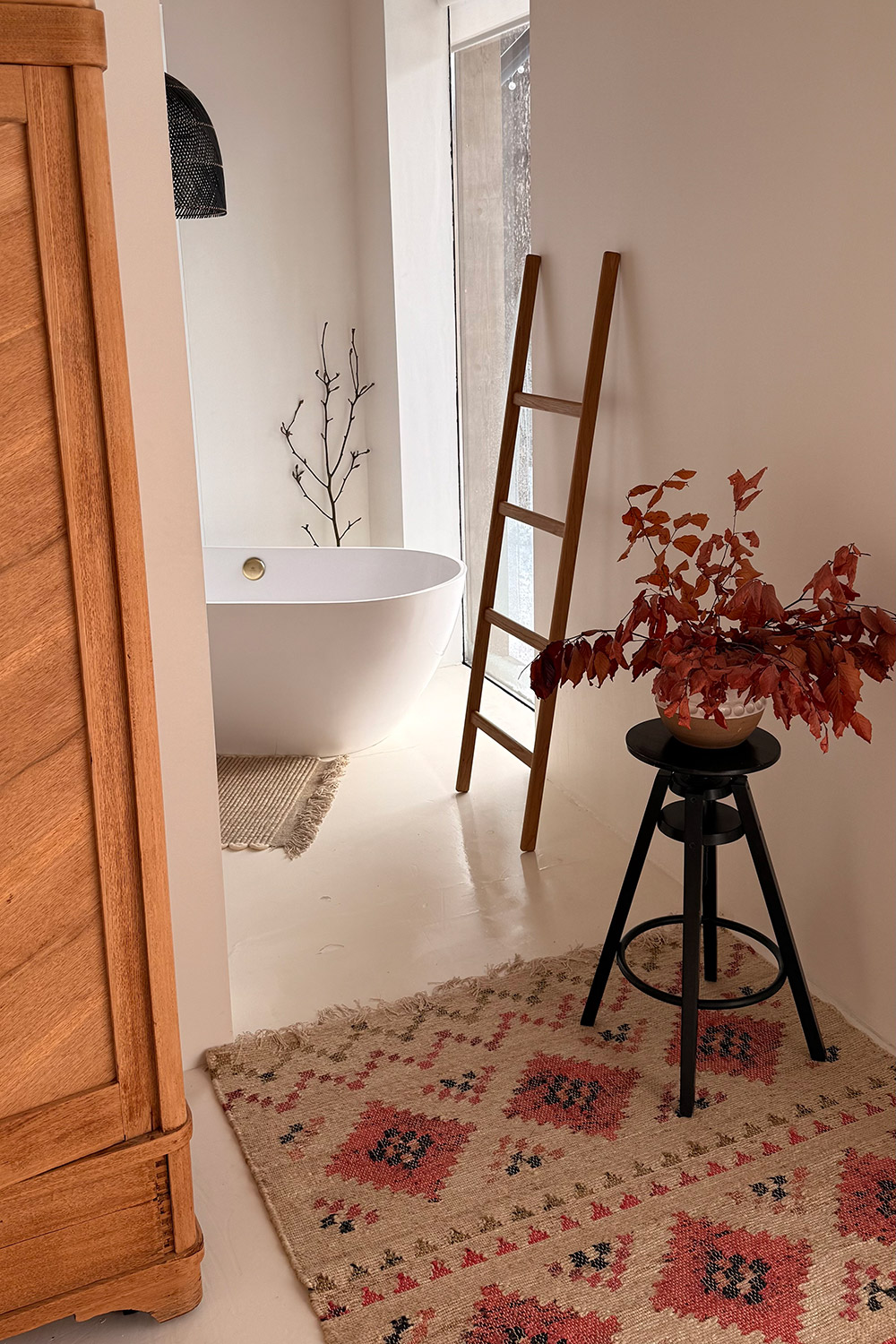- Ковер из шерсти с добавлением хлопка хорошо сохраняет тепло и обладает звукоизоляционными свойствами, обеспечивая в помещении комфортную атмосферу.