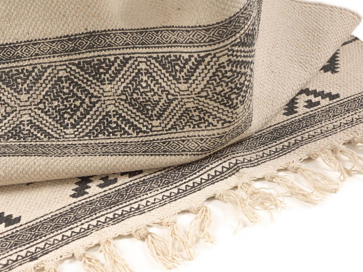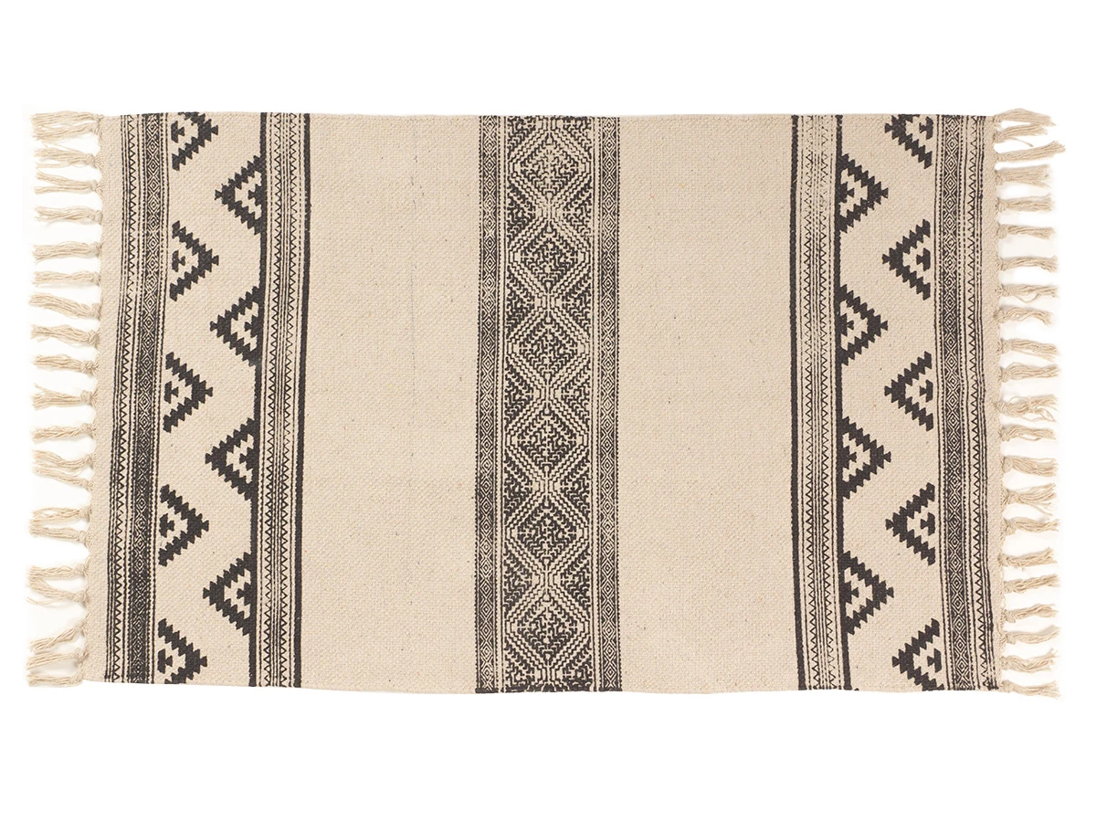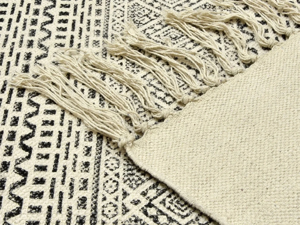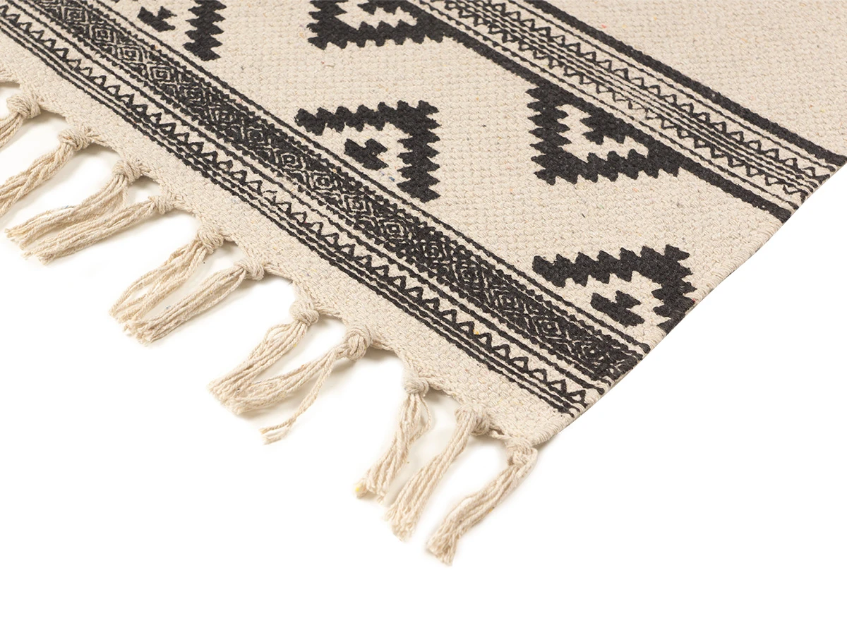Пригоден как для домашних локаций, так и для зон с высокой проходимостью, например, для прихожей, коридора, лобби, лаундж-зоны. Привлекательный дизайн модели обеспечивают трендовые спокойные оттенки, акцентные элементы — геометрические узоры, бахрома, фактурная выразительность материала.