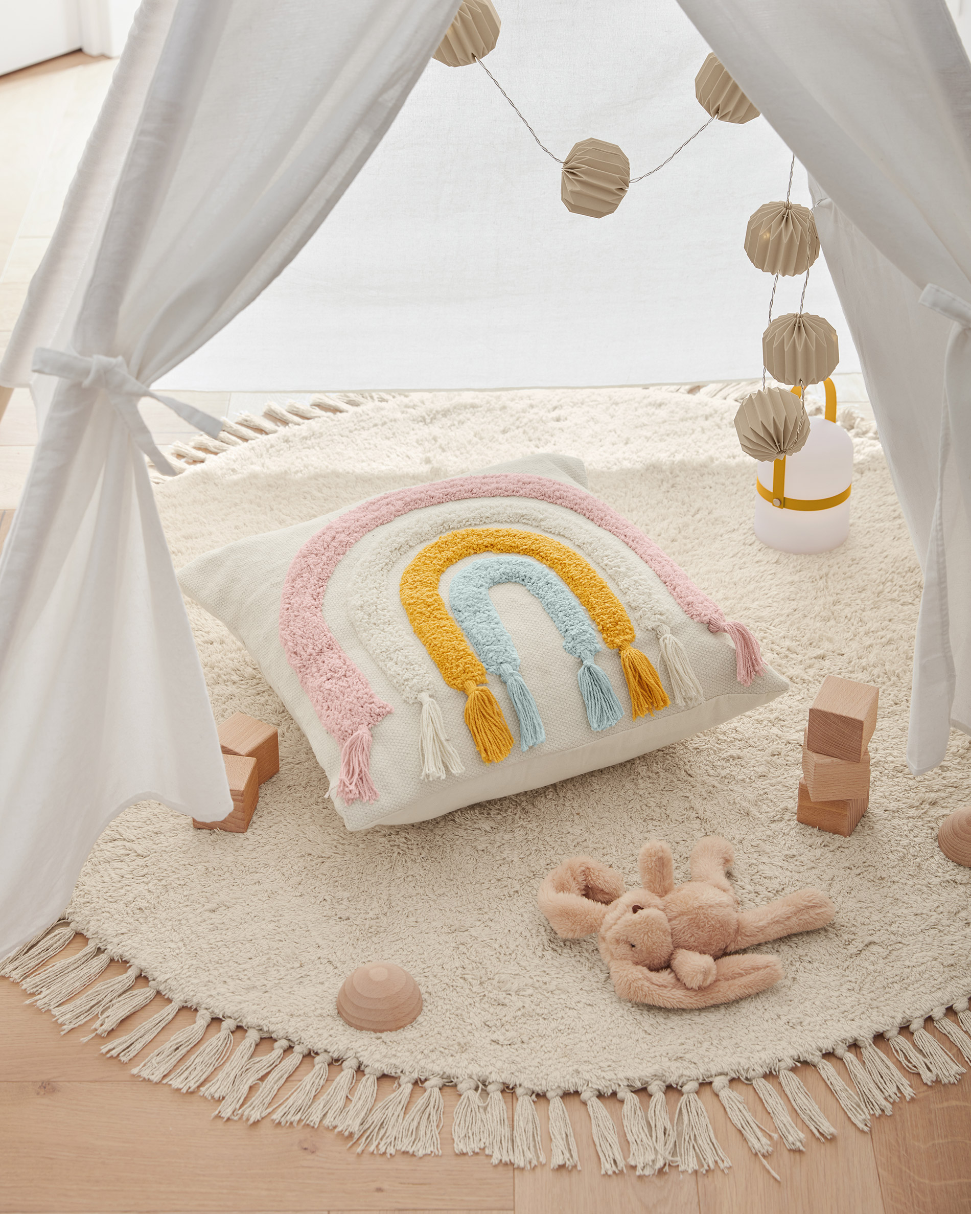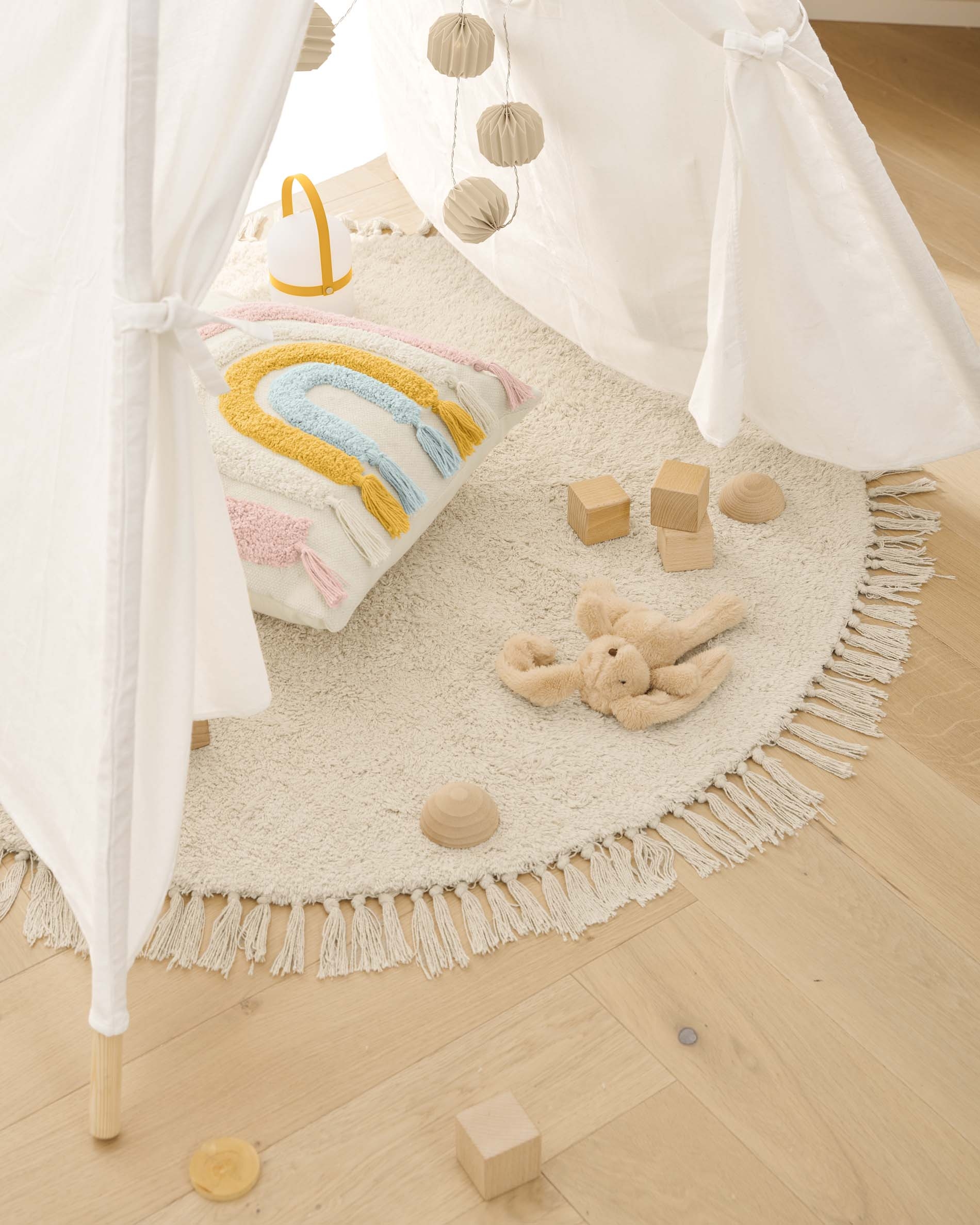 Ковер круглой формы. Он соткан из 100 % хлопковой нити, поэтому подходит для эксплуатации в детской комнате. Цвет натуральный, бело-серый.