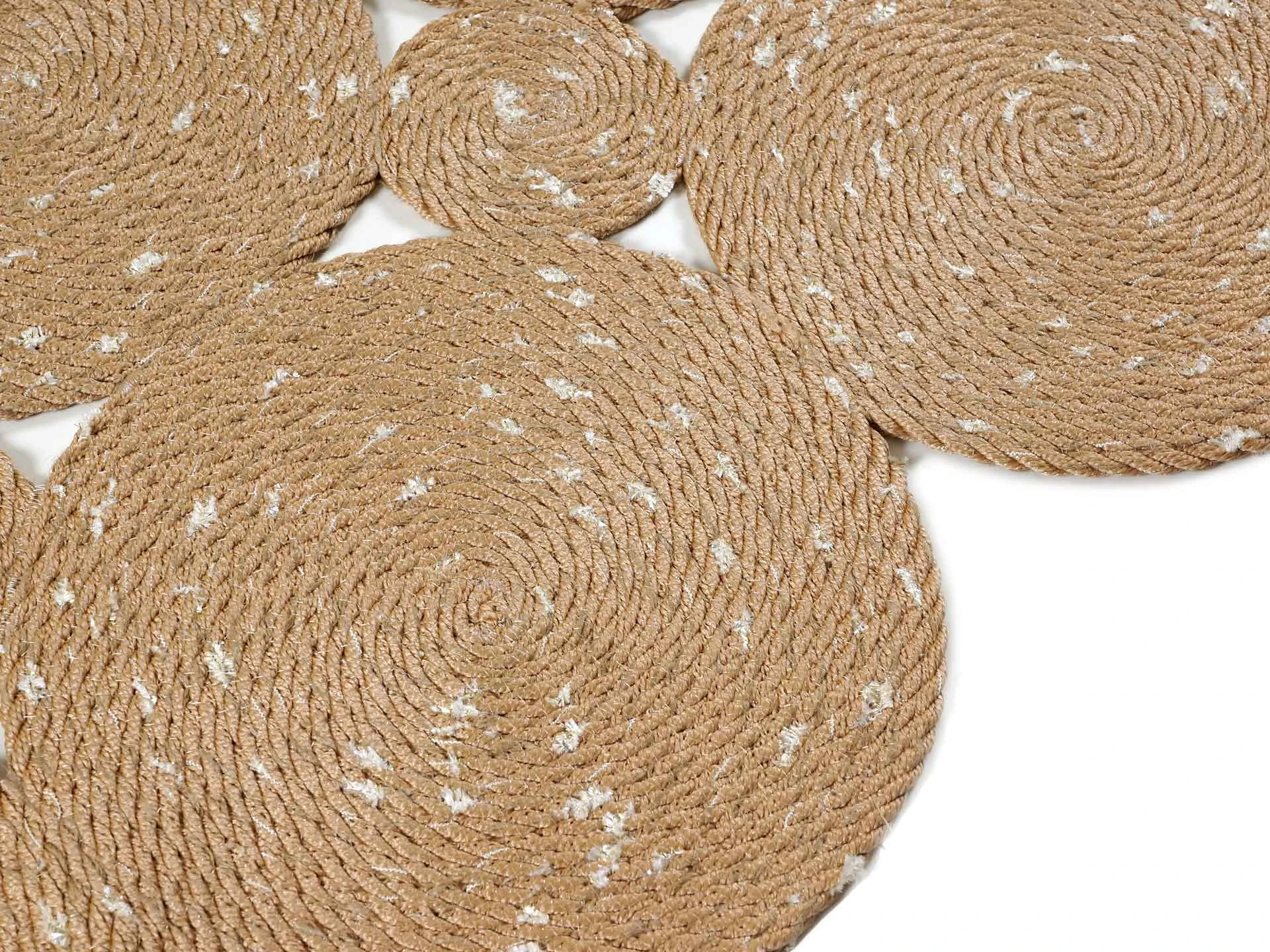 Ковры PATNA имеют оригинальную архитектуру: состоят из отдельных кругов разных диаметров, связанных между собой. Такой выразительный внешний вид станет акцентом в гостиной, прихожей, спальне, детской, кабинете, творческой мастерской. Сочетание джута и полипропилена обеспечивает изделиям долгий срок службы, простоту в обслуживании. Ковры в экостиле можно гармонично сочетать с любыми предметами мебели и декора, также допустимо использовать в качестве настенных декораций.