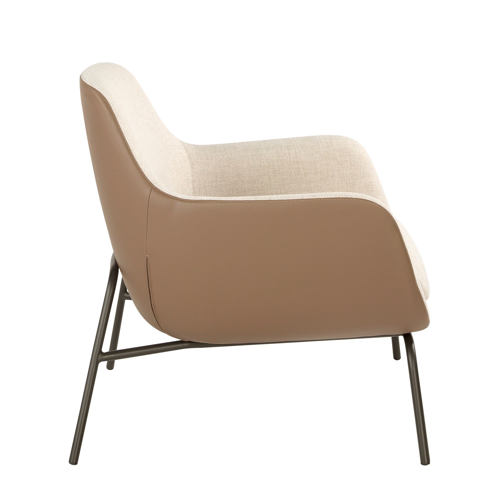 Кресло обито кремовой тканью. Спинка обтянута коричневой экокожей. Черная конструкция ножек из нержавеющей стали.