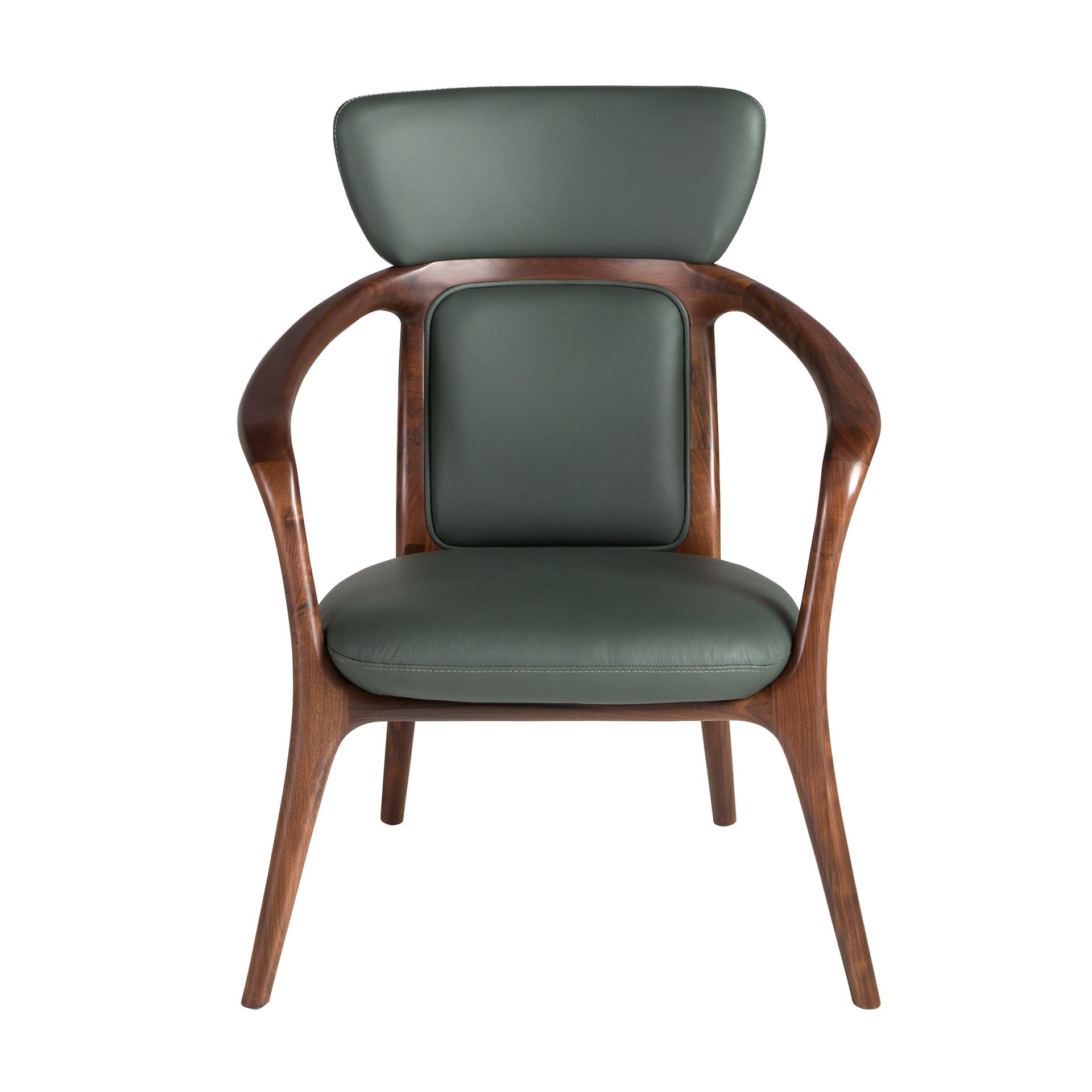 Кресло с современными подлокотниками, сиденьем и спинкой, обитыми темно-зеленой искусственной кожей. Благодаря своему стилю и деревянным ножкам цвета ореха, это кресло представляет собой идеальное сочетание дизайна и комфорта.