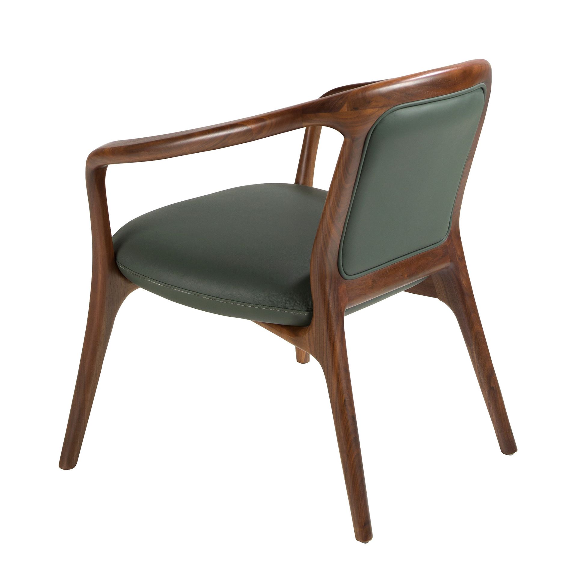Современное дизайнерское кресло с подлокотниками, сиденьем и спинкой, обитыми темно-зеленой искусственной кожей. Благодаря своему стилю и деревянным ножкам цвета ореха, это кресло представляет собой идеальное сочетание дизайна и комфорта.