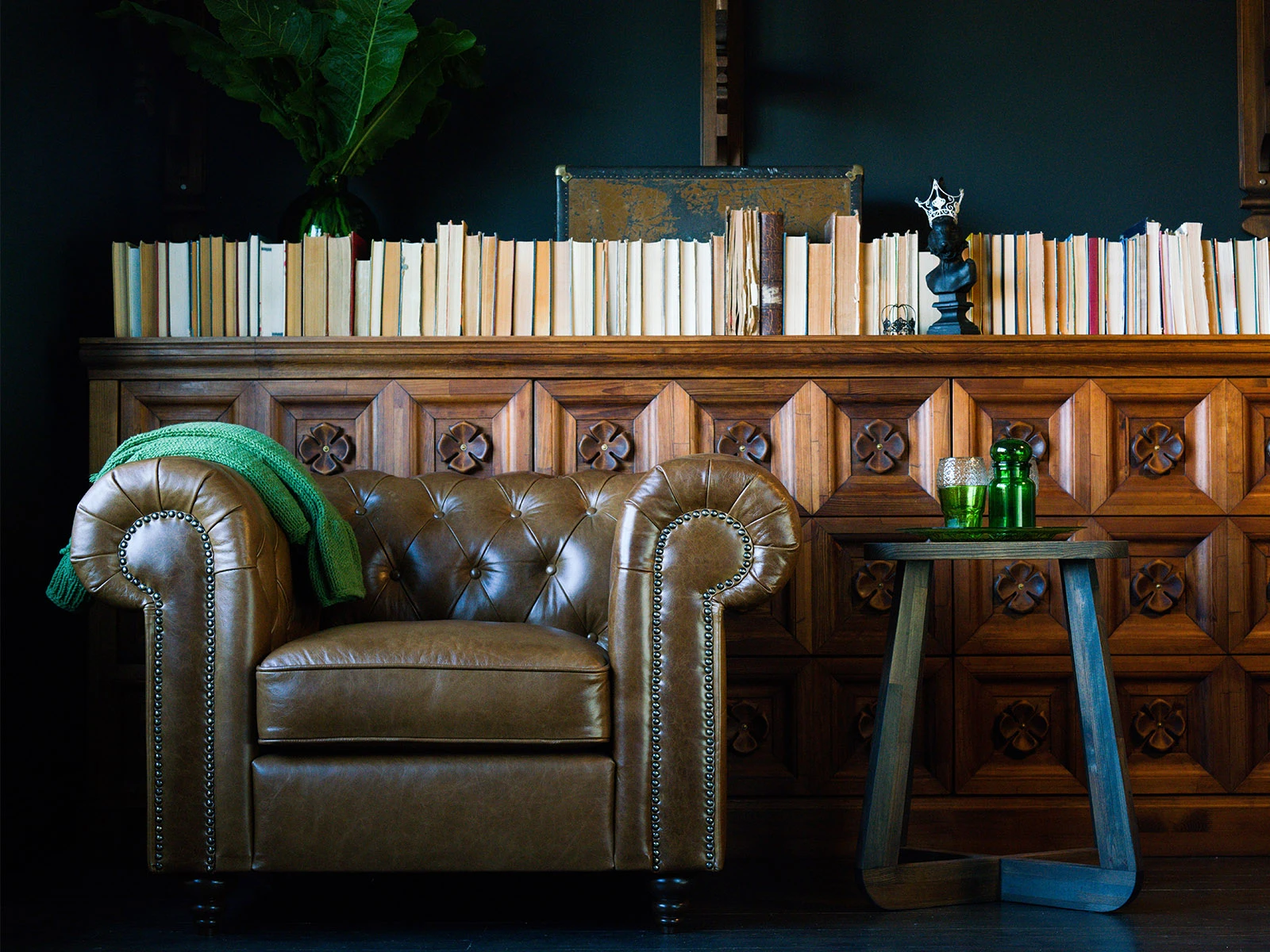Классическое кресло. Благодаря наклону мягкой спинки кресло Chester Classic считается креслом повышенной комфортности. Кресло изготовлено из натуральной, классической кожи с эффектом пулл-ап (кожа светлеет в местах натяжения), что придает винтажный облик изделию. Подлокотники украшены декоративными гвоздиками под состаренную бронзу.