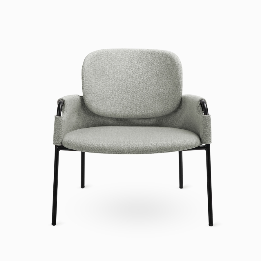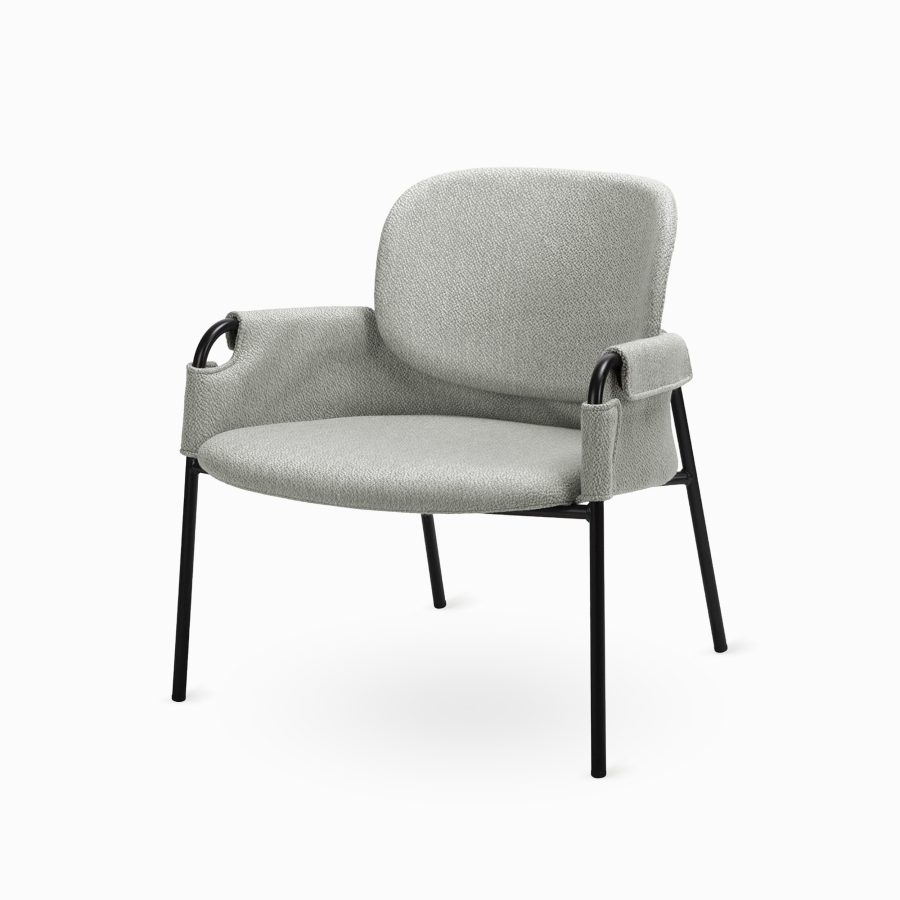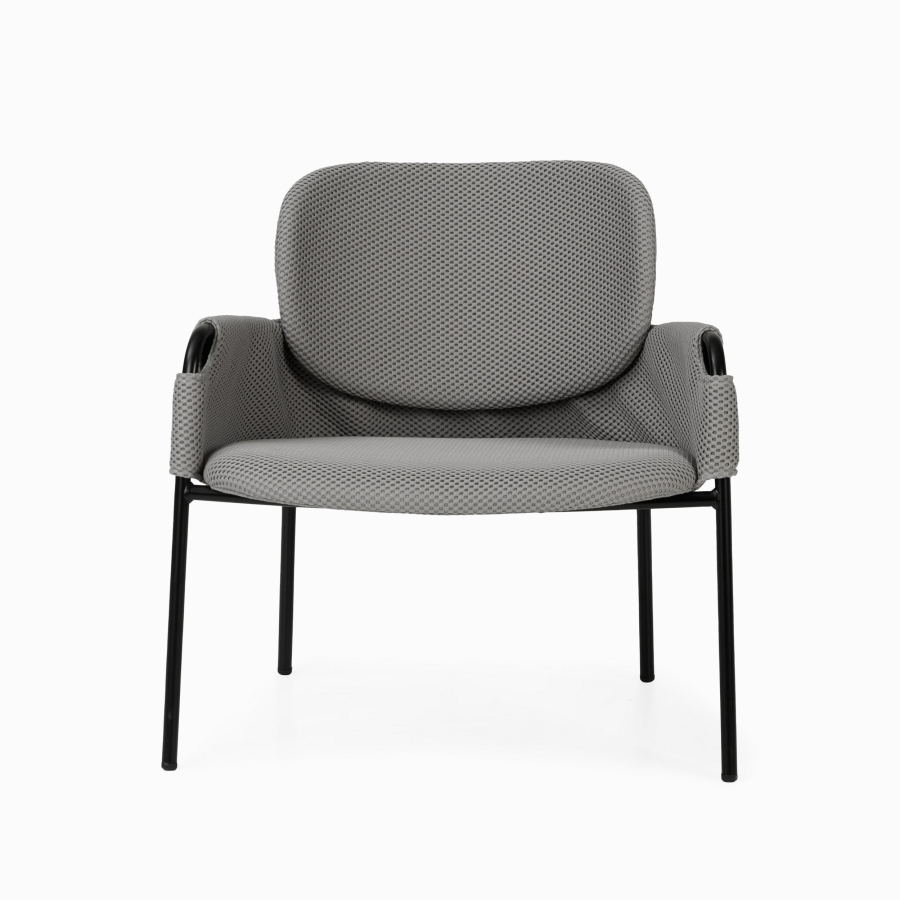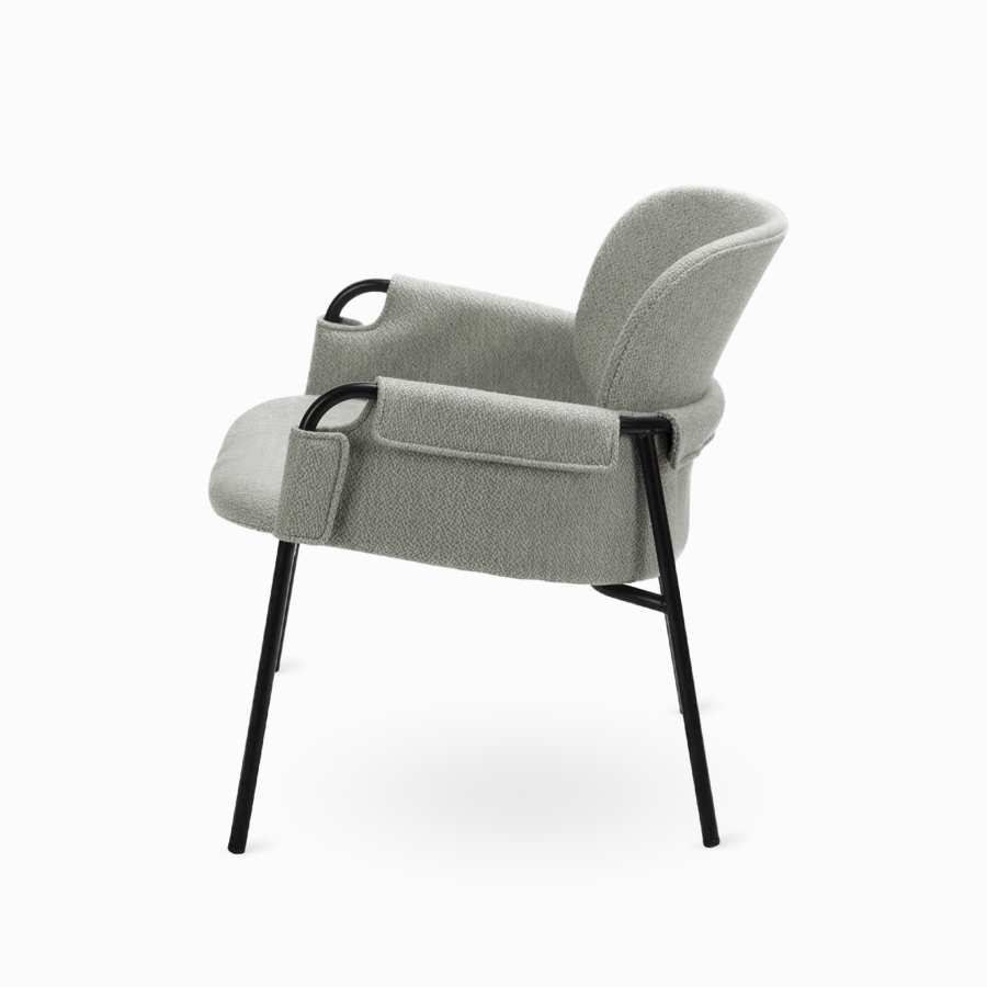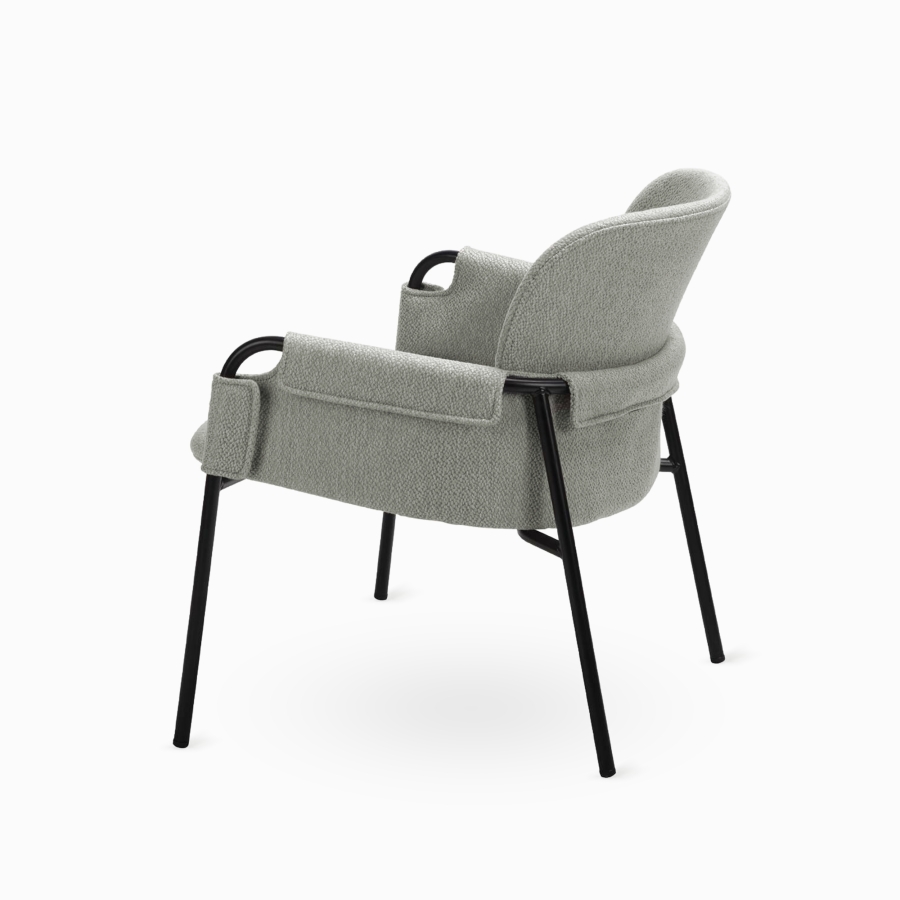 Его особенностью является оригинальный металлический каркас чёрного цвета, образующий основу сиденья и подлокотников, создавая лёгкий и воздушный силуэт. Мягкие элементы кресла — сиденье, спинка и подлокотники — обтянуты фактурной тканью в нейтральных оттенках.