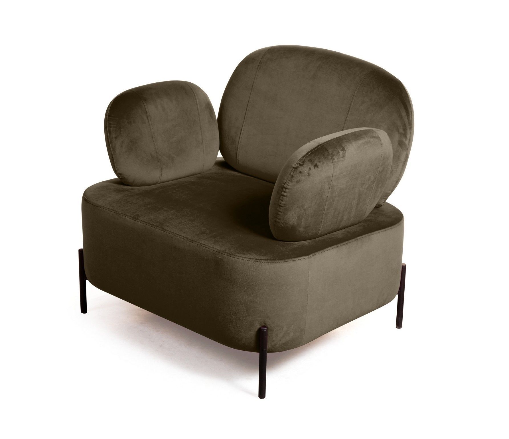 Компактное кресло подойдет для помещения любого размера. Ножки и внешний каркас кресла выполнены из металла, окрашенного на выбор в черный или белый цвет, который выгодно контрастирует с обивкой мягкого сиденья.