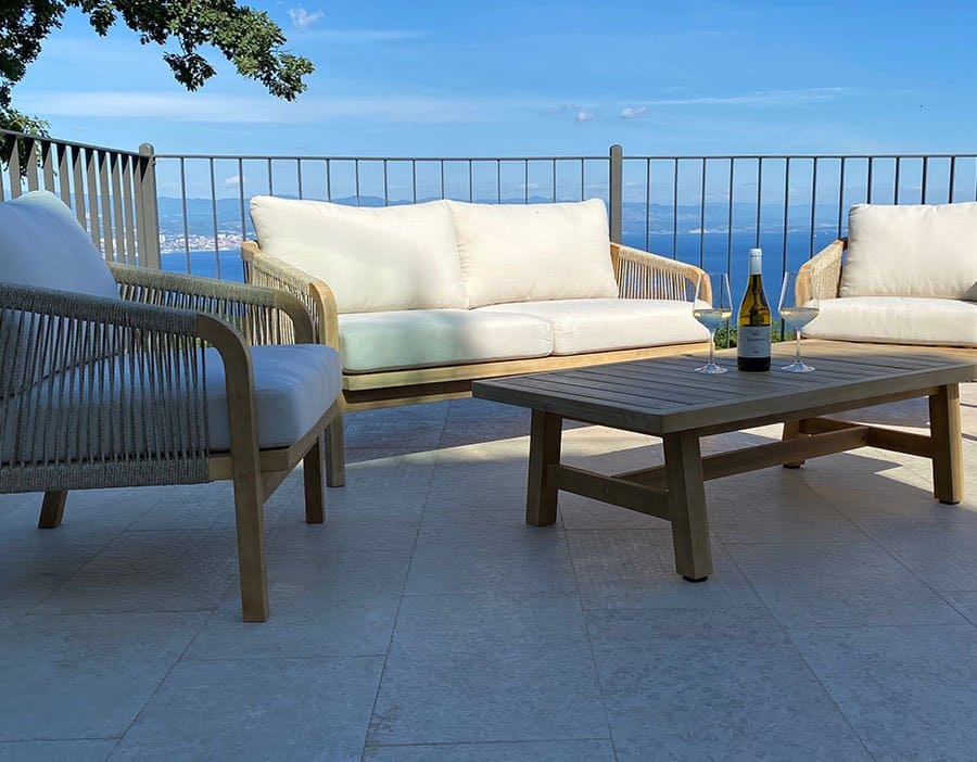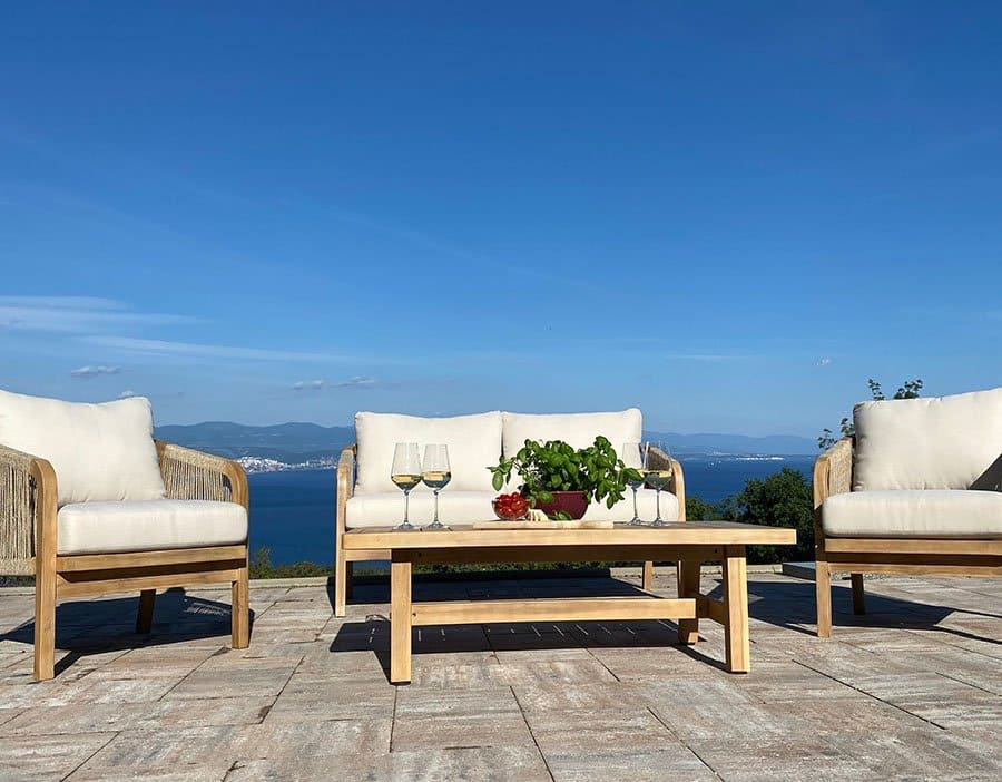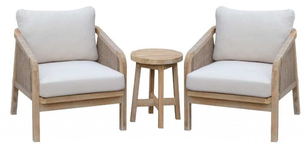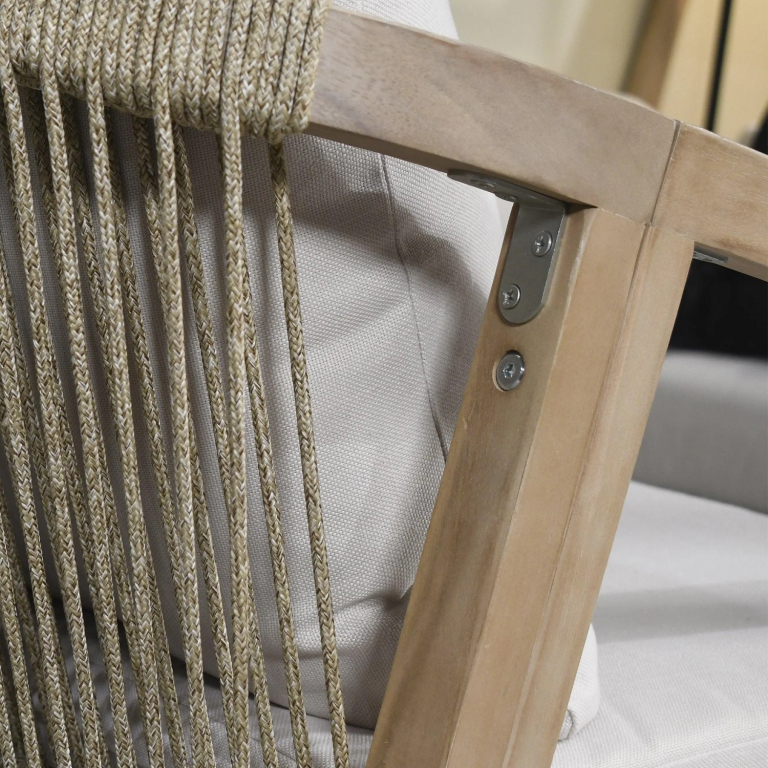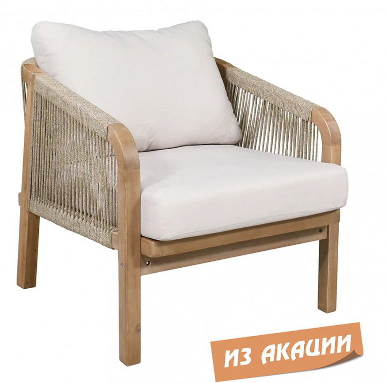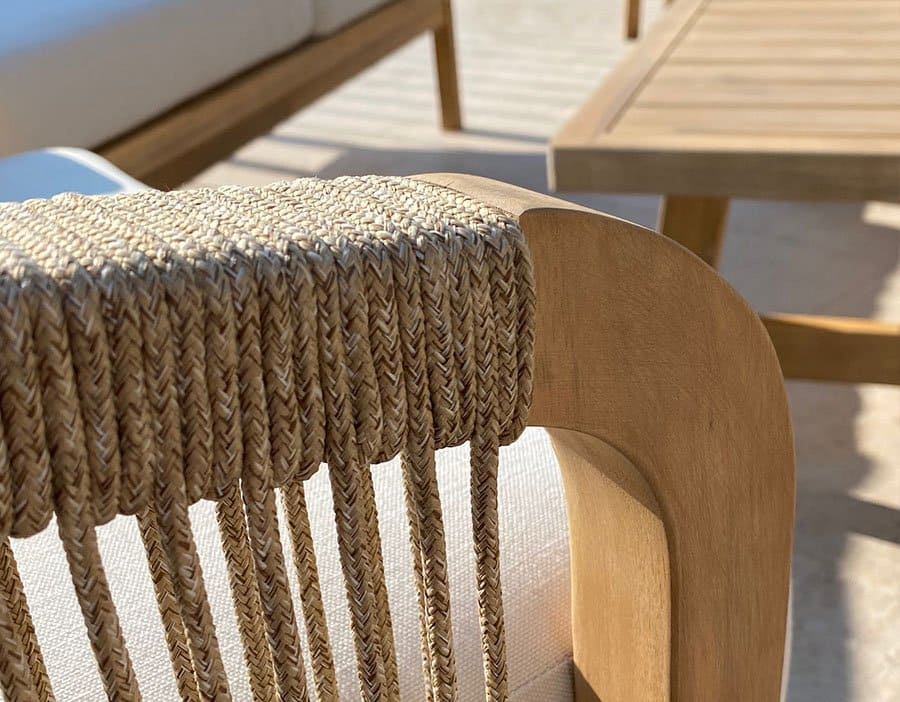 Лаунж-кресло, в котором природная фактура дерева звучит как элемент современного декора. Каркас из акации дарит ощущение основательности, а плетение роуп добавляет лёгкость и «воздух» — спинка и подлокотники выглядят графично и не утяжеляют пространство. Натуральный оттенок древесины в паре с бежевыми подушками легко дружит и с минимализмом, и с тёплым средиземноморским настроением.