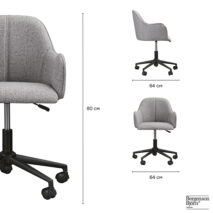 Материалы: 100% полиэстер, фанера, пенополиуретан, железо. Максимальная нагрузка: 130 кг. Размеры: 64x64x80 см. Высота сиденья: максимальная 51 см, минимальная 42 см. Ширина сиденья: 44 см. Глубина сиденья: 41 см. Высота спинки: 37 см. Ширина спинки: 40 см. Максимальная нагрузка: 130 кг. Цвет: серый.