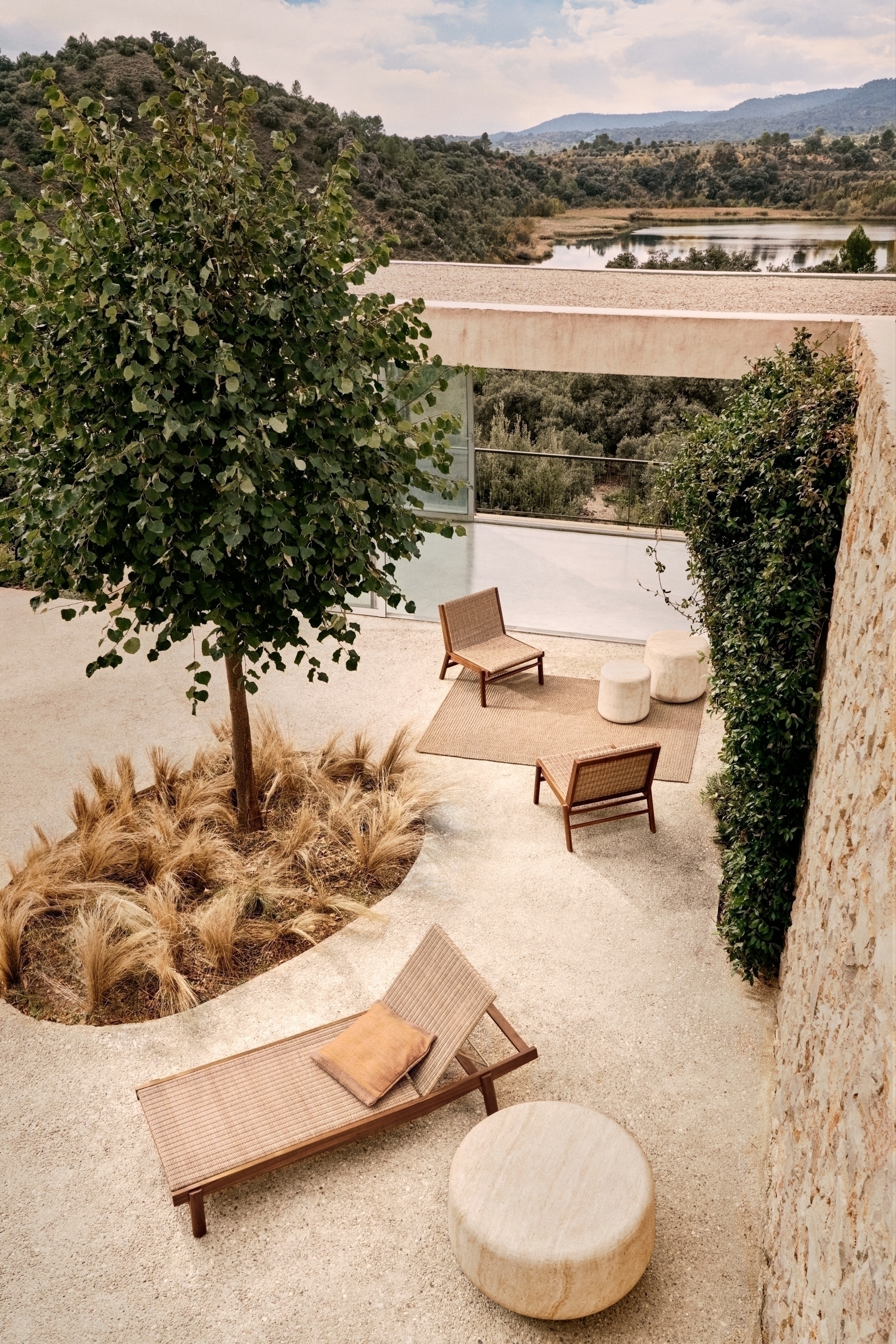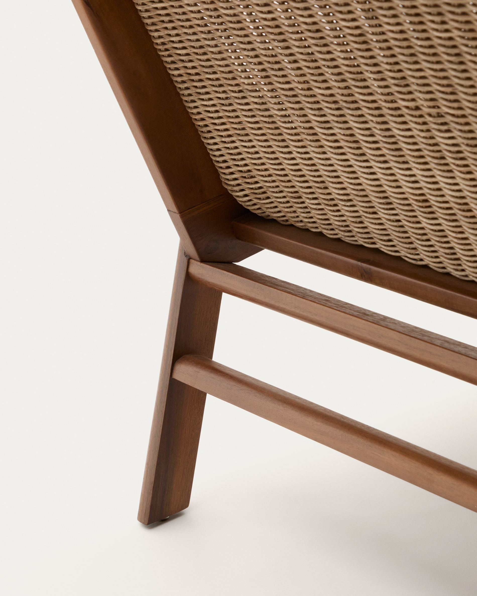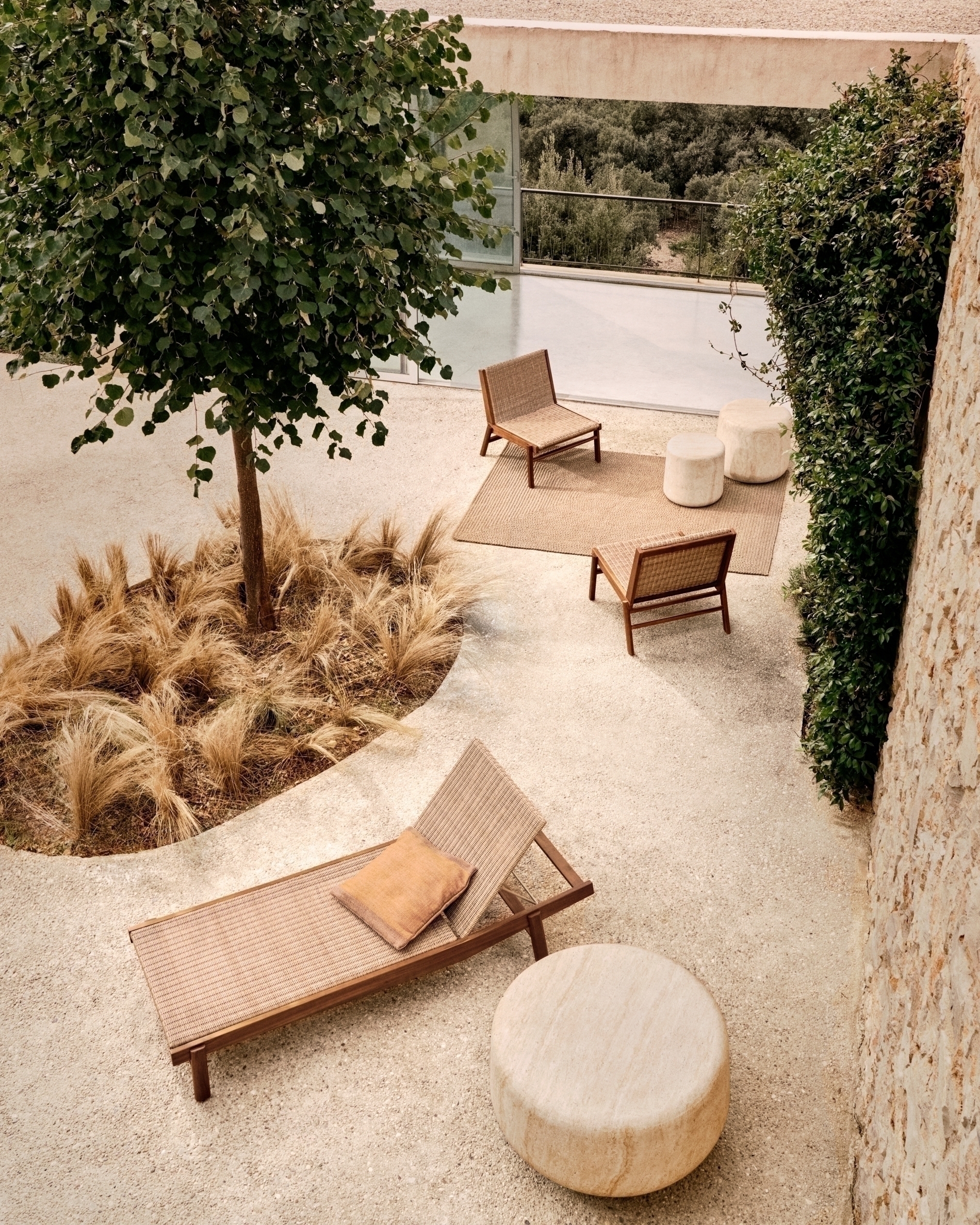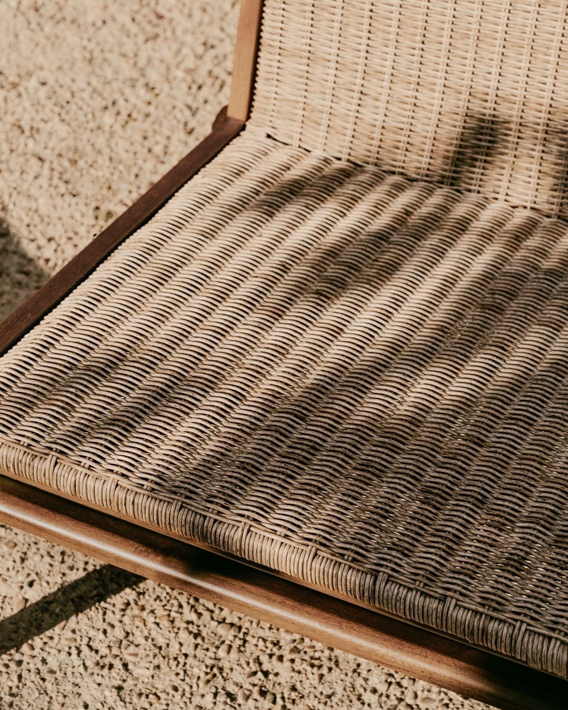 Сиденья и спинки, вручную сотканные из синтетического ротанга, визуально выглядят теплыми и изысканными, а также очень прочными и простыми в уходе. Этот материал специально разработан для использования на открытом воздухе, обеспечивая практичность без ущерба для эстетики. Структура включает полиуретановое покрытие на водной основе, а также оцинкованную железную конструкцию с порошковым покрытием, что обеспечивает отличную устойчивость к самым суровым условиям.