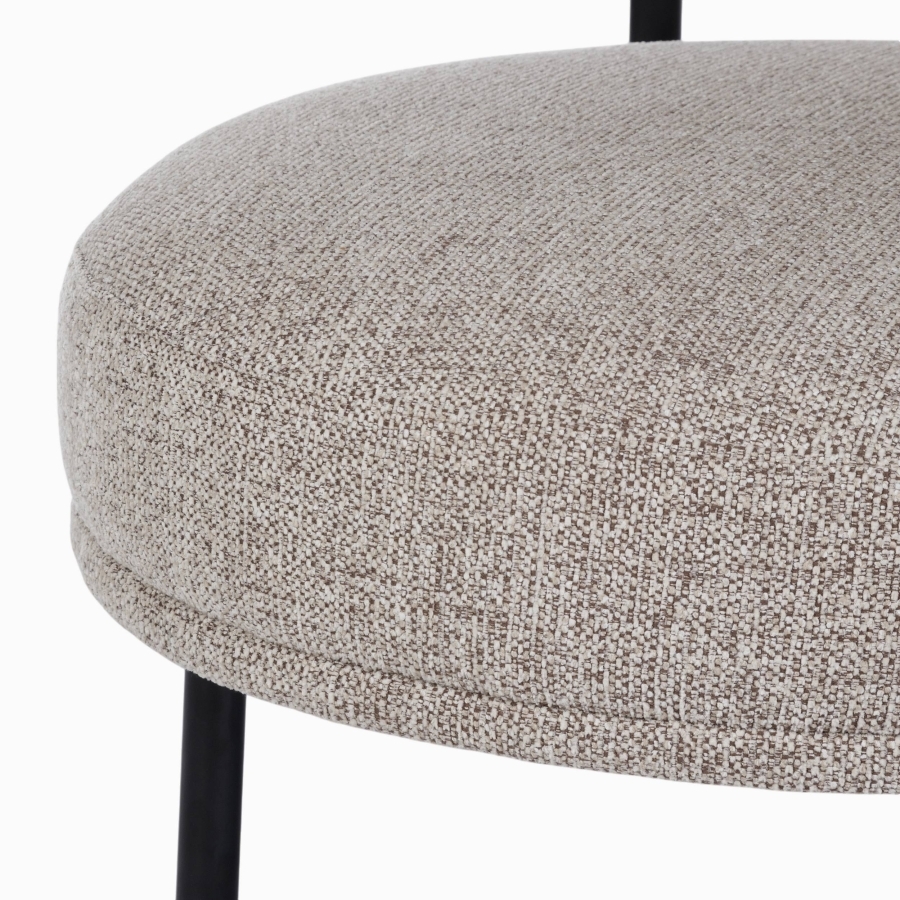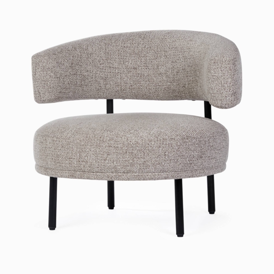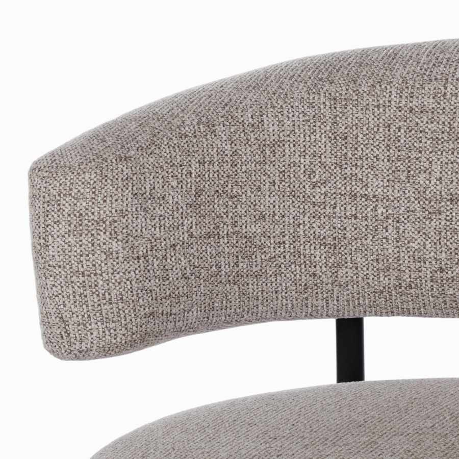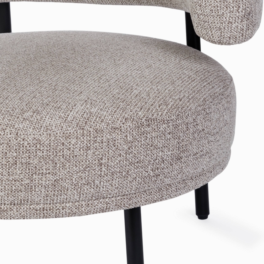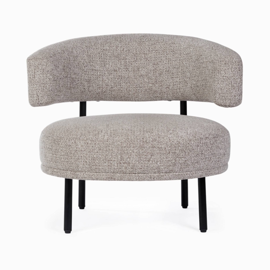 Округлая форма сиденья и спинки создаёт ощущение мягкости и комфорта. Кресло обито прочной тканью с меланжевым плетением в светло-сером оттенке. Особенностью модели является уникальная конструкция: сиденье и спинка не соединены, а словно парят над каркасом, что придаёт креслу воздушный и необычный вид.