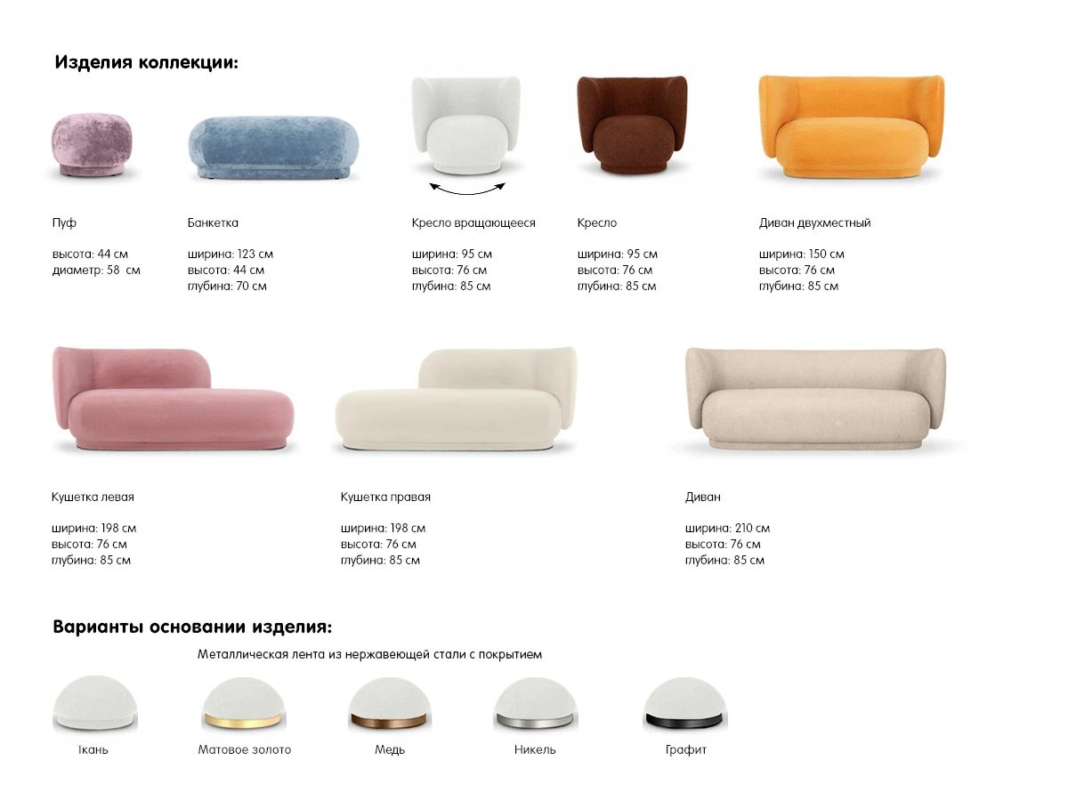 Коллекция диванов, кресел, кушеток, пуфов, дизайн которых сфокусирован на округлых мягких формах. Это и дань актуальным трендам, и стремление к позитивному «обволакивающему» пространству, располагающему к уютному отдыху. Смелые объемы, плавные линии привнесут в интерьер динамику, свежесть, пластичность. Закругленные элементы, фактурные обивки, естественные оттенки создают атмосферу комфорта и дружелюбного притяжения. Высокие спинки, плавно перетекающие в подлокотники, обеспечивают эргономичную поддержку и чувство безопасности, уединения.