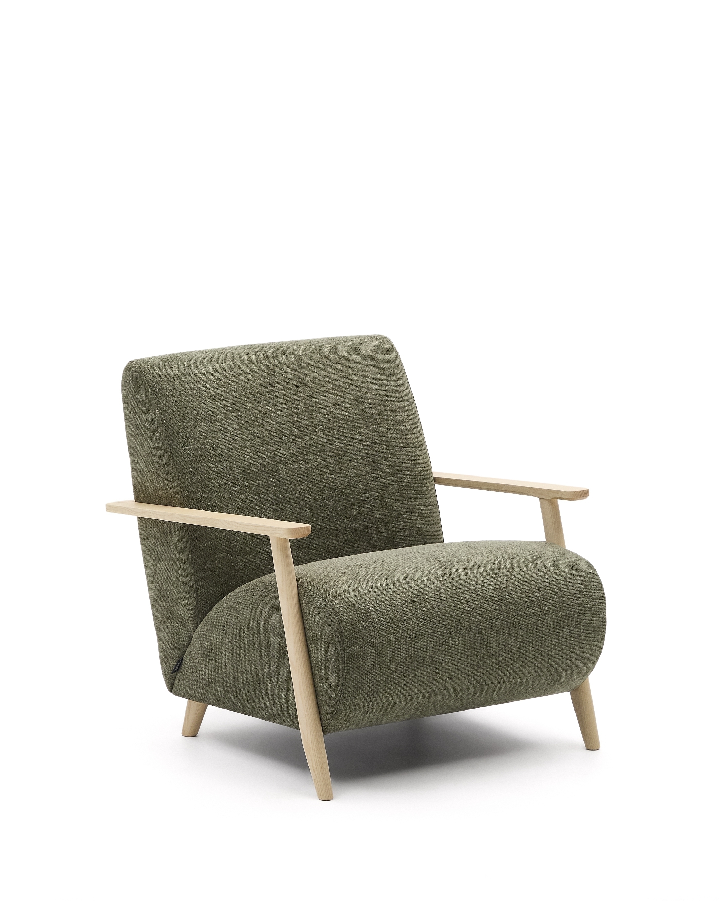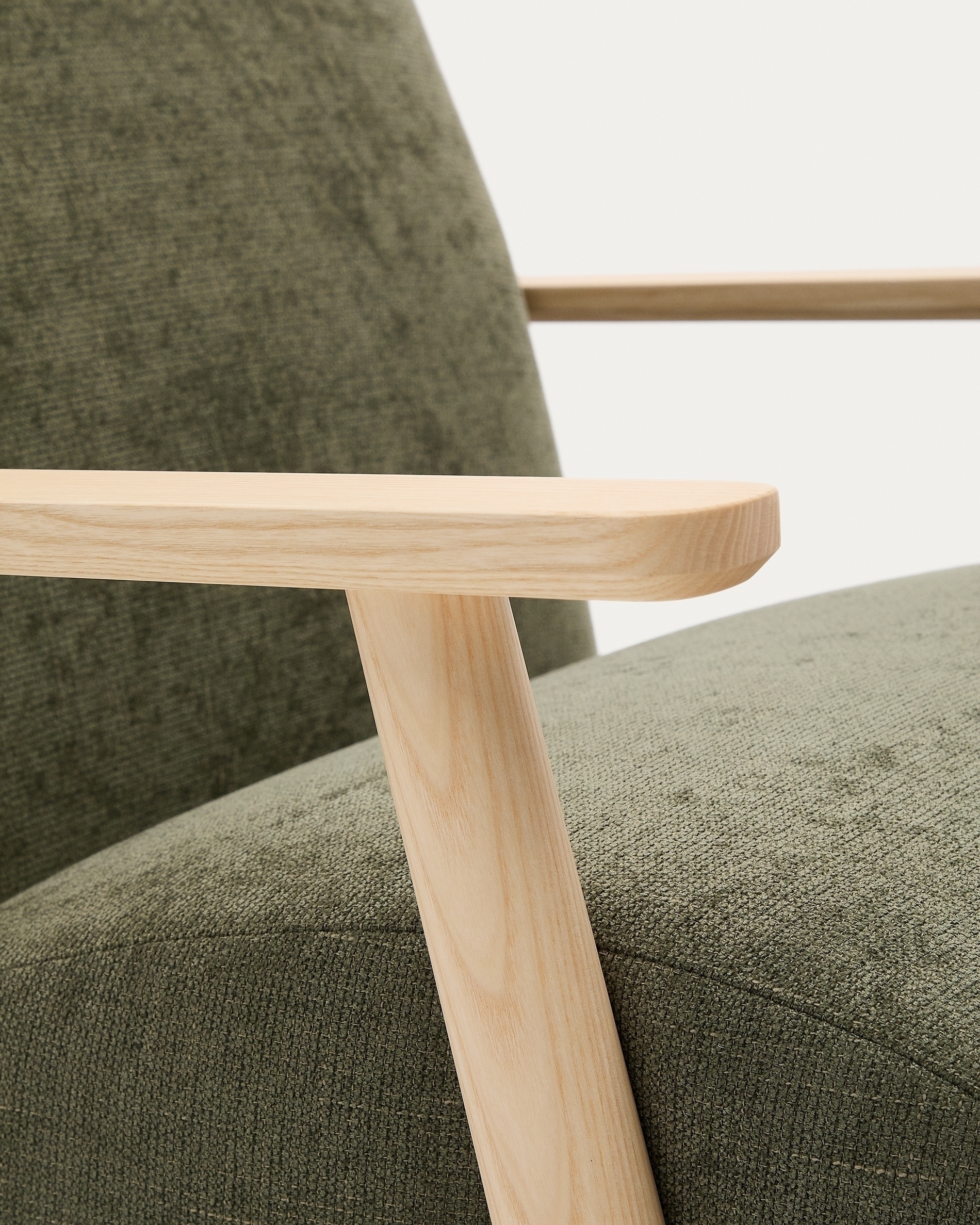 Дизайн этого кресла минималистский, в расслабленном стиле, который сочетается с открытой рамой из массива ясеня. Его сиденье и спинка заполнены пеной, что придает ему средне-мягкую посадку, а его рама изготовлена из сосны и ДСП E0.