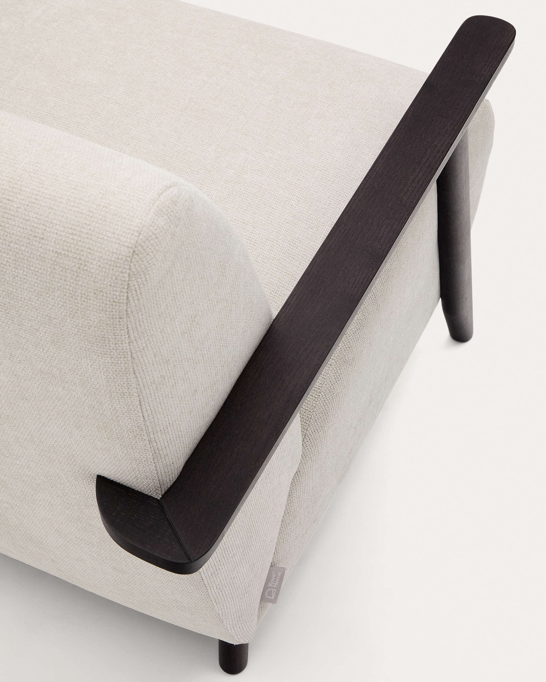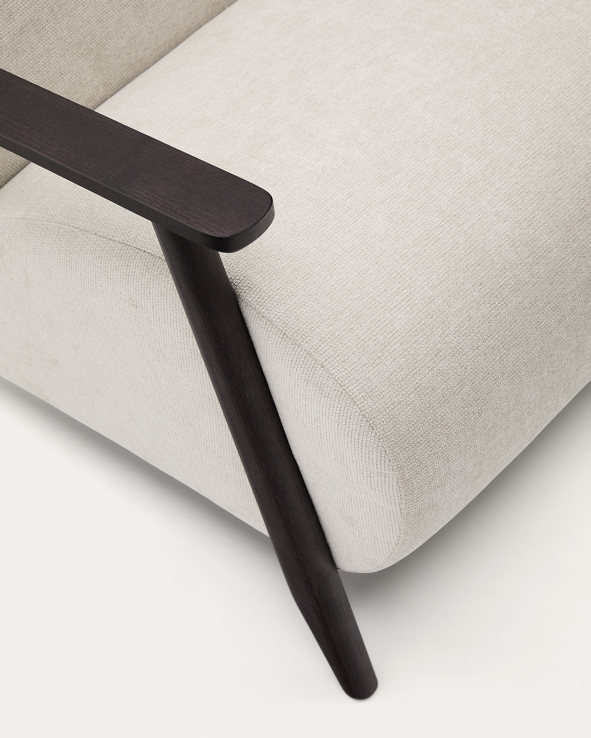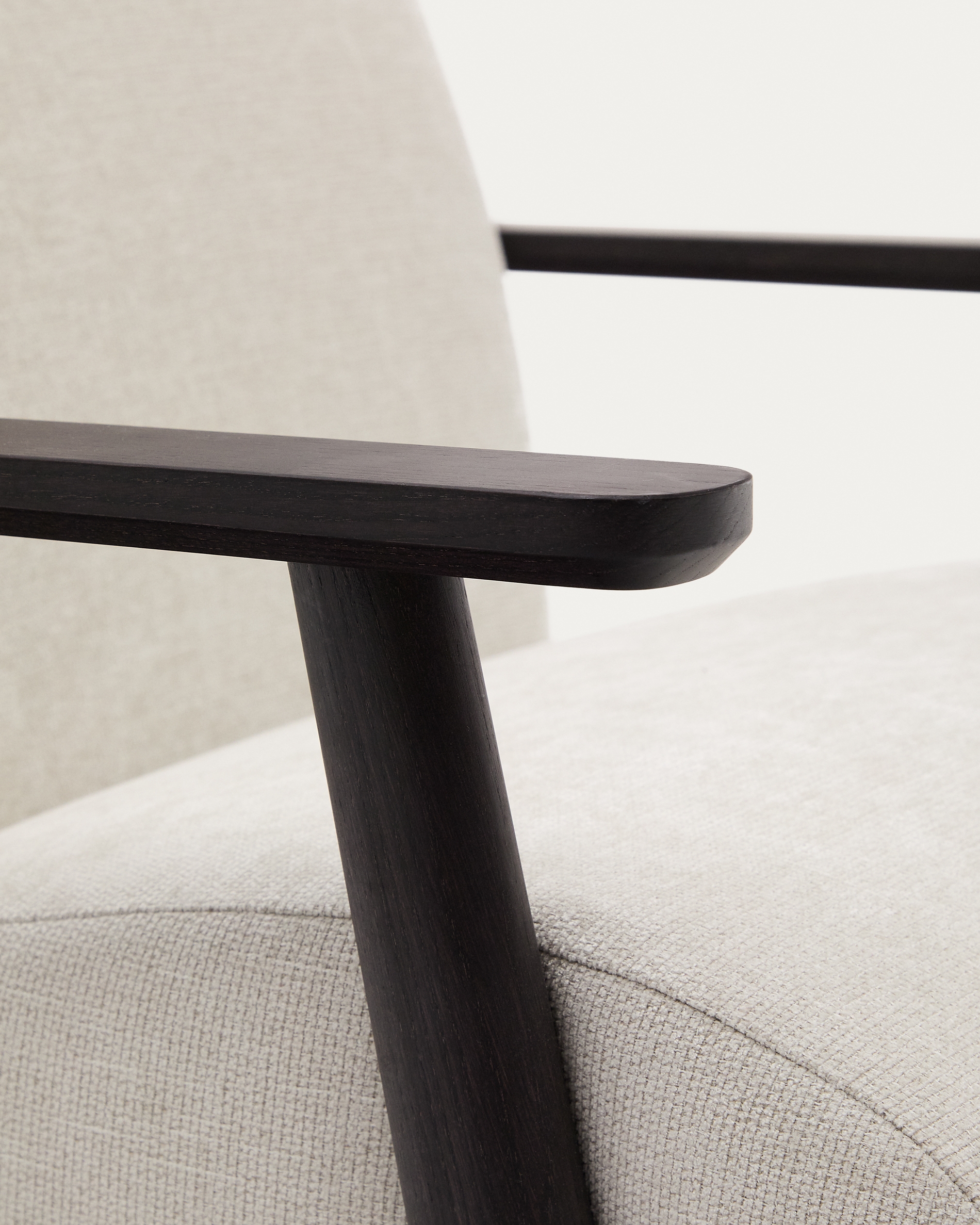 Дизайн этого кресла минималистский, в расслабленном стиле, который сочетается с открытой рамой из массива ясеня. Его сиденье и спинка заполнены пеной, что придает ему средне-мягкую посадку, а его рама изготовлена из сосны и ДСП E0.