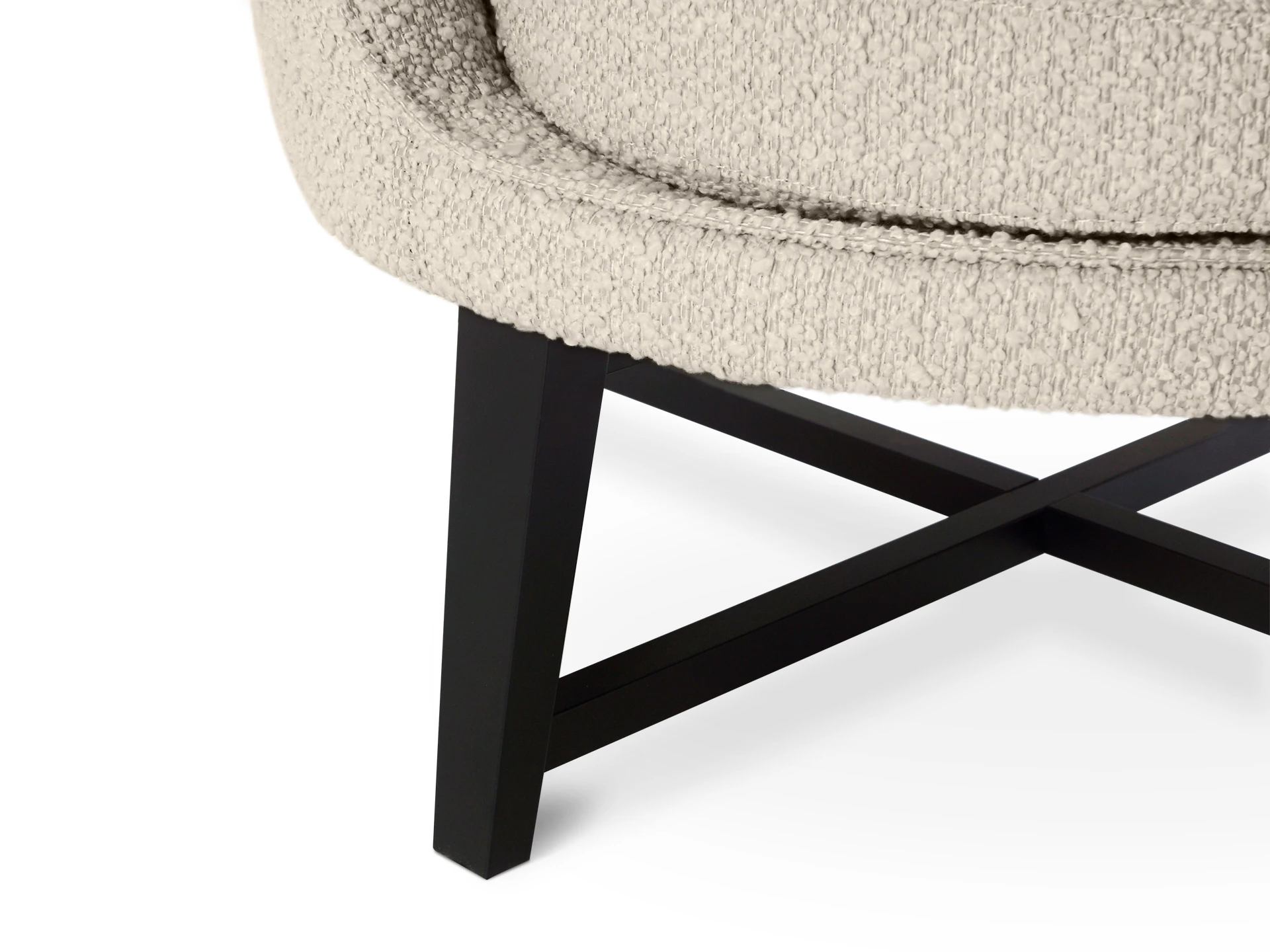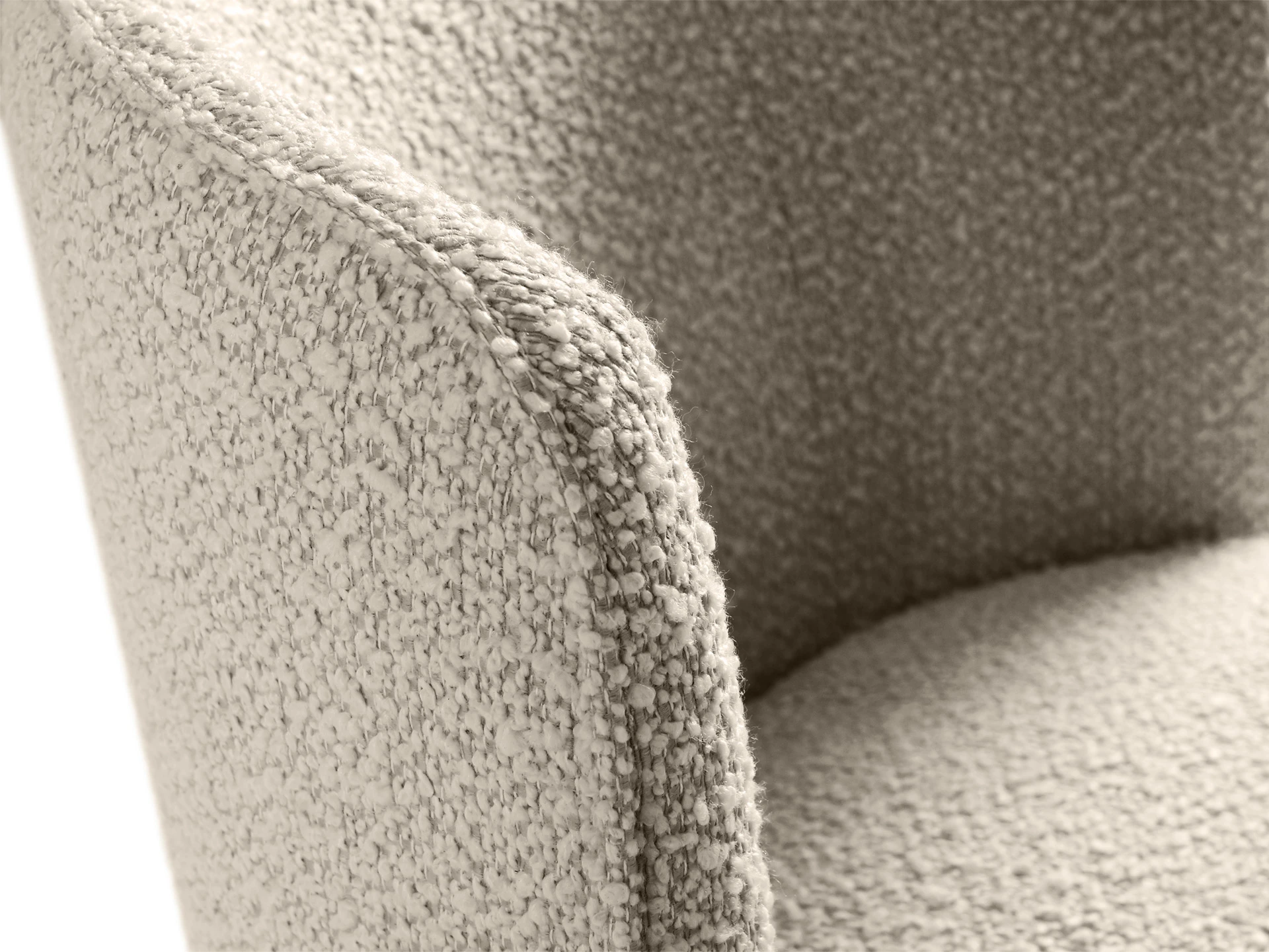 Кресло Onore очаровывает плавным силуэтом и лаконичным дизайном. Прямые граненые ножки из дерева невысоко приподнимают круглое сиденье с полукруглой спинкой. Симбиоз форм создает простой и выразительный силуэт, рождающий чувство спокойствия, умиротворения. «Обнимающая» спинка отвечает за защиту и уединение. Фактурная обивка букле придает мягкости, уюта, тепла.Кресло Onore подходит для оформления городской квартиры, студии, загородного дома, офиса, кафе, отеля. Эстетично впишется в гостиную с настроением неоклассики, сканди, минимализма, украсит спальню, детскую, кабинет, составит изящную пару журнальному или косметическому столику, дивану, пуфу, банкетке и подарит вам бесценные часы комфортного отдыха.