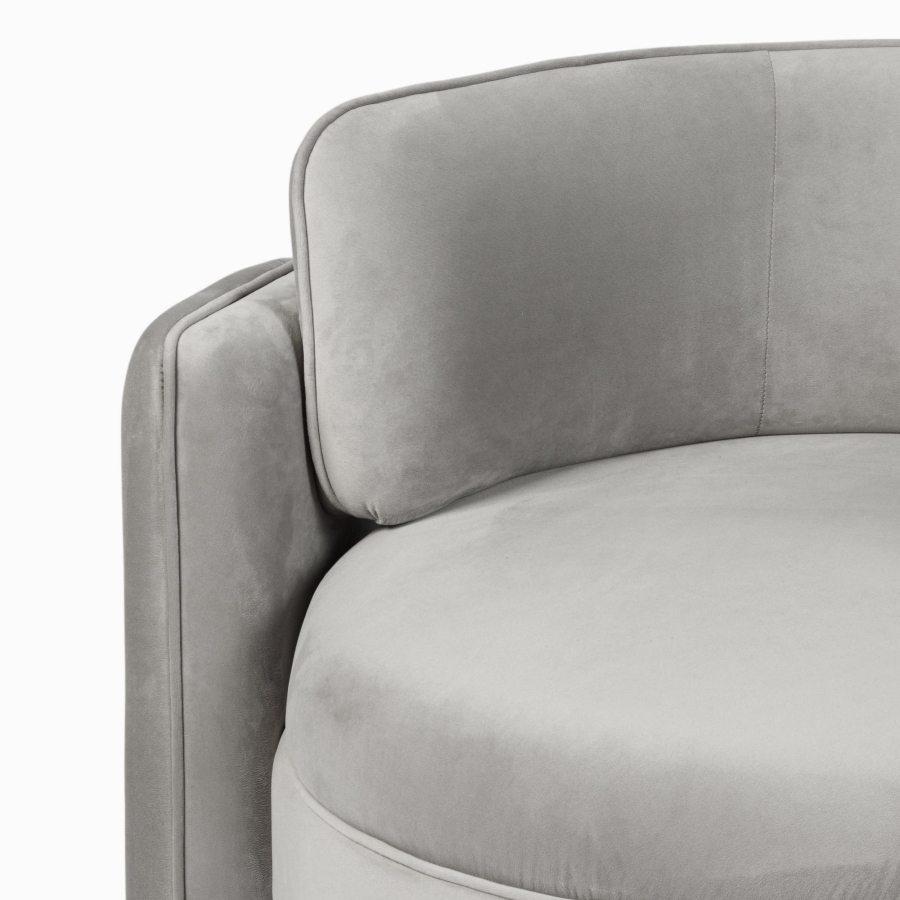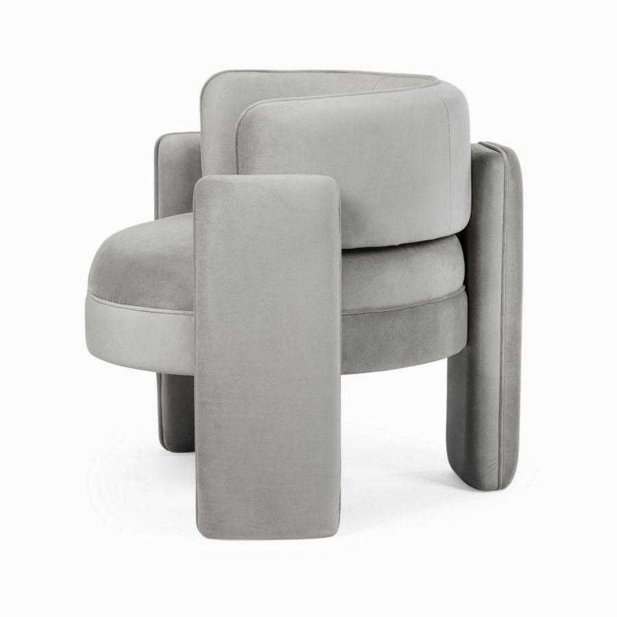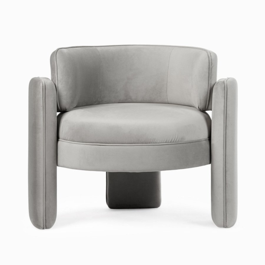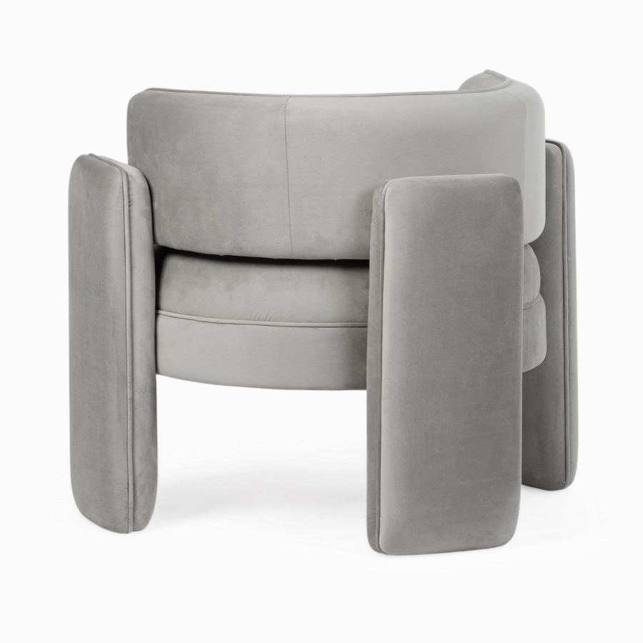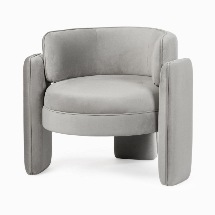 Его округлая форма и отсутствие острых углов создают ощущение мягкости и комфорта. Кресло обито благородным велюром светло-серого цвета, придавая ему элегантный вид. Особенностью модели являются её необычные, подлокотники переходящие в ножки. Вместе со спинкой они создают необычную, но устойчивую конструкцию.