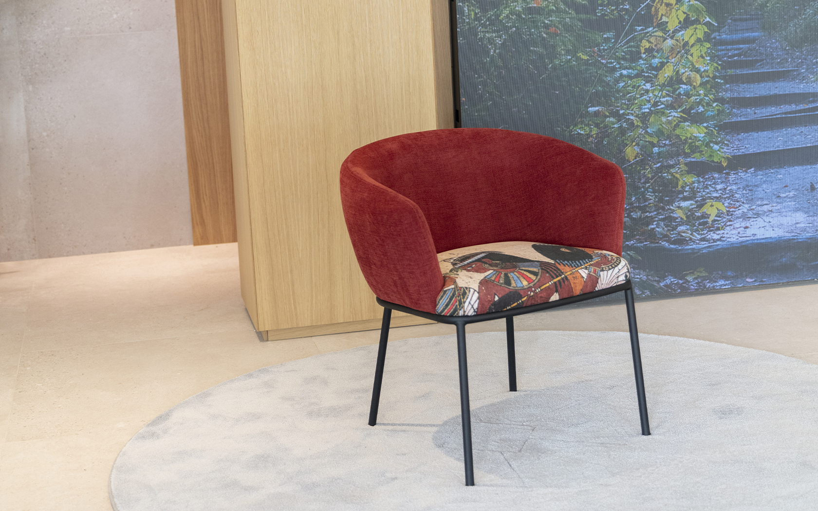 Scarlett — кресло с мягкой обивкой больших размеров, обволакивающего дизайна и очень удобным сиденьем. Благодаря своим изогнутым формам он создает силуэт, обеспечивающий удобную позу. Он контрастирует с легкостью металлической ножки, что придает нотку современности.