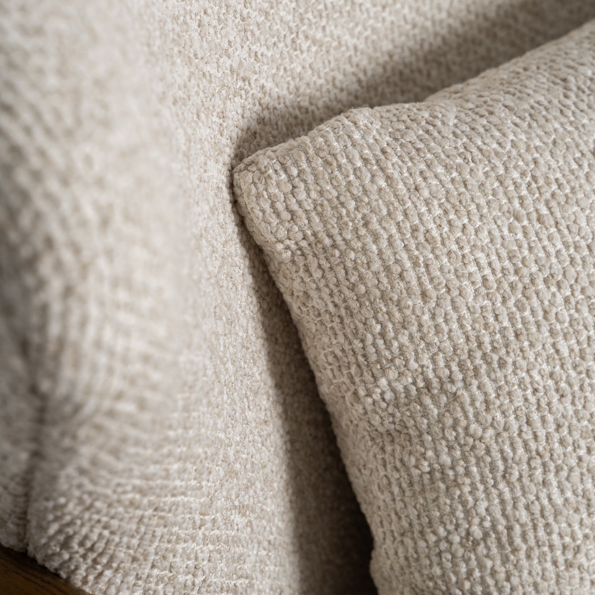 Кресло Tarres в современном стиле, изготовлено из бежевого полиэстера в сочетании с коричневым ясенем и поролоном.