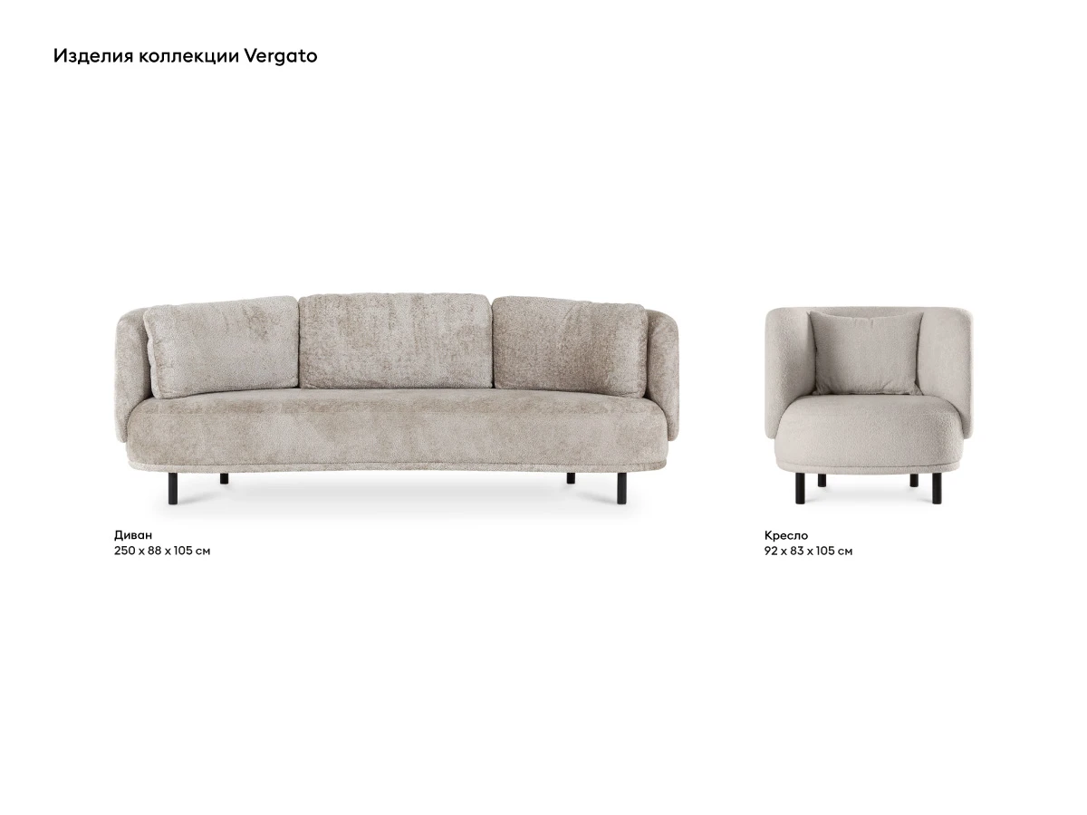 Vergato — кресло, созданное специально для тех, кто ценит высокий уровень комфорта и эстетики. Превратит любой уголок в локацию спокойствия и гармонии. Объёмные мягкие формы, изящные очертания и привлекательная фактура материала наполнят пространство особым настроением тепла и уюта. Эргономичная конструкция подчеркивает гостеприимство и дружелюбность атмосферы. Высокая спинка, плавно переходящая в подлокотники, обеспечивает удобную посадку, дарит ощущение поддержки и защищённости.