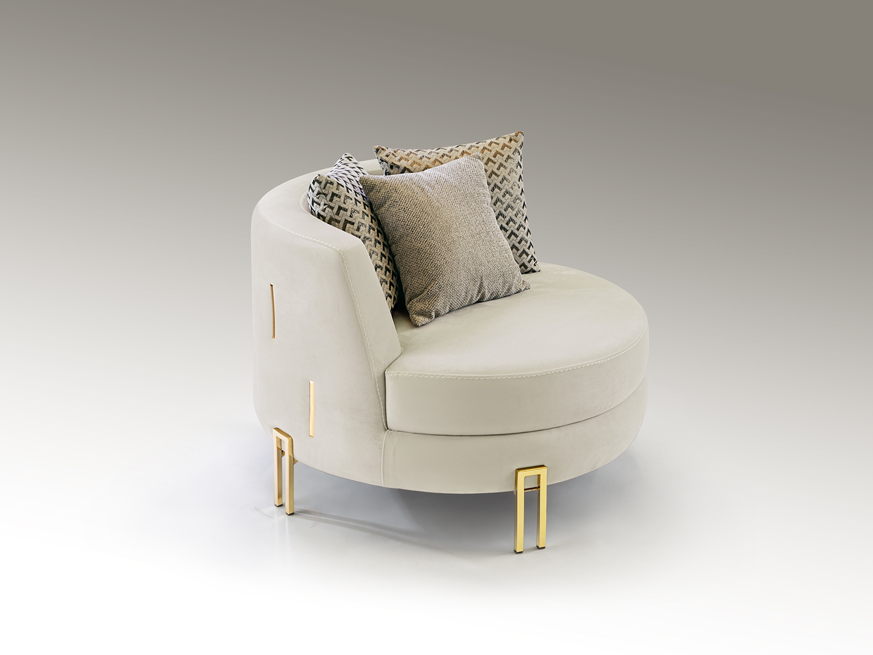 Кресло, обито кремово-белым бархатом, подушки комбинированные. Металлические ножки и декоративные пластины с золотистой отделкой. Ткань 100% полиэстер 320 гр/м². Каркас из бука. Наполнен поролоном 36 кг/м³ и холлофайбером