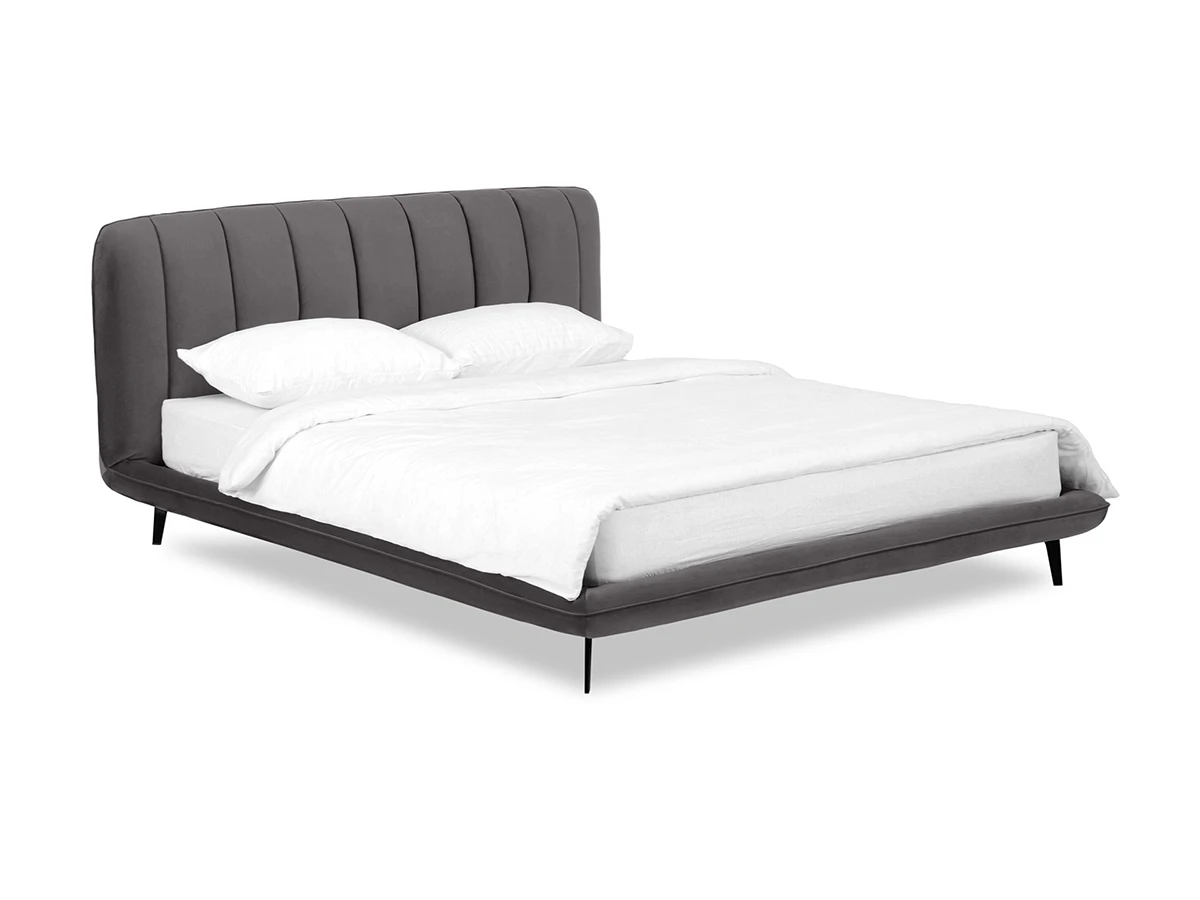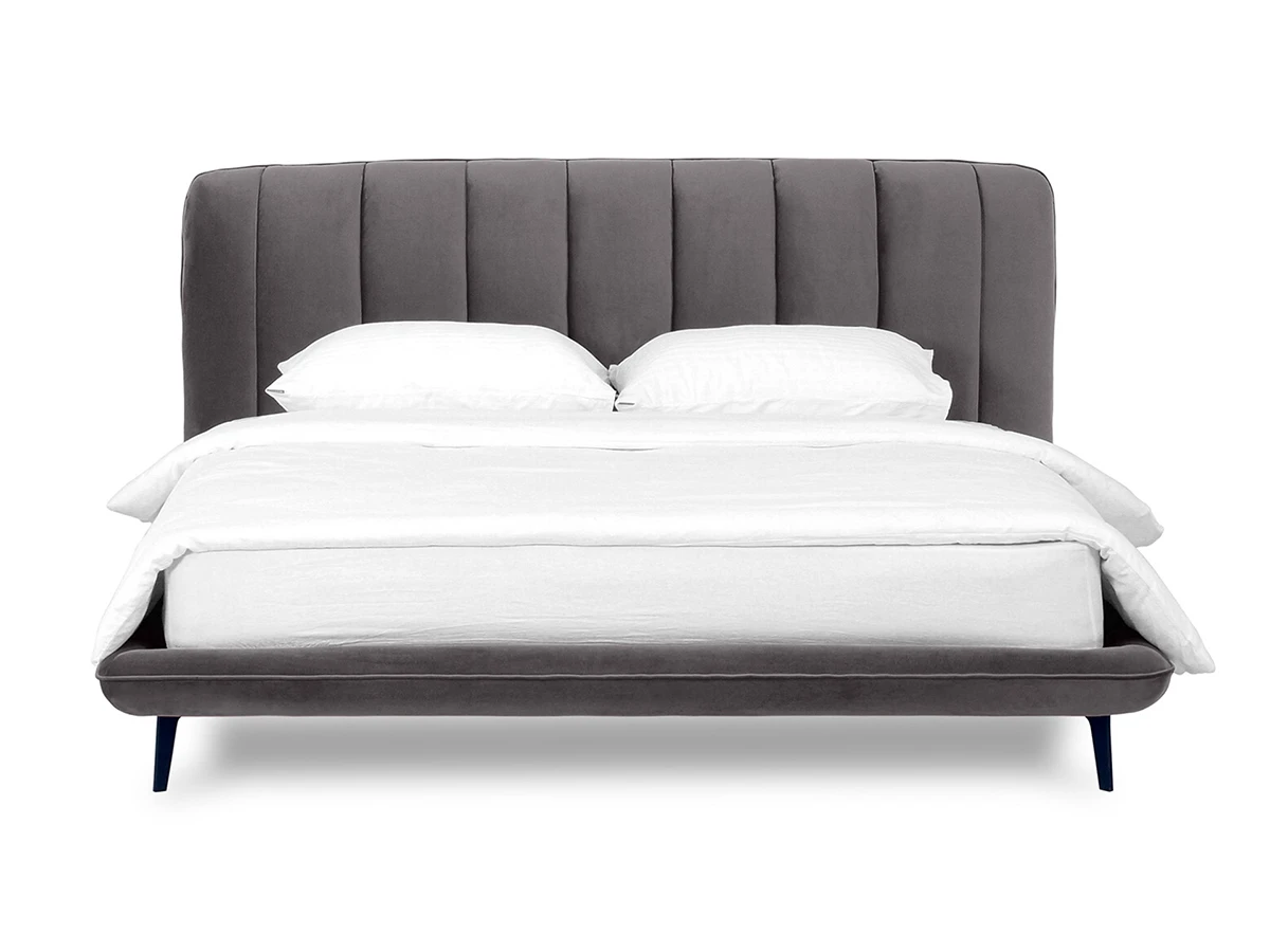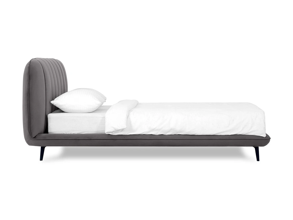 Прочные ножки из металла незаметно приподнимают корпус над полом. Поэтому кровать смотрится воздушно. Также это упрощает уборку. Мягкие изящные царги плавно перетекают в изголовье, единство с которым подчеркивается рельефным кантом.