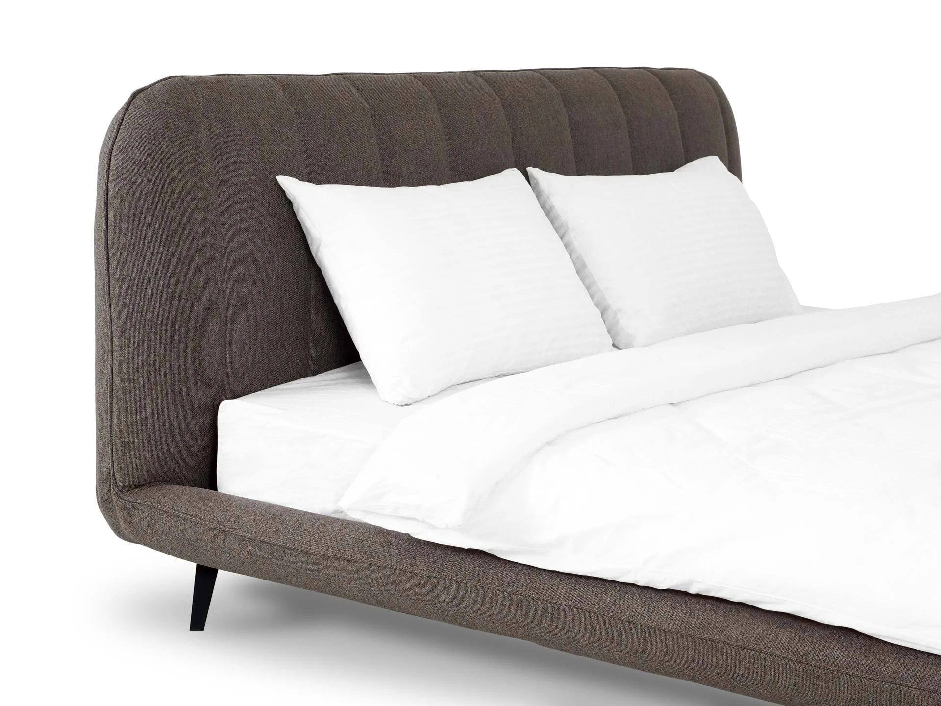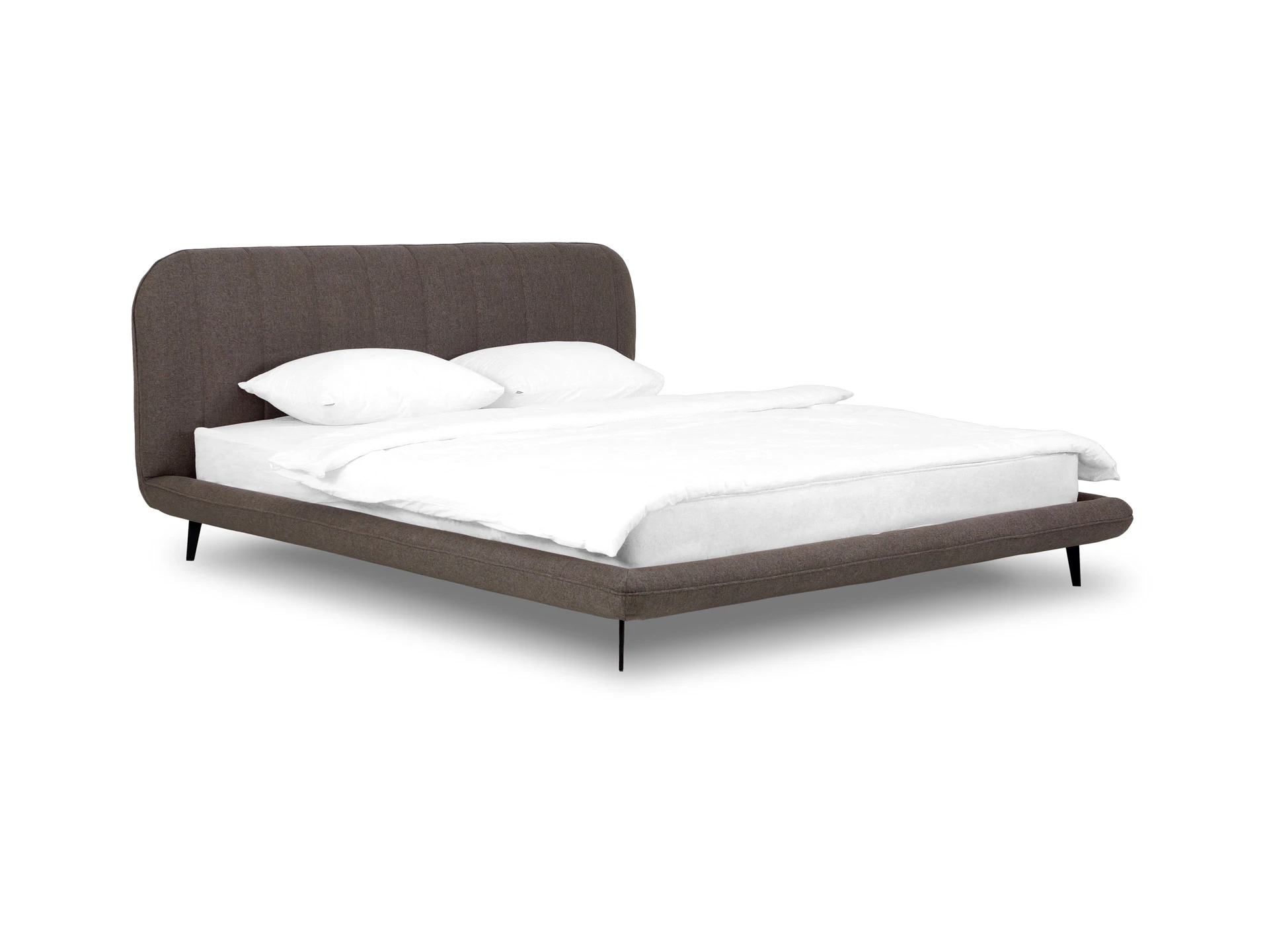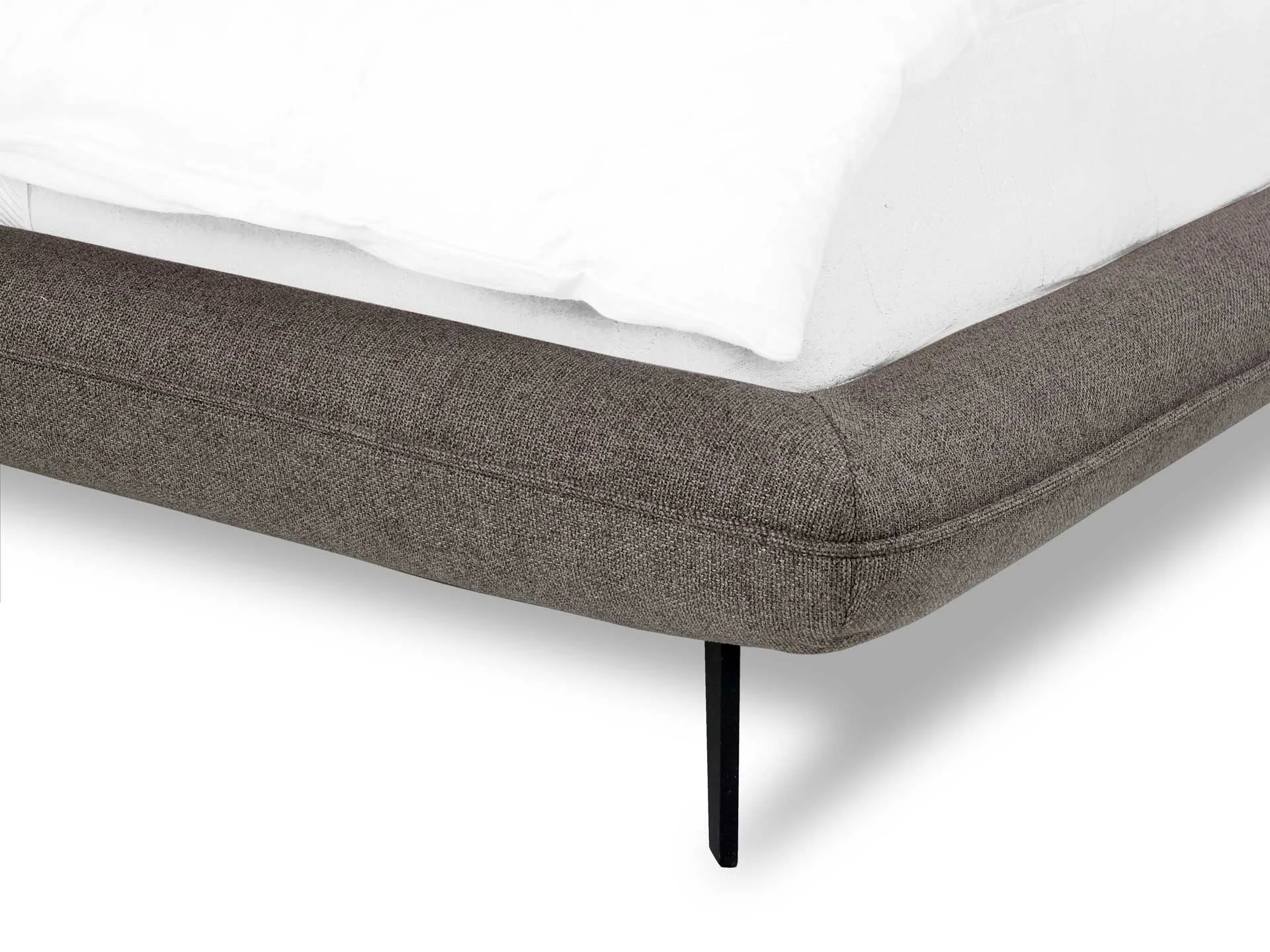 Прочные ножки из металла незаметно приподнимают корпус над полом. Поэтому кровать смотрится воздушно. Также это упрощает уборку. Мягкие изящные царги плавно перетекают в изголовье, единство с которым подчеркивается рельефным кантом.