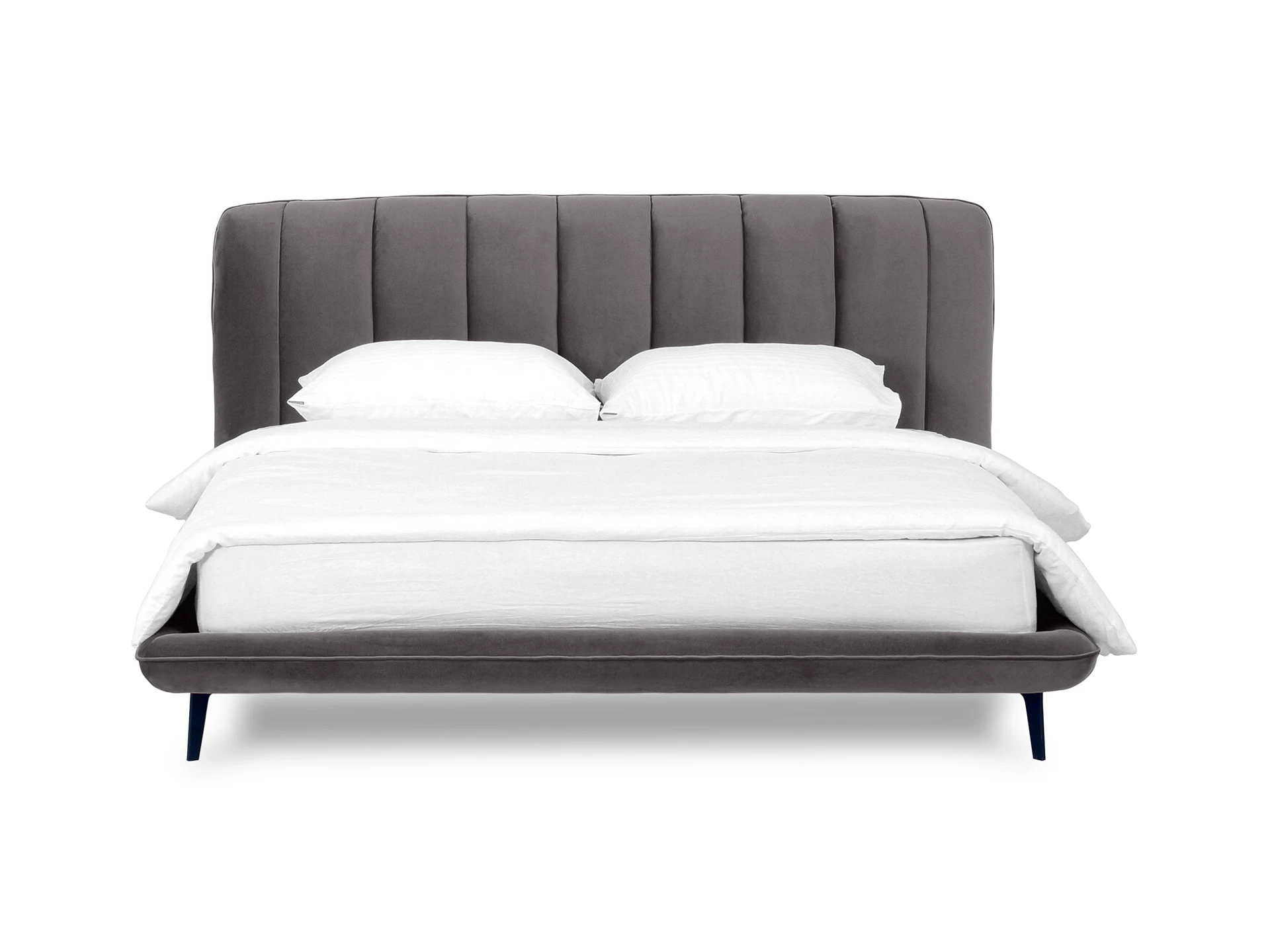 Прочные ножки из металла незаметно приподнимают корпус над полом. Поэтому кровать смотрится воздушно. Также это упрощает уборку. Мягкие изящные царги плавно перетекают в изголовье, единство с которым подчеркивается рельефным кантом.