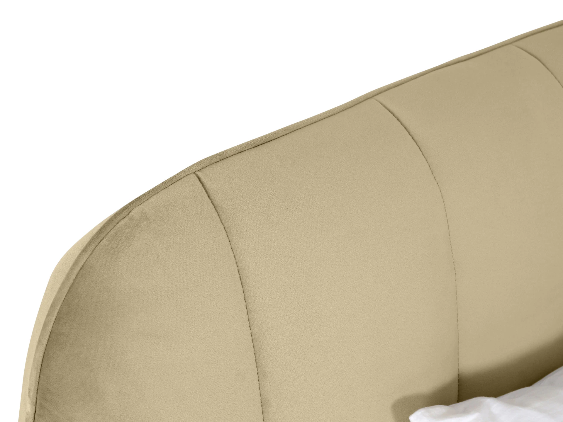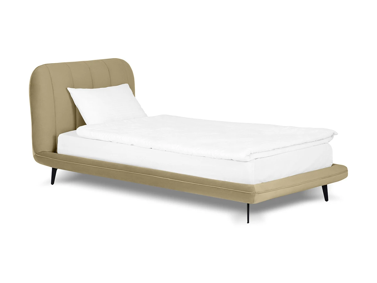 Прочные ножки из металла незаметно приподнимают корпус над полом. Поэтому кровать смотрится воздушно. Также это упрощает уборку. Мягкие изящные царги плавно перетекают в изголовье, единство с которым подчеркивается рельефным кантом.