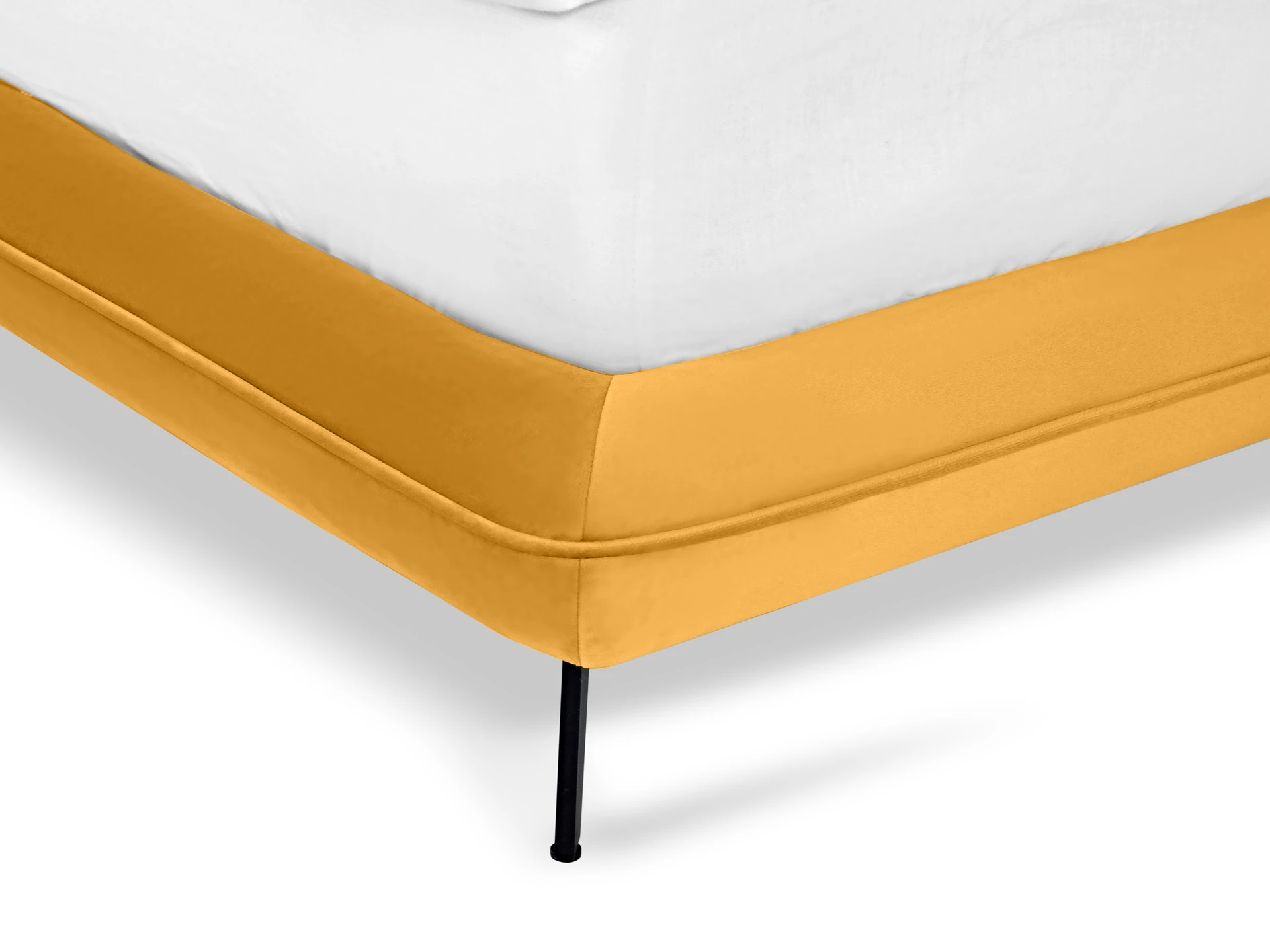 Прочные ножки из металла незаметно приподнимают корпус над полом. Поэтому кровать смотрится воздушно. Также это упрощает уборку. Мягкие изящные царги плавно перетекают в изголовье, единство с которым подчеркивается рельефным кантом.