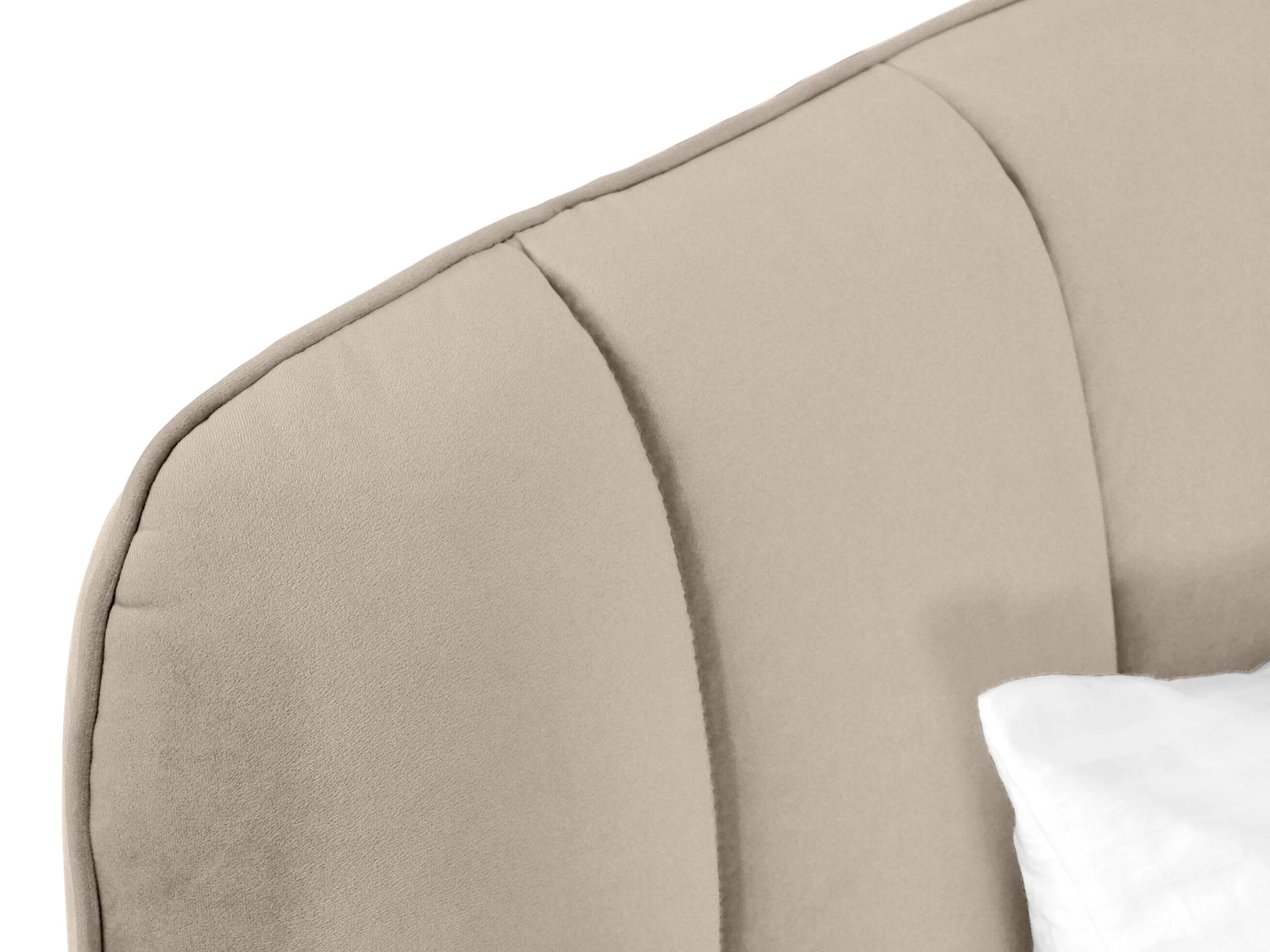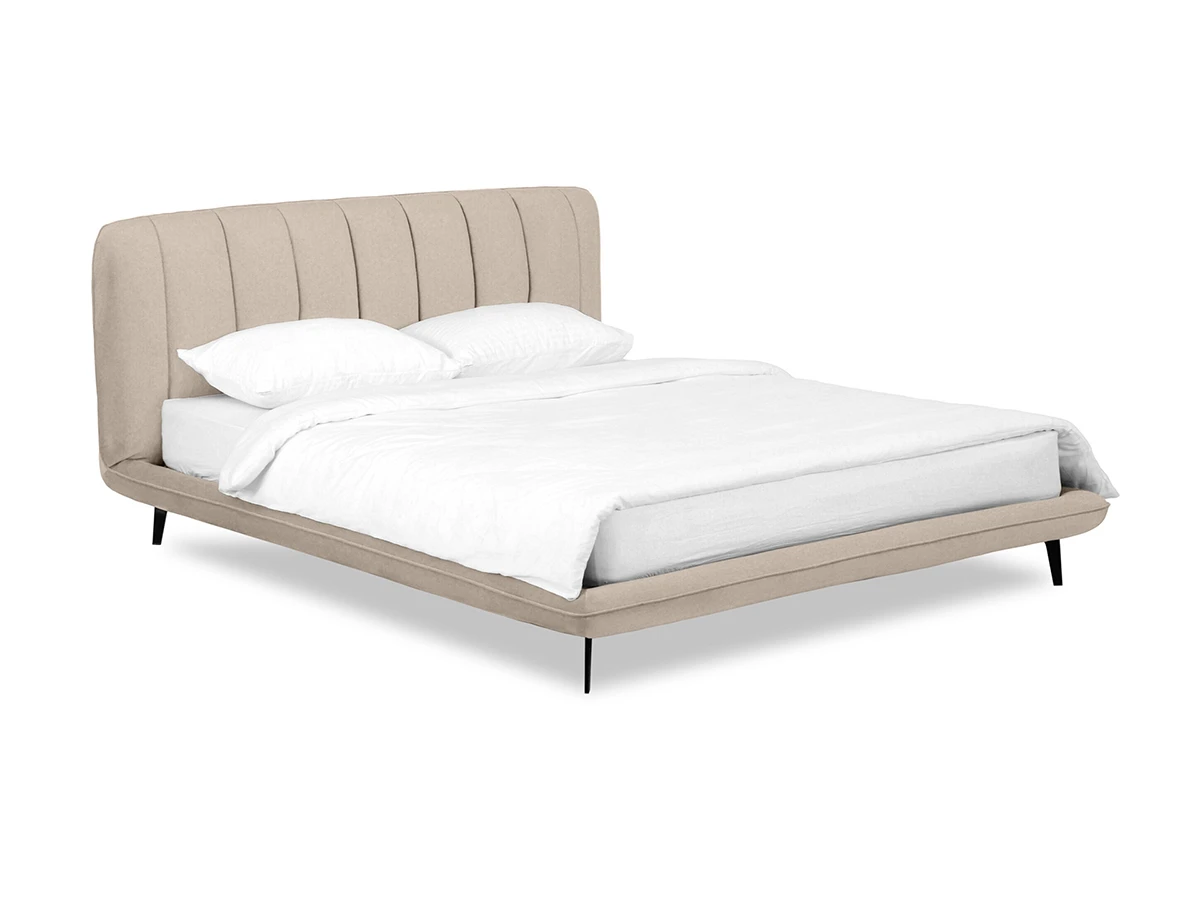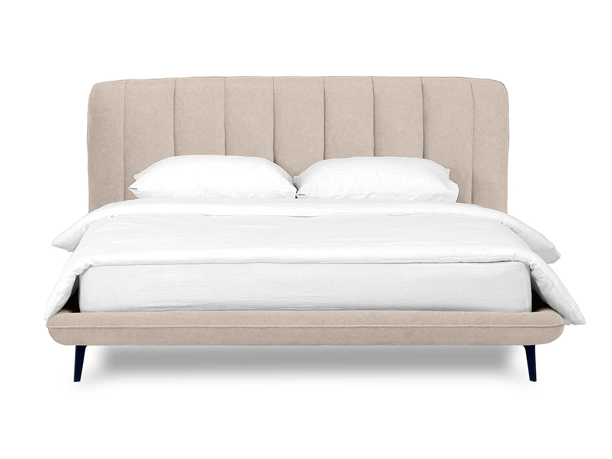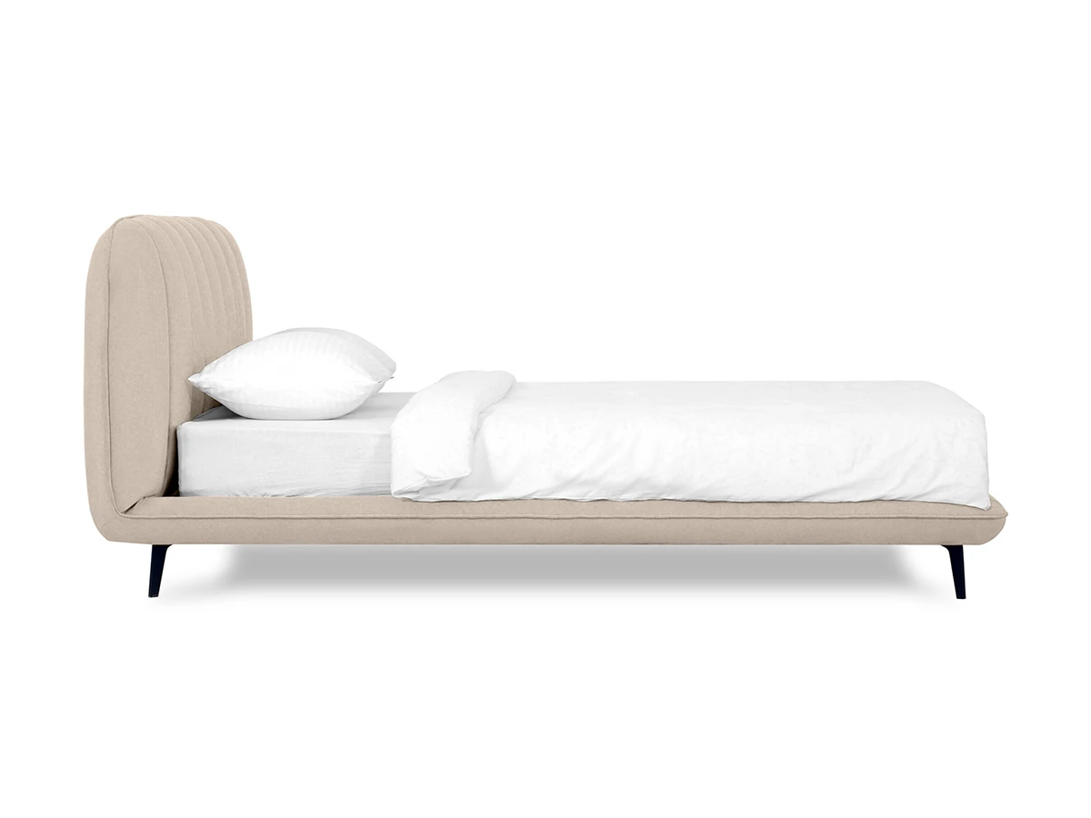 Прочные ножки из металла незаметно приподнимают корпус над полом. Поэтому кровать смотрится воздушно. Также это упрощает уборку. Мягкие изящные царги плавно перетекают в изголовье, единство с которым подчеркивается рельефным кантом.