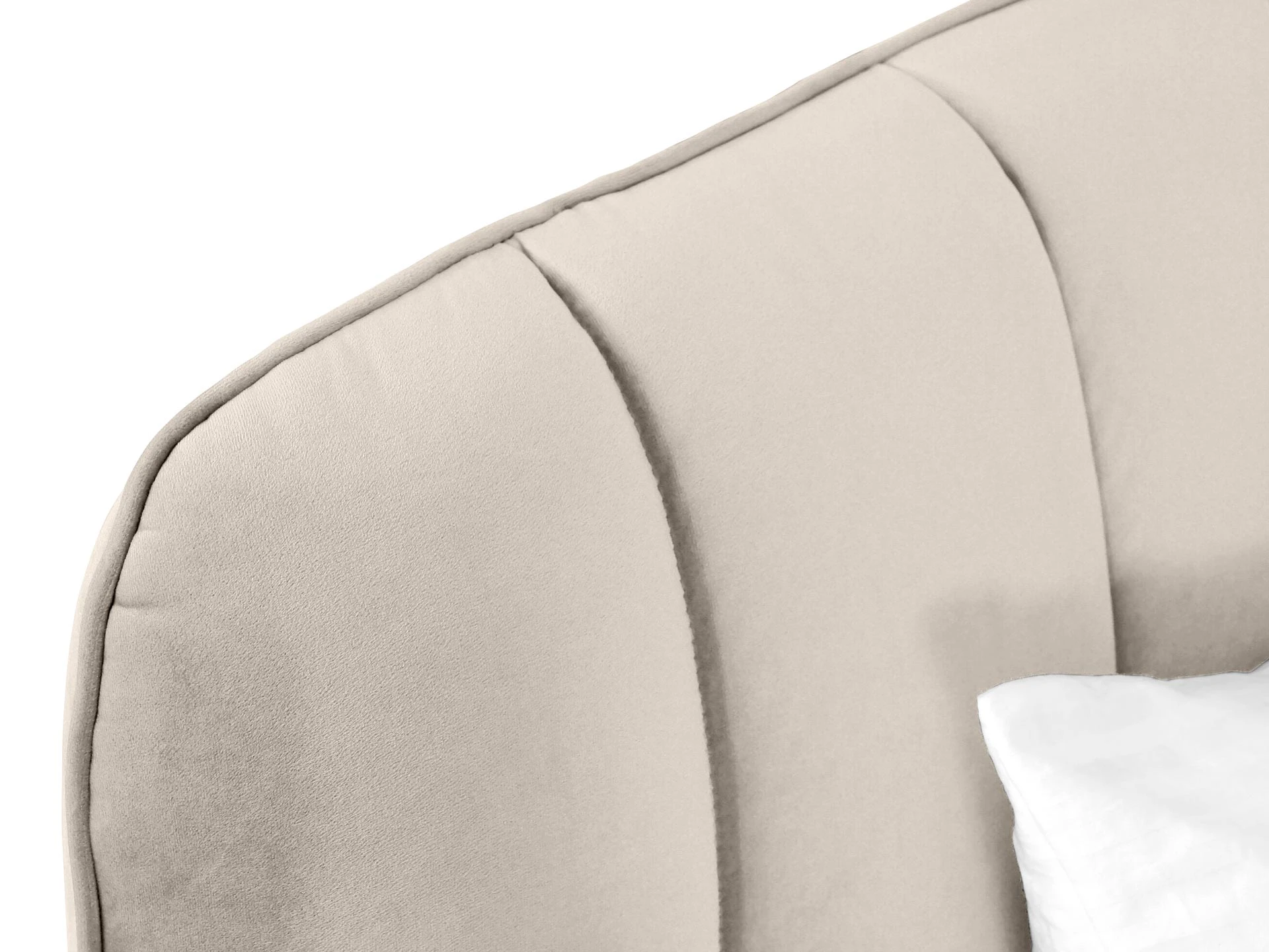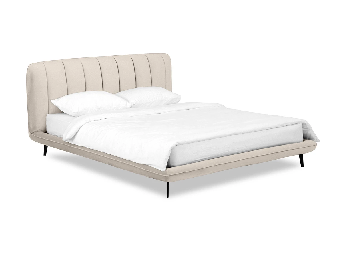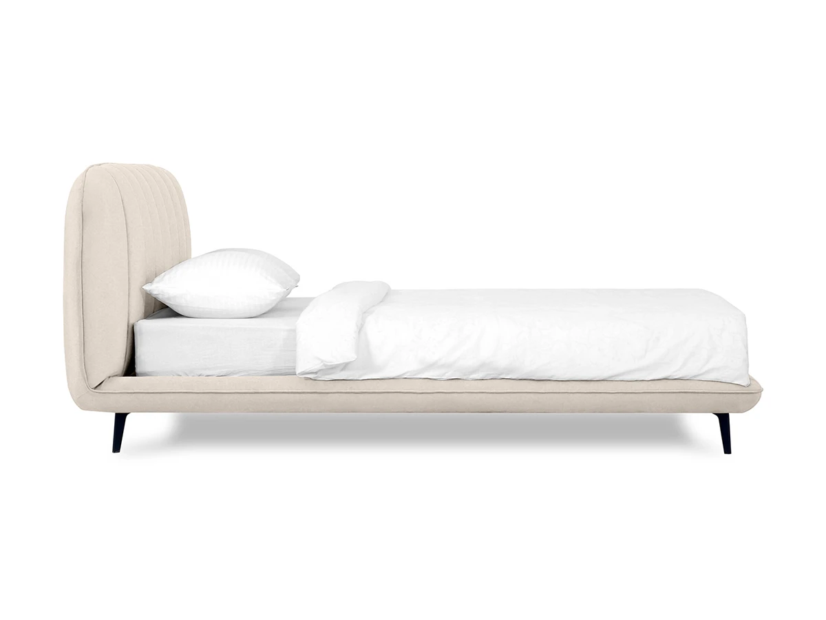 Прочные ножки из металла незаметно приподнимают корпус над полом. Поэтому кровать смотрится воздушно. Также это упрощает уборку. Мягкие изящные царги плавно перетекают в изголовье, единство с которым подчеркивается рельефным кантом.