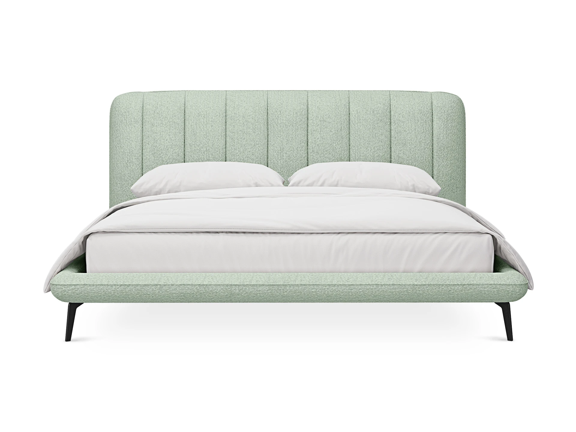 Прочные ножки из металла незаметно приподнимают корпус над полом. Поэтому кровать смотрится воздушно. Также это упрощает уборку. Мягкие изящные царги плавно перетекают в изголовье, единство с которым подчеркивается рельефным кантом.