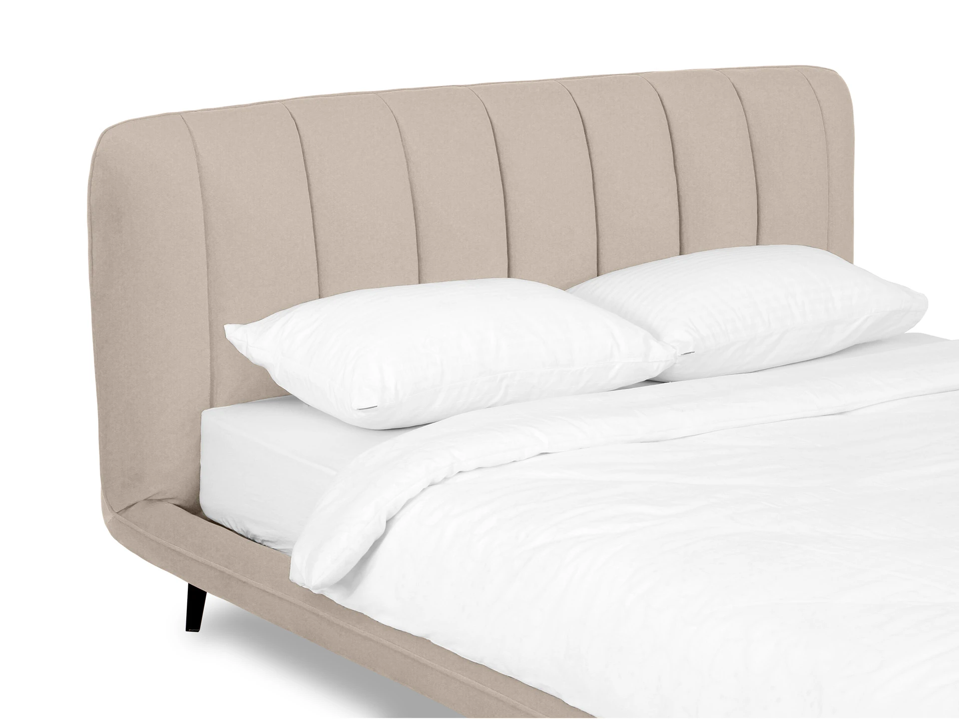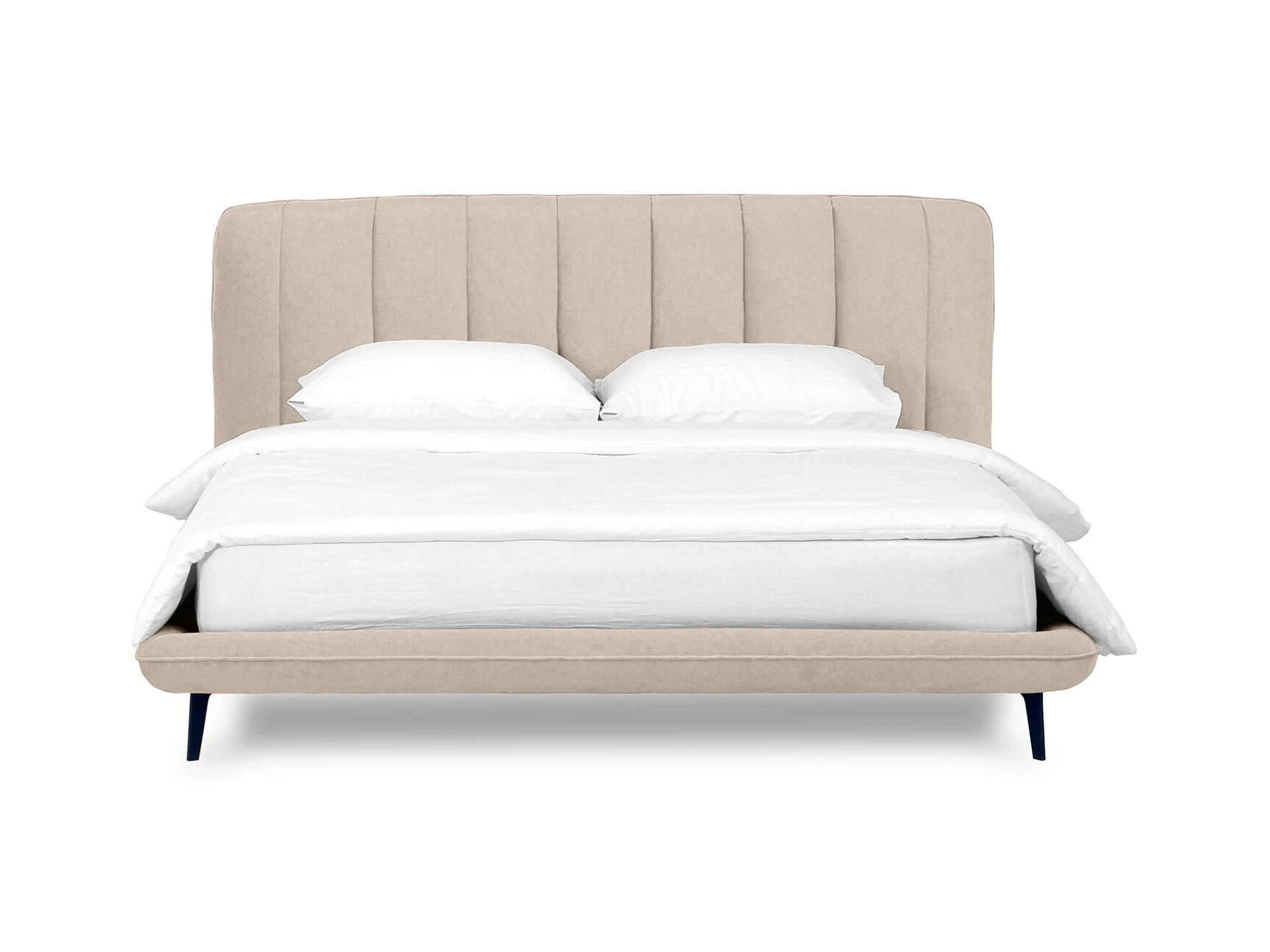 Прочные ножки из металла незаметно приподнимают корпус над полом. Поэтому кровать смотрится воздушно. Также это упрощает уборку. Мягкие изящные царги плавно перетекают в изголовье, единство с которым подчеркивается рельефным кантом.