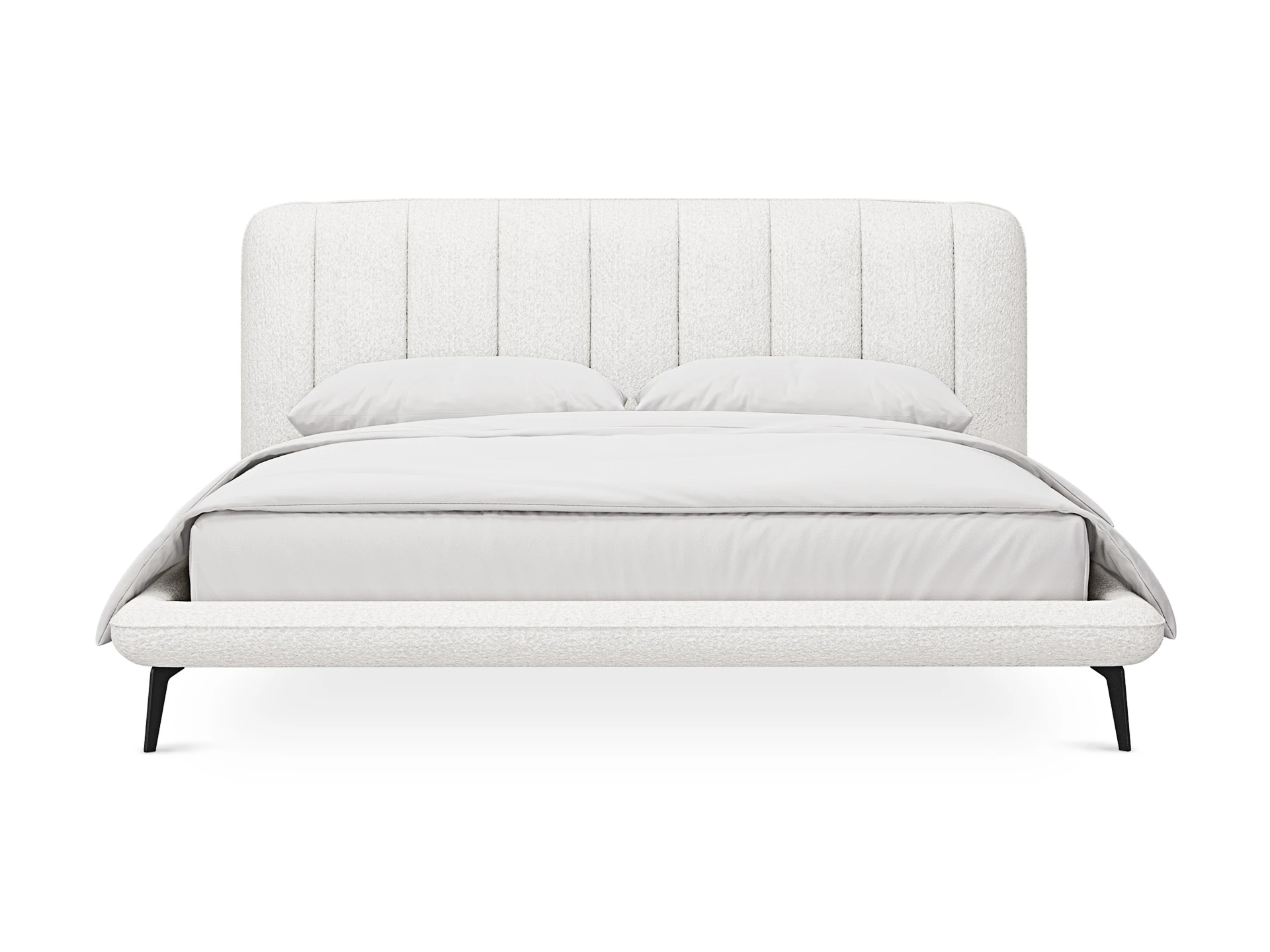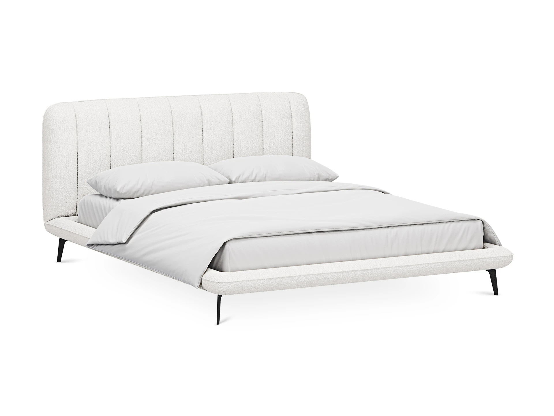 Прочные ножки из металла незаметно приподнимают корпус над полом. Поэтому кровать смотрится воздушно. Также это упрощает уборку. Мягкие изящные царги плавно перетекают в изголовье, единство с которым подчеркивается рельефным кантом.