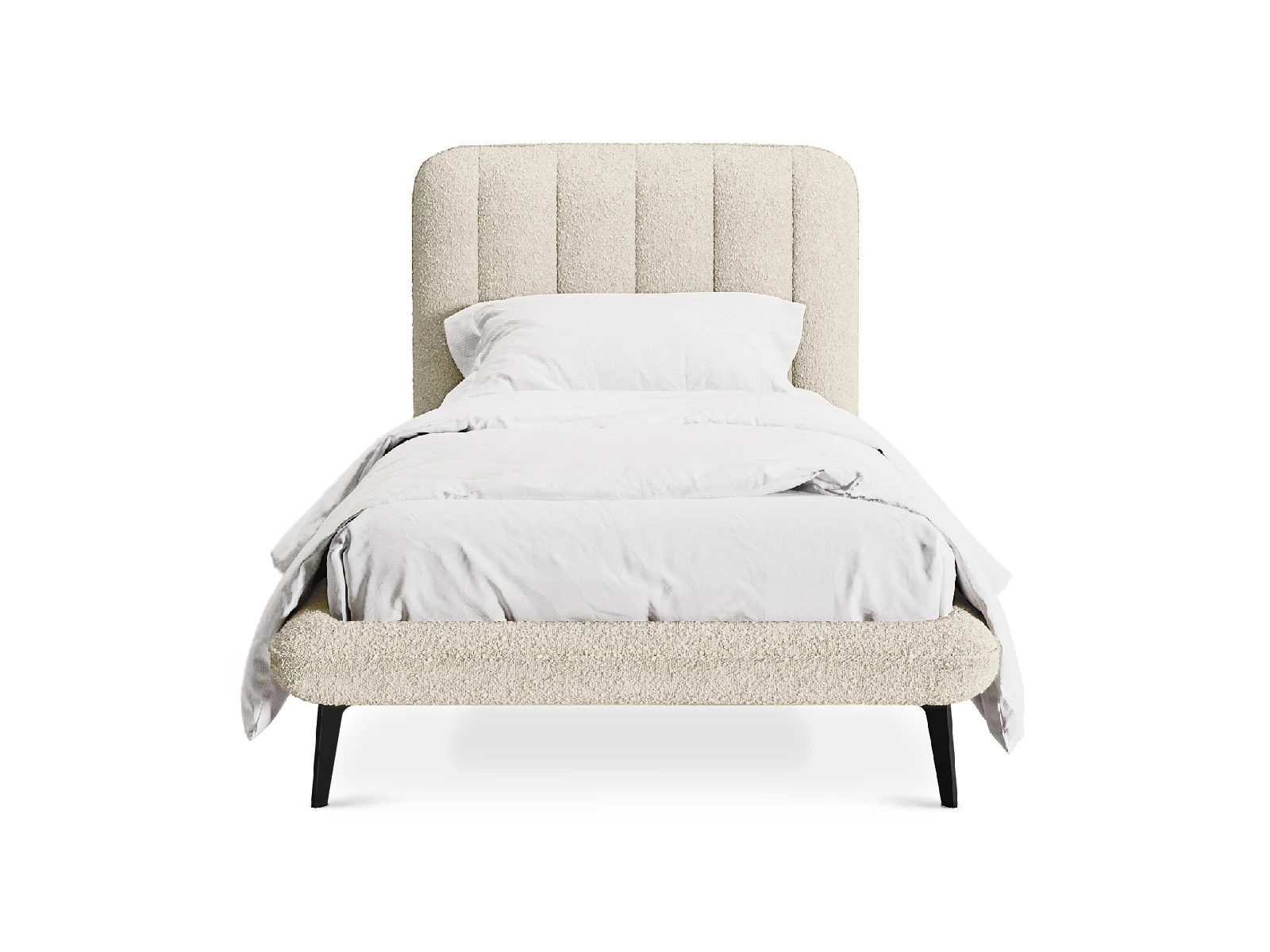 Прочные ножки из металла незаметно приподнимают корпус над полом. Поэтому кровать смотрится воздушно. Также это упрощает уборку. Мягкие изящные царги плавно перетекают в изголовье, единство с которым подчеркивается рельефным кантом.