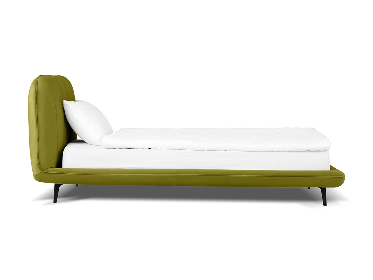Прочные ножки из металла незаметно приподнимают корпус над полом. Поэтому кровать смотрится воздушно. Также это упрощает уборку. Мягкие изящные царги плавно перетекают в изголовье, единство с которым подчеркивается рельефным кантом.