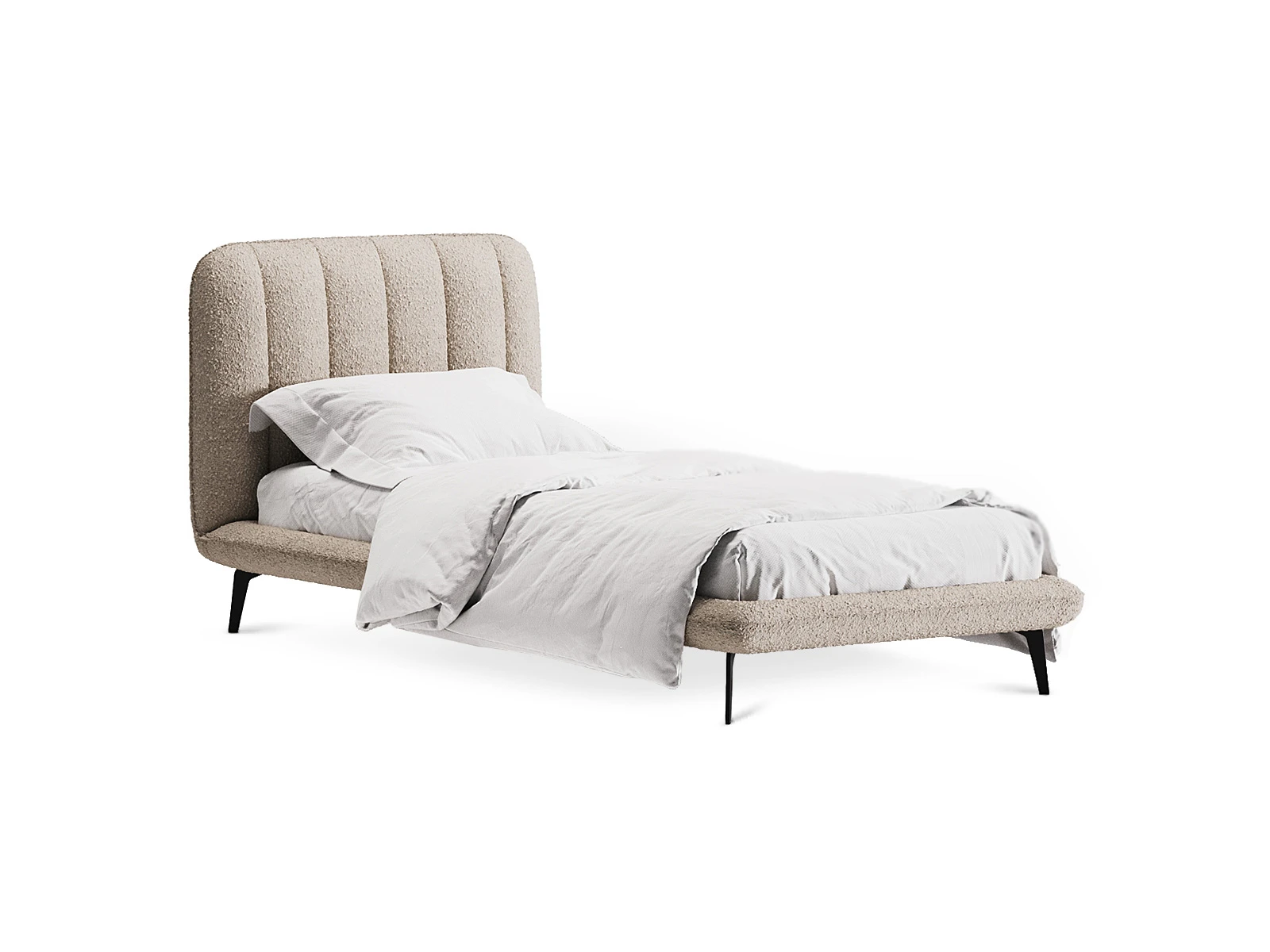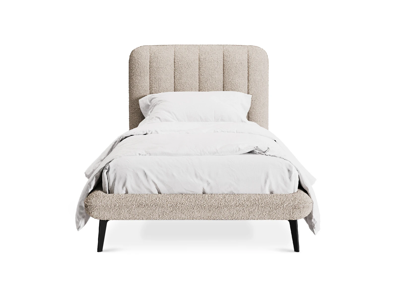 Прочные ножки из металла незаметно приподнимают корпус над полом. Поэтому кровать смотрится воздушно. Также это упрощает уборку. Мягкие изящные царги плавно перетекают в изголовье, единство с которым подчеркивается рельефным кантом.