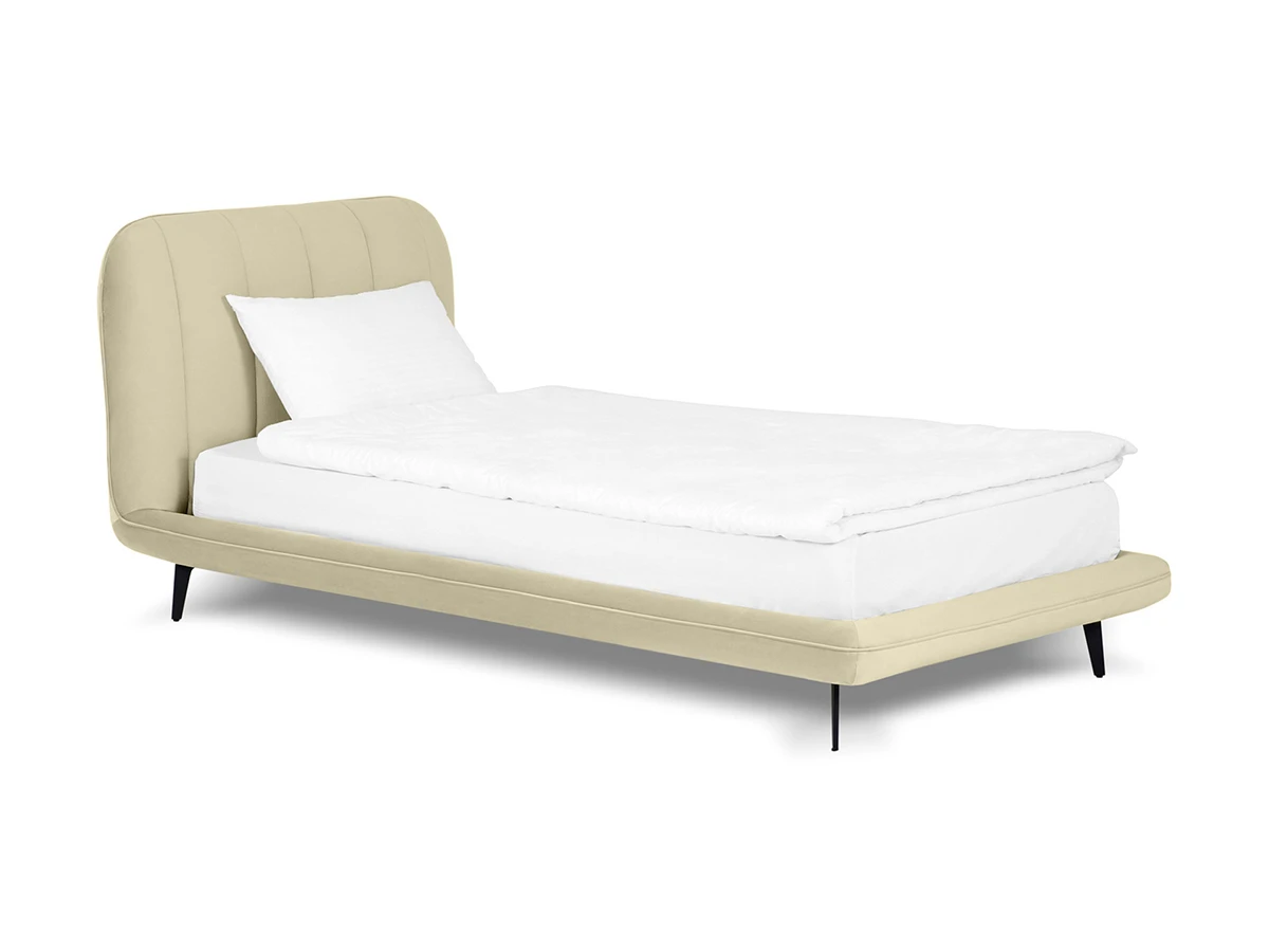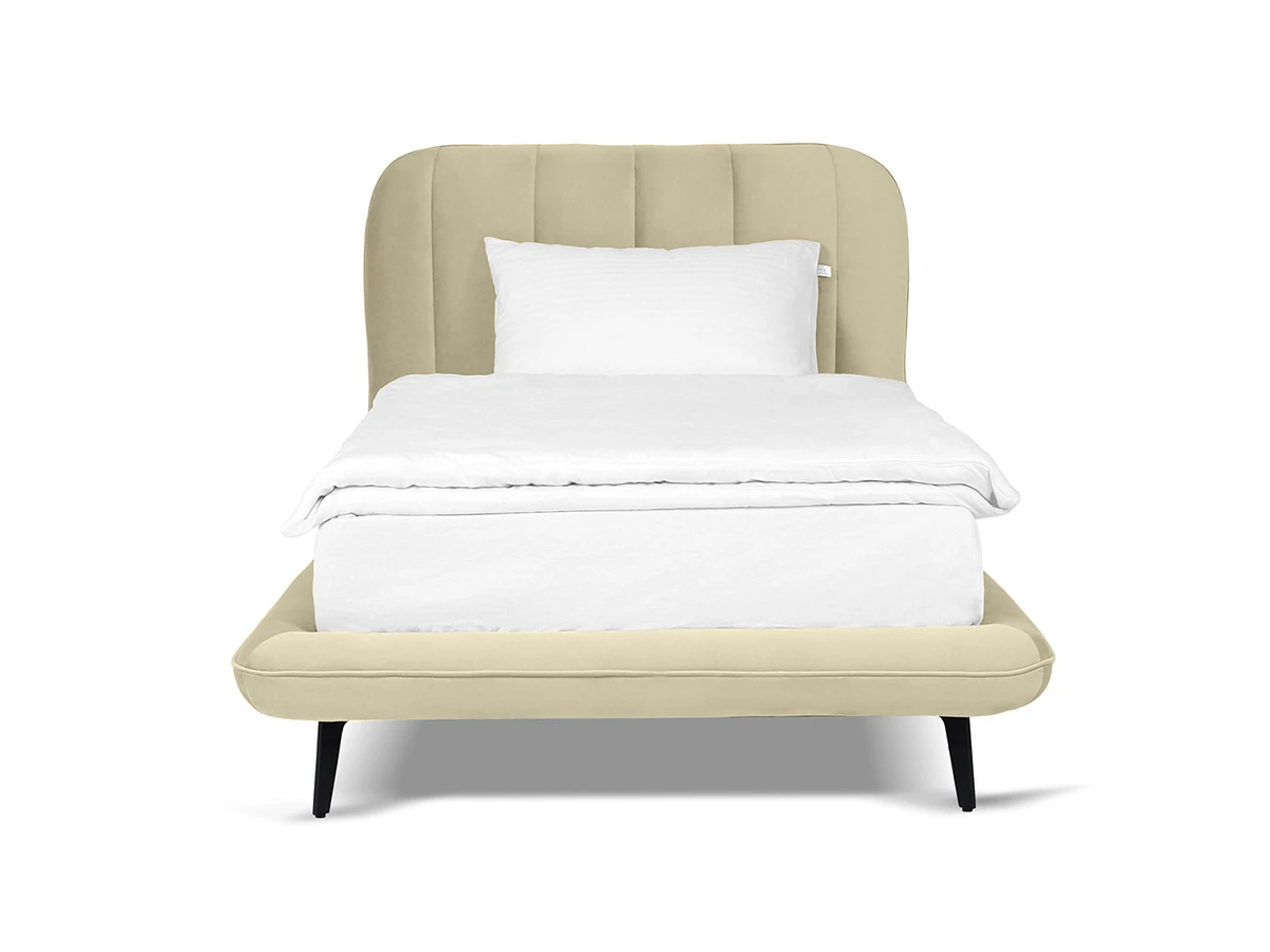 Прочные ножки из металла незаметно приподнимают корпус над полом. Поэтому кровать смотрится воздушно. Также это упрощает уборку. Мягкие изящные царги плавно перетекают в изголовье, единство с которым подчеркивается рельефным кантом.
