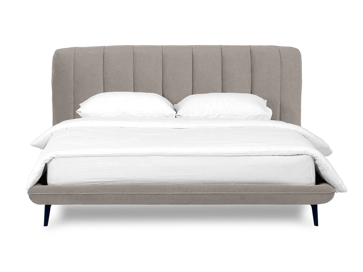 Прочные ножки из металла незаметно приподнимают корпус над полом. Поэтому кровать смотрится воздушно. Также это упрощает уборку. Мягкие изящные царги плавно перетекают в изголовье, единство с которым подчеркивается рельефным кантом.