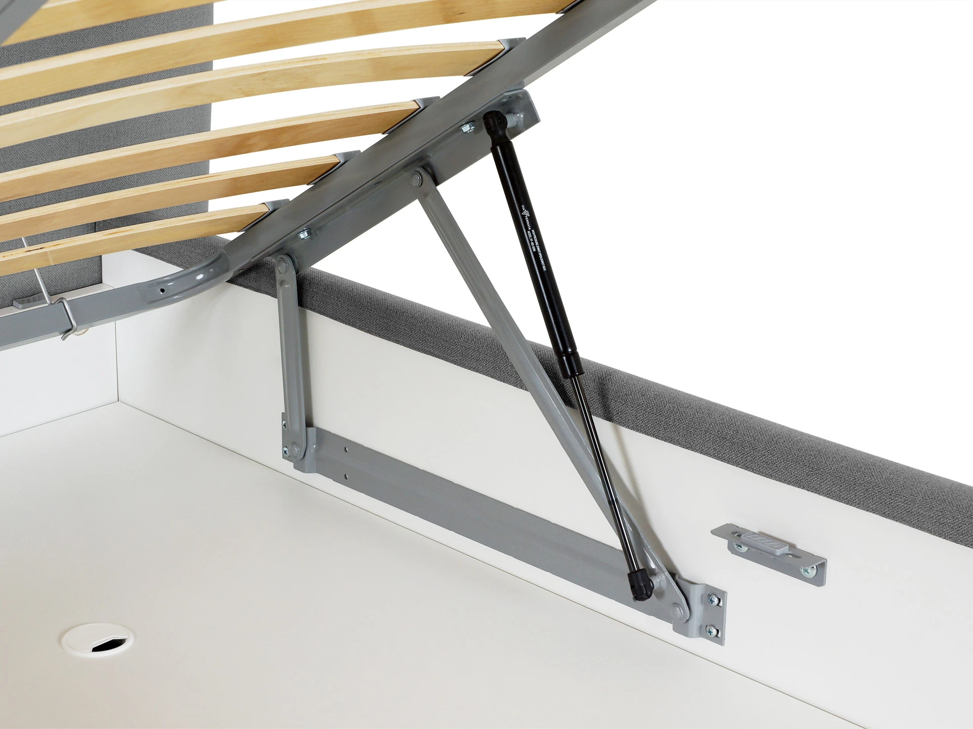 Царги кровати состоят из щитовых деталей ЛДСтП - 22 мм. В основании кровати установлены пастиковые опоры H49 мм. Лицевой чехол каркаса - съемный.