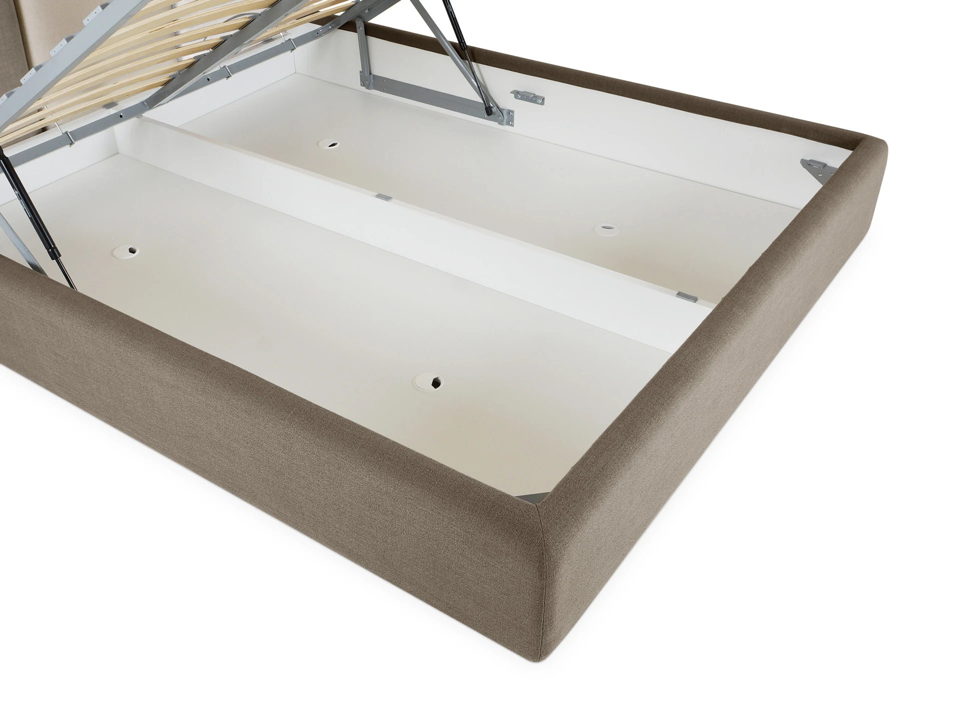 Царги кровати состоят из щитовых деталей ЛДСтП - 22 мм. В основании кровати установлены пастиковые опоры H49 мм. Лицевой чехол каркаса - съемный.