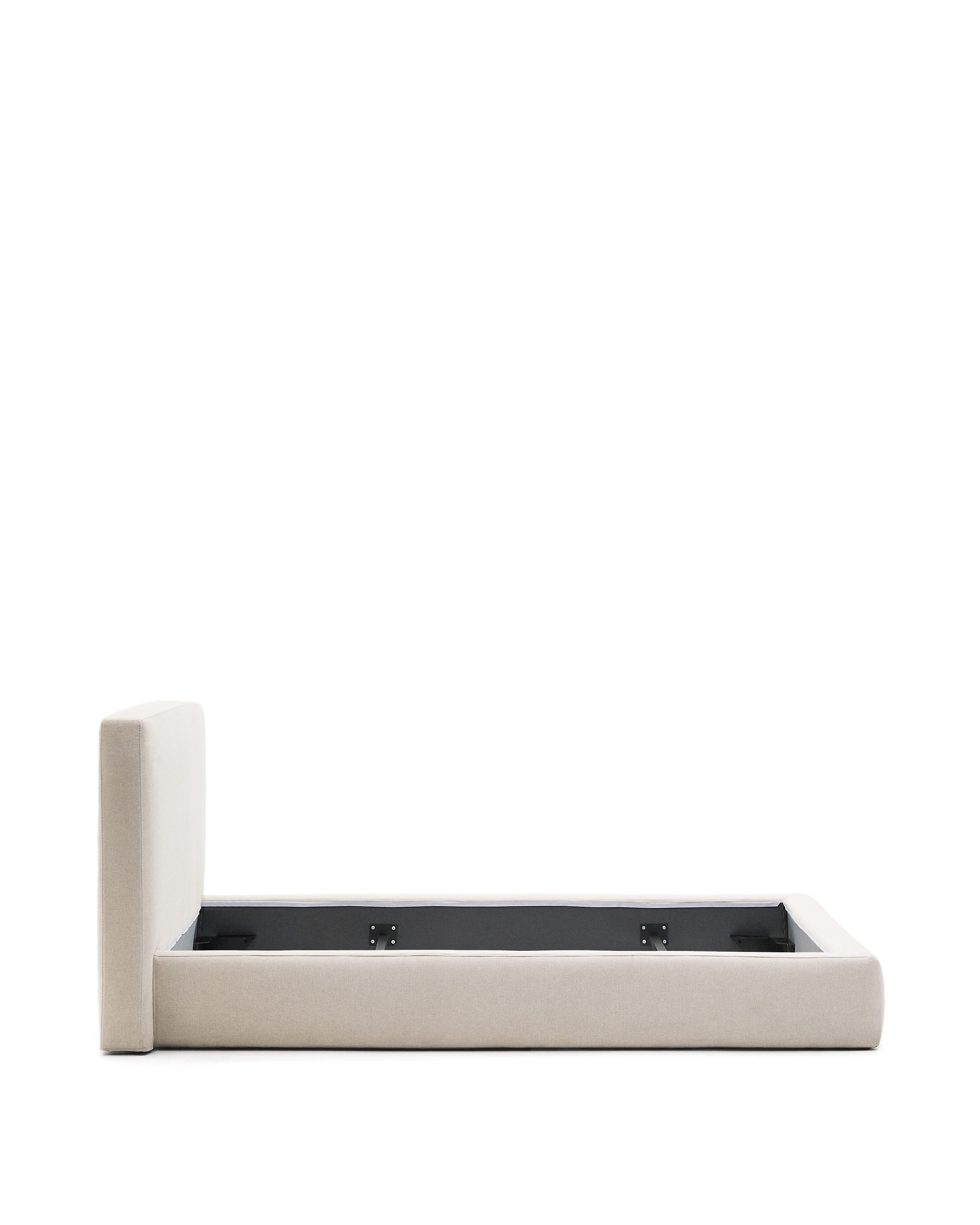 Древесина обтянута поролоном и обшита плотной синтетической тканью бежевого цвета с мягкой фактурой.