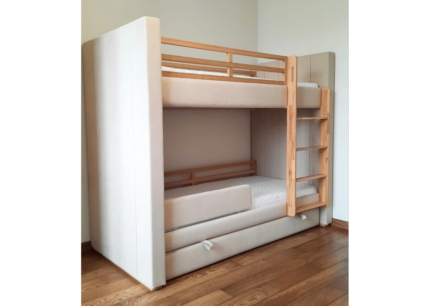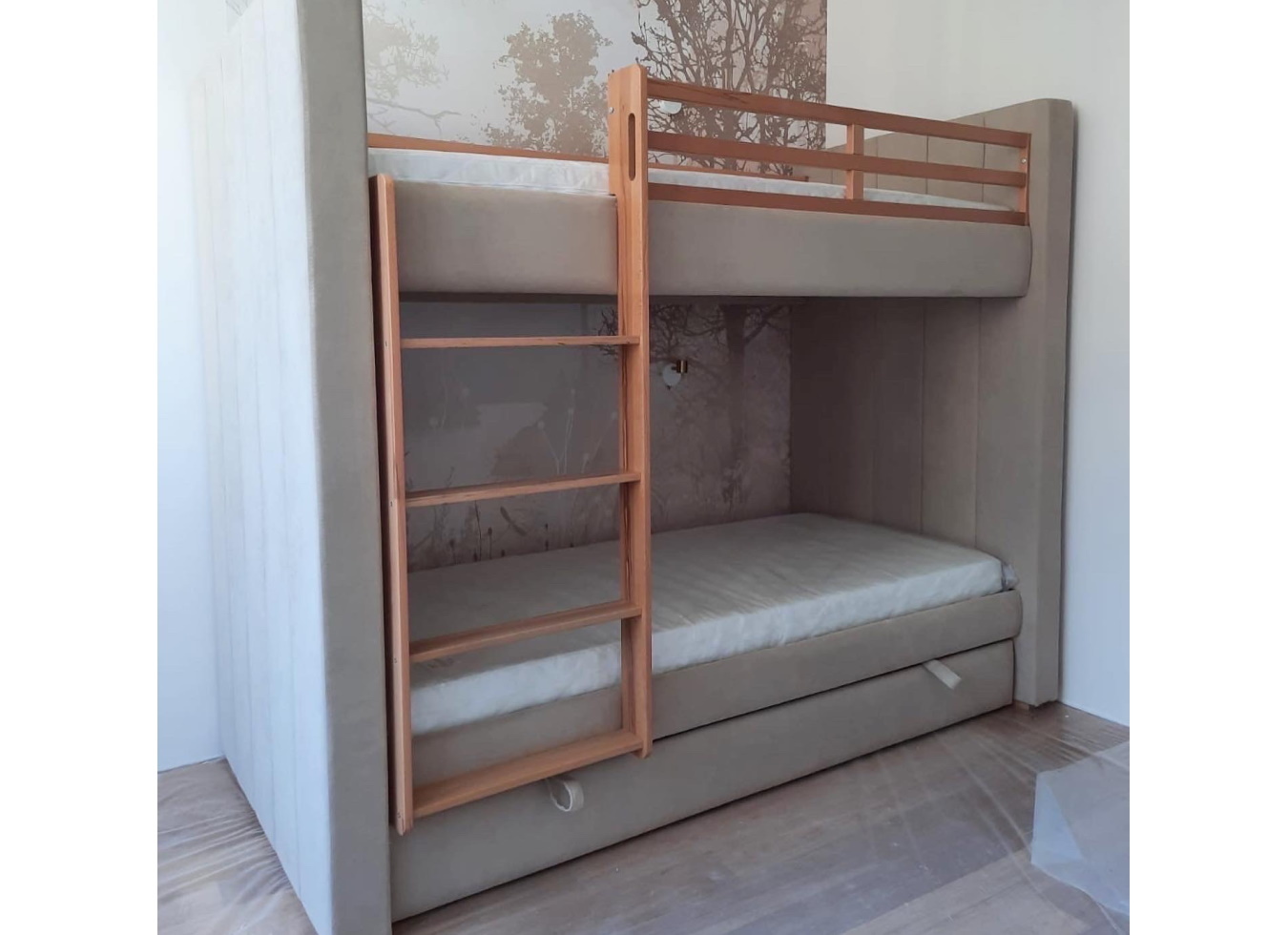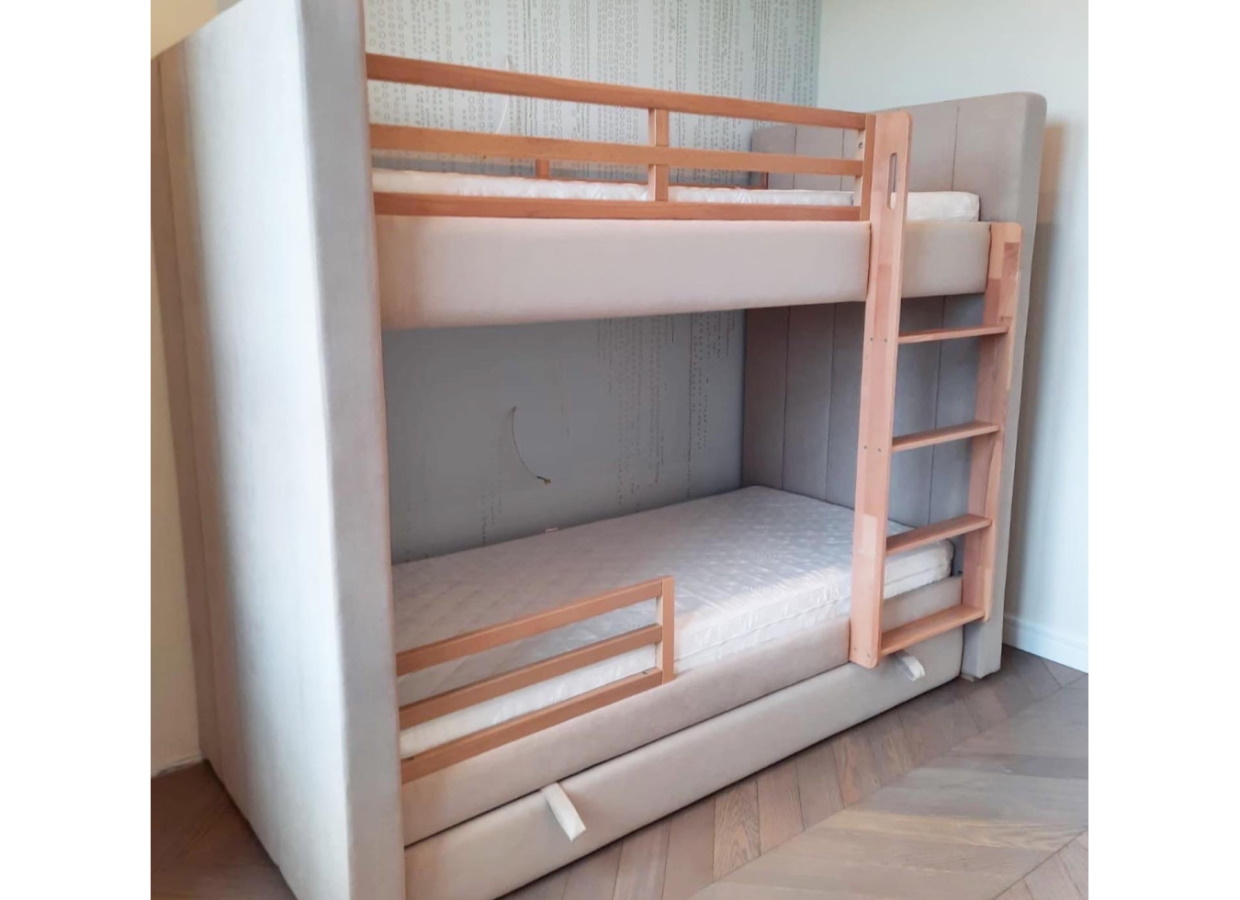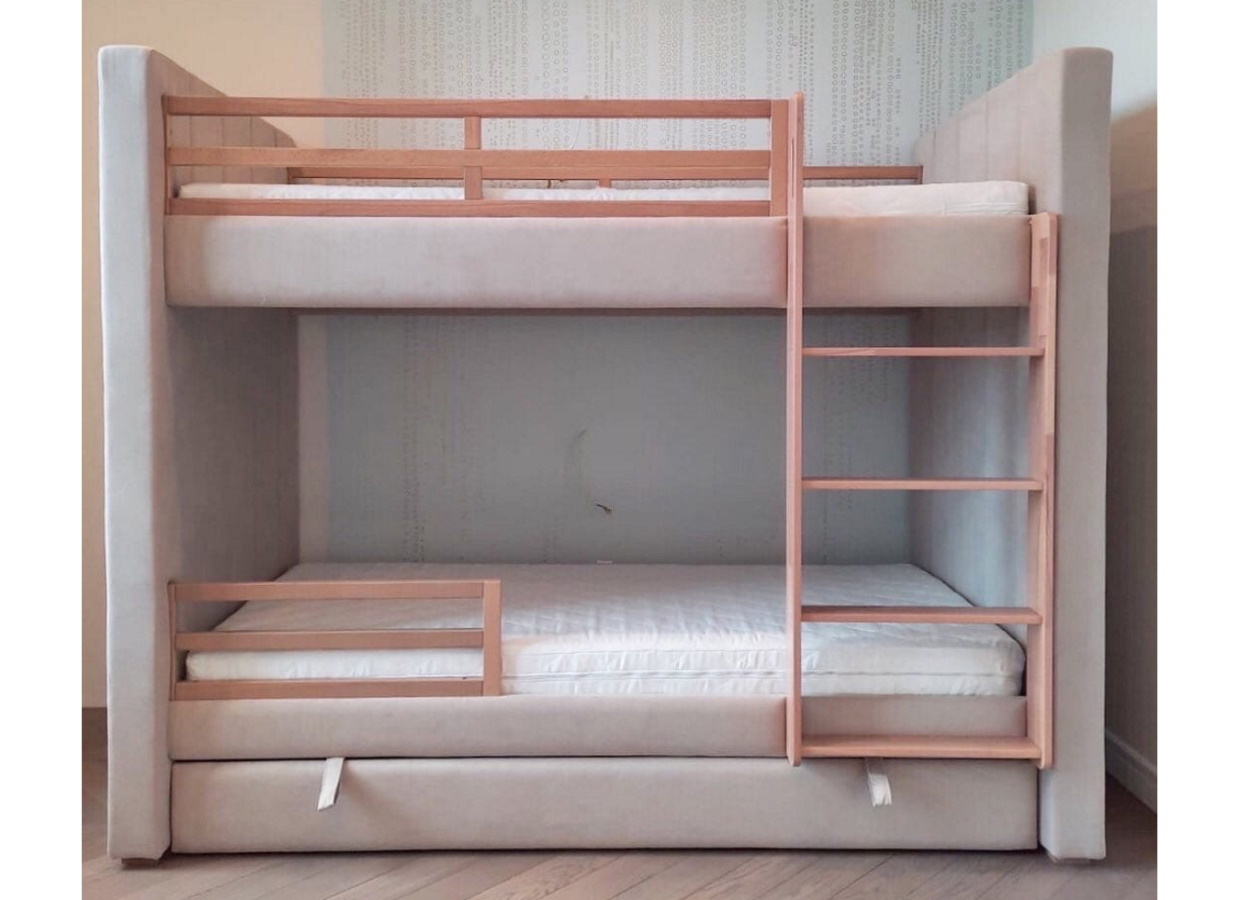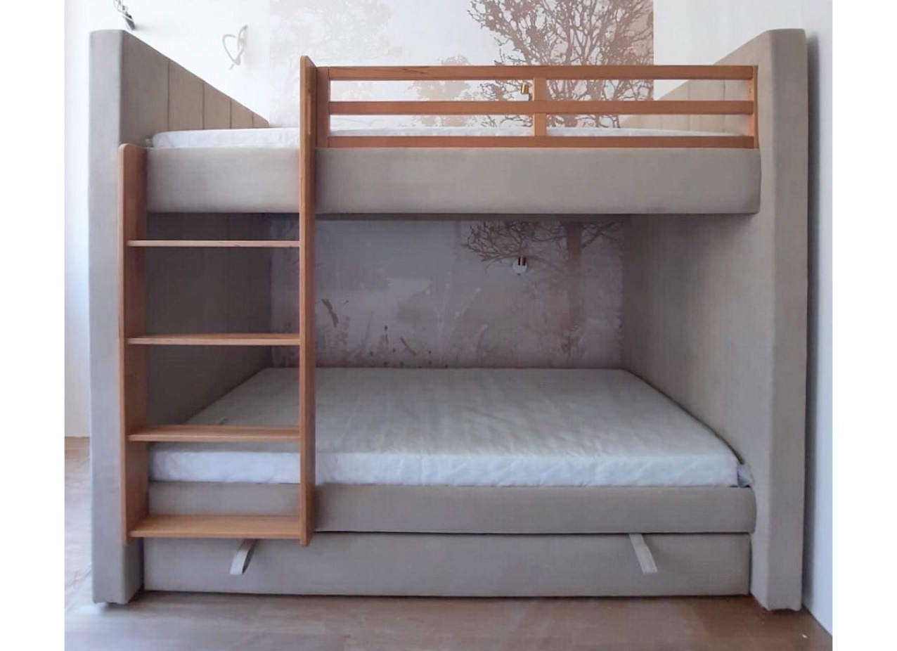 Мягкая уютная двухъярусная кровать Cosy может быть выполнена в различных цветах: бежевый, серый, розовый или голубой.