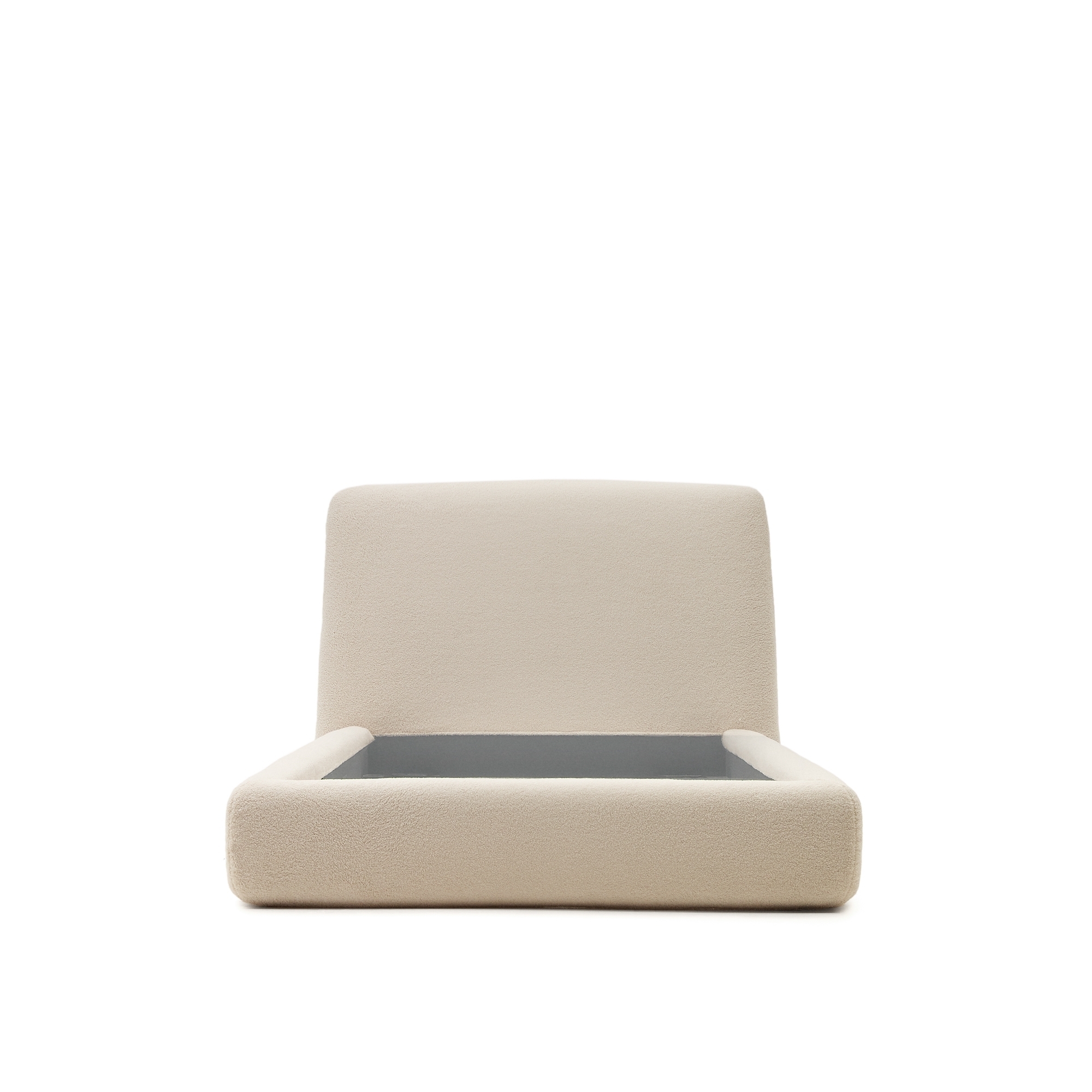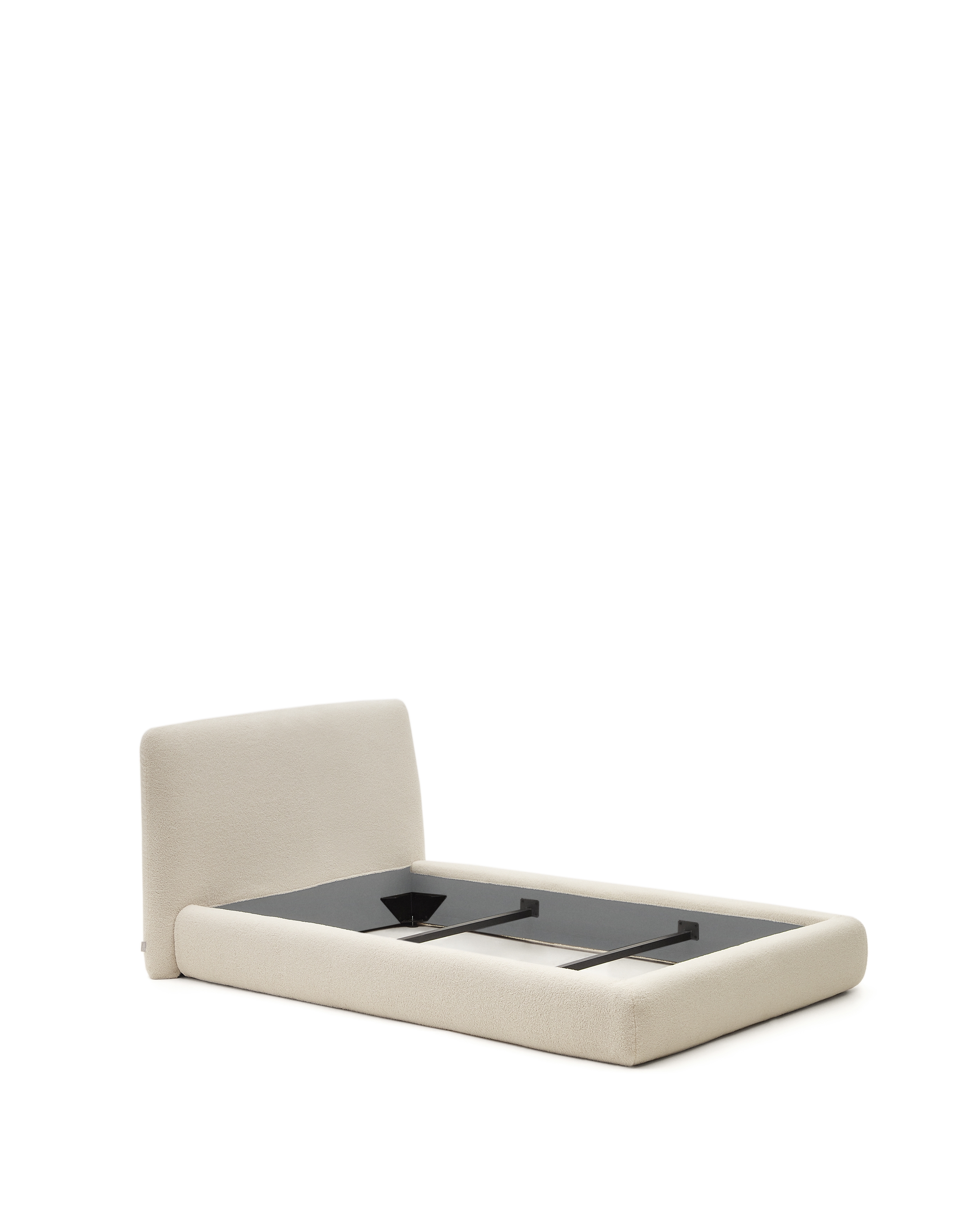 Кровать имеет деревянный каркас, который обтянут синтетической пеной и обшит мягкой обивочной тканью букле. Цвет материала серо-бежевый. Состав – 100% полиэстер. Обивка плотная прочная, легко чистится от загрязнений, гипоаллергенная.
