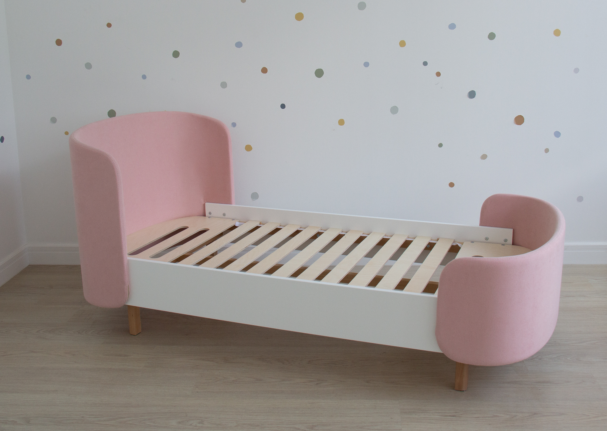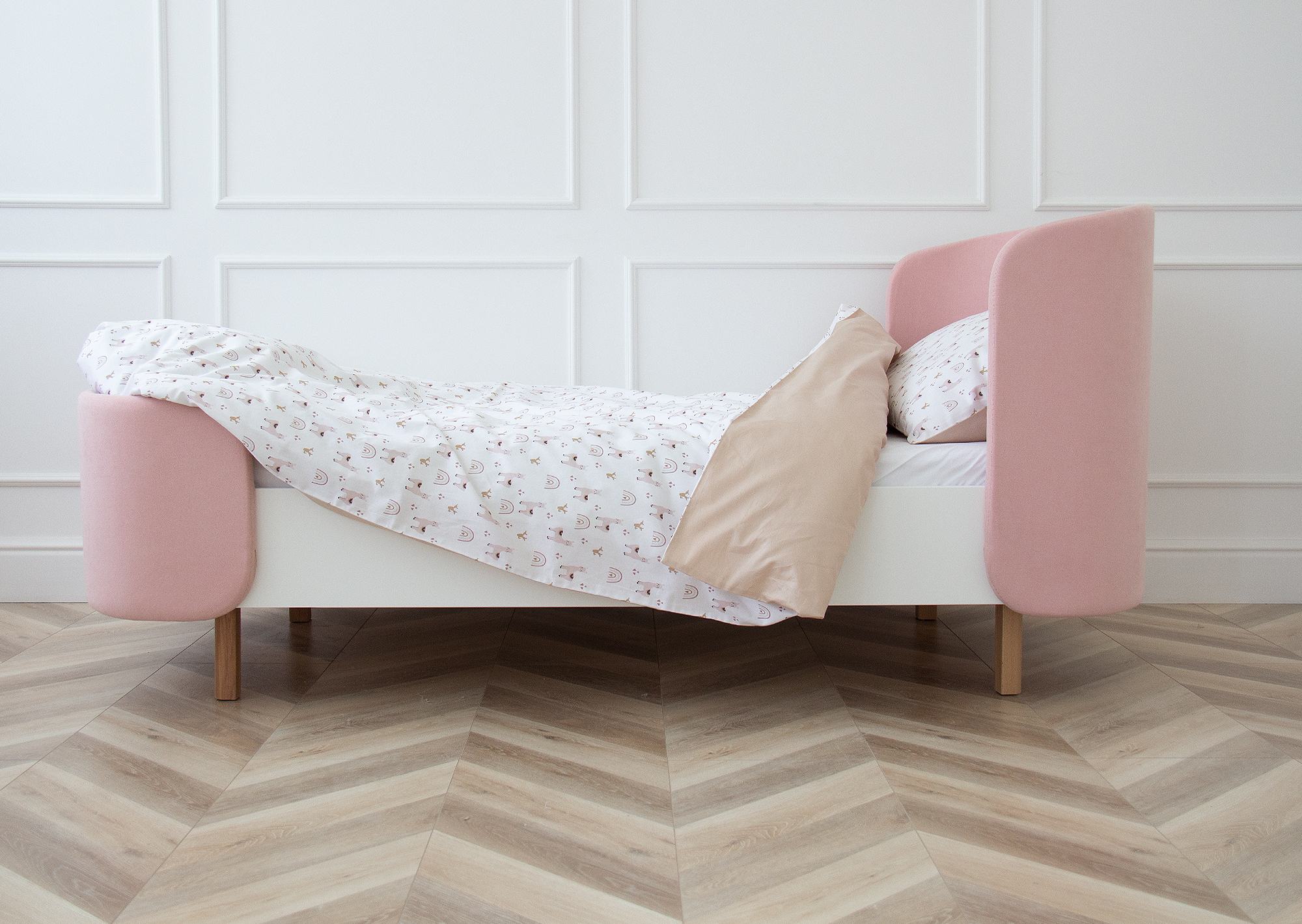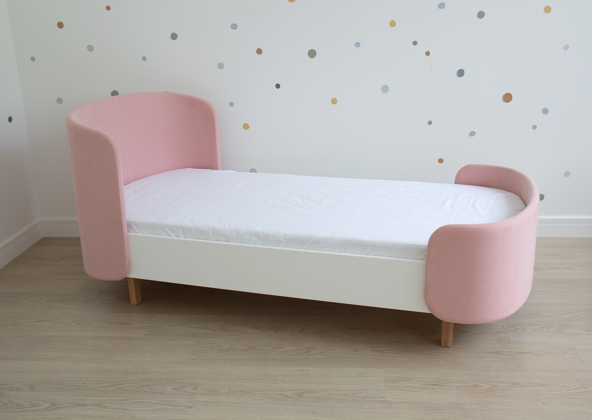 Закруглённые углы и мягкая приятная на ощупь обивка делают кровать уютной и безопасной.