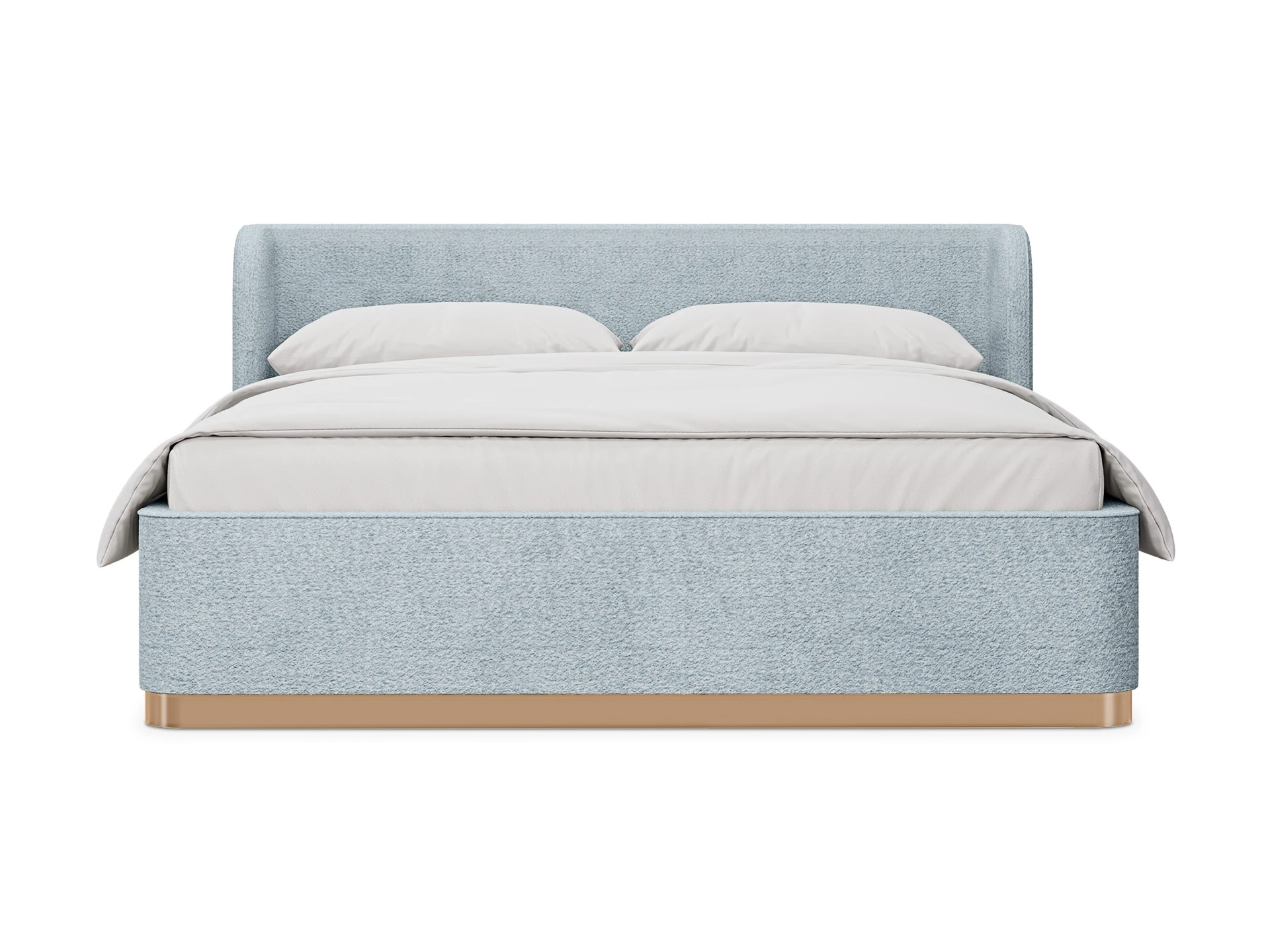 Кровать оснащена металлическим подъемным основанием с гибкими ламелями, под которым находится внутреннее отделение, предназначенное для хранения белья или других предметов. Спинка и царги кровати выполнены из плиты ЛДСтП т.22мм, брусков и березовой фанеры. Настилы из пенополиуретана и синтепона. Подиум сделан из плиты МДФ и брусков. Нижнюю часть подиума украшает металлическая лента из нержавеющей стали с покрытием «матовое золото». Дно бельевого ящика: плита ЛДСтП т.16мм «Белая Гладкая».